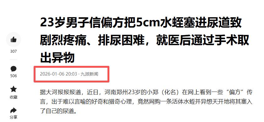 “太荒唐了!”河南一23岁男子轻信离奇偏方,竟将一条5厘米长的活水蛭塞入尿道。不料水蛭钻入膀胱吸血不放,导致他剧痛难忍、尿血不止,最终只能就医通过手术取出。网友:别拿身体试偏方!健康开不得这种“地狱玩笑”! “别动,再往里钻,膀胱就保不住了。”无影灯下,医生的声音让手术台上,23岁的小林浑身湿透,不是汗,是生理盐水冲洗下的颤抖。 只见一根纤细的内窥镜,正通过他无法闭合的尿道口探入,而显示屏上,一条深褐色、吸饱了血的活物,正牢牢吸附在他膀胱壁上,随着脉搏微微蠕动。 小林不是那种莽撞的人。他心思细,爱琢磨,最近他总觉得身体里藏着些“不对劲”。直到他被一条“体内淤毒,水蛭可吸,尿道入药,直抵病灶。”的热帖吸引后。突然冒起一个念头…… “试试总不会错吧?” 东西到货时,装在不起眼的透明塑料盒里。浴室门反锁,他做了三次深呼吸。真正动手时,手指抖得厉害。异物侵入的尖锐刺痛让他瞬间后悔,直到全部进入,他试图挤出一个如释重负的笑。 可平静只维持了不到十分钟。一种从未体验过的、被从内部啃噬的绞痛猛然袭来。瞬间他瘫倒在冰冷的瓷砖地上,眼前发黑,第一次清晰地感受到那个活物在自己体内的移动和吸附。 随后几天,他活在持续的、逐渐加剧的崩溃中。排尿变成酷刑,尿色从淡黄变成粉红,最后是刺目的鲜红。他蜷缩在宿舍床上,用玩游戏到天亮来逃避身体的抗议和去看医生的羞耻。 “妈,我可能…得了怪病。”电话里,他声音沙哑。 “胡说什么!年纪轻轻有什么病?多喝点热水!”母亲的责备从千里外传来,切断了他最后一点坦白的勇气。 直到他连腰都直不起来,被室友强行架到医院。急诊室里,他脸色死白,从牙缝里挤出一句:“有东西…进去了。”接诊的医生看了一眼,眉头瞬间拧紧,立刻安排了检查。影像结果出来,科室里经验最丰富的主任也倒吸一口凉气。 无影灯下的时间被拉得很长。手术并不复杂,但场面极具冲击。当那条长达五厘米、浑身沾满血沫的水蛭被钳子完整取出,放入弯盘发出“啪嗒”一声轻响时,所有在场的人都沉默了。 术后,身体上的伤口会愈合。但小林变得很沉默。他时常发呆,手机里那个论坛APP早已删除,可某些深夜,那种熟悉的、对于“身体不对劲”的隐忧,仍会幽灵般浮现。 医生查房时说得平淡却沉重:“每年都有,铁丝、钢珠、温度计…你们这些小伙子,到底在怕什么,又到底想证明什么?” 最后小编建议,如有类似立即停止任何操作,并第一时间前往正规医院就诊的同时, 必须向医生完全坦白异物情况,切勿因羞愧而隐瞒或自行处理。请牢记:健康不容侥幸,专业医疗是应对此类危急状况的唯一正确途径。 只能说,这个故事里没有赢家。一条荒诞的偏方,捕获了一个被虚无恐惧困扰的年轻人。它暴露的不是知识的匮乏,而是在信息轰鸣时代,内心那一片悄然蔓延的、名为“不确定”的荒原。 我们对抗疾病,更对抗对未知的恐惧,而后者常常引诱我们,走向更黑暗的歧路。那声弯盘里的轻响,是他一个人的警钟,却也敲给我们所有人听。 对此您怎么看?欢迎大家到下方评论区留言共同讨论。 奇葩治愈不开心搞笑 信息来源: 红星新闻2026.1.6|《23岁男子信偏方把5cm水蛭塞进尿道致剧烈疼痛、排尿困难,就医后通过手术取出异物,医生提醒》 文|沐琨 编辑|南风意史