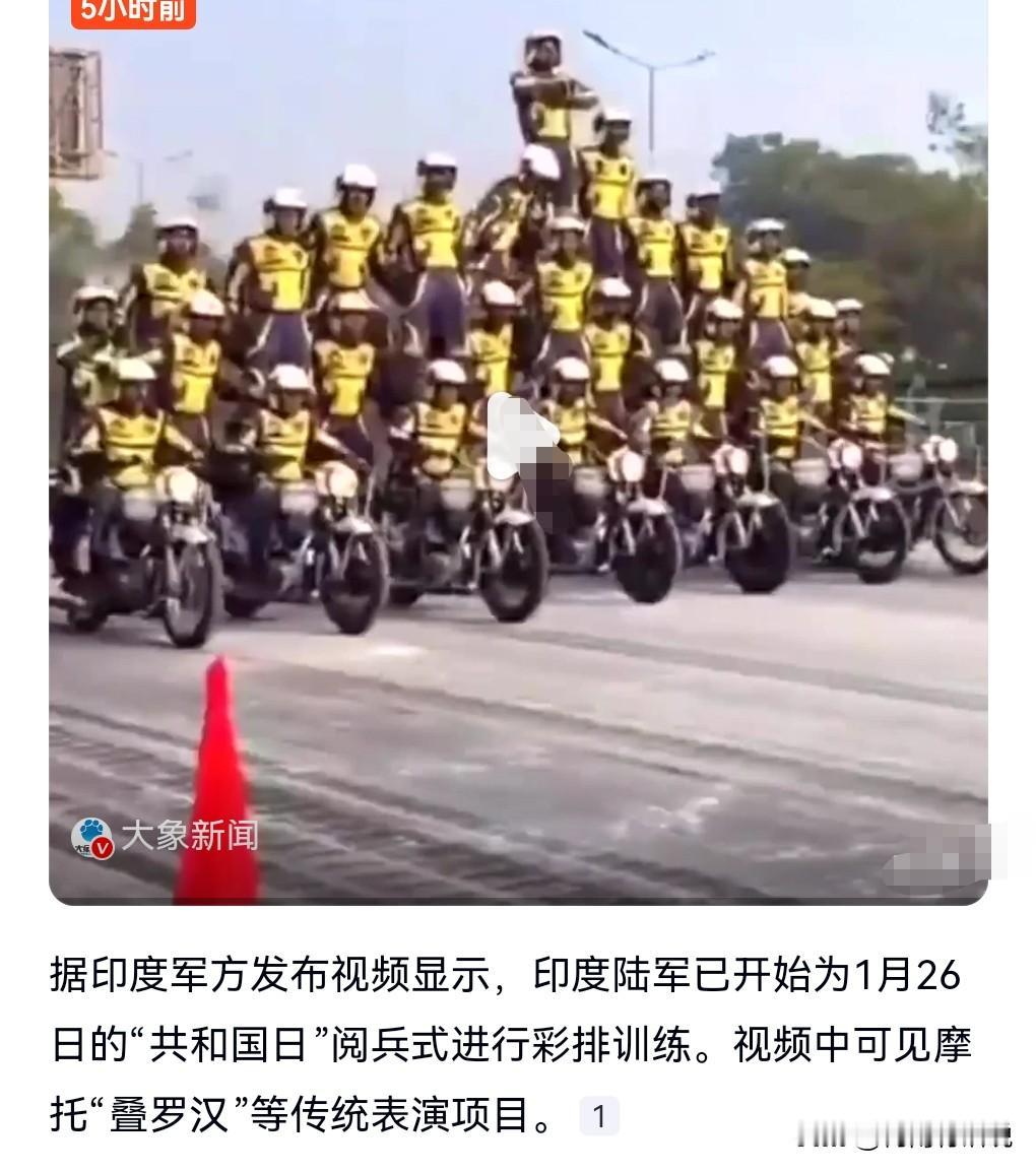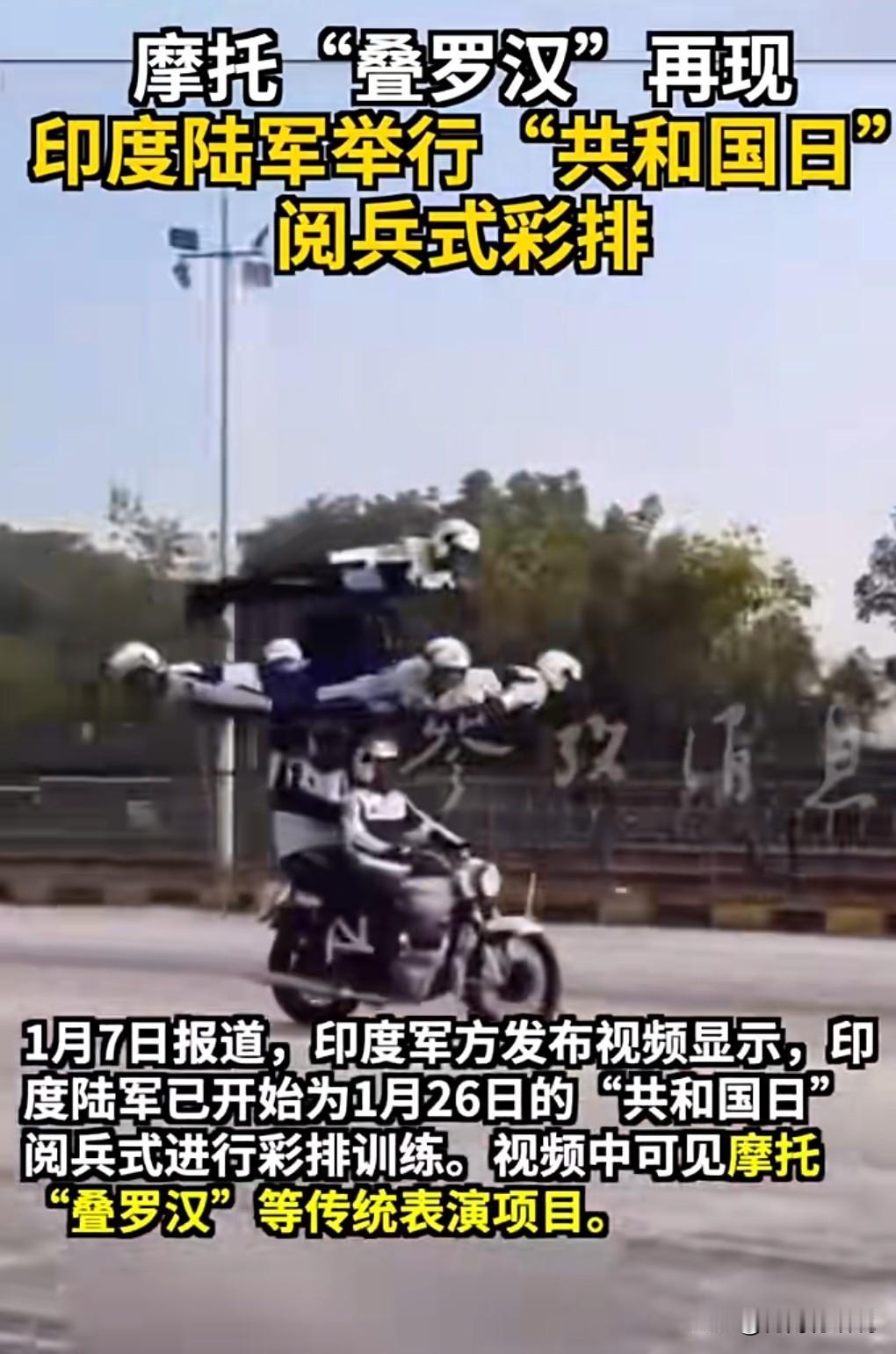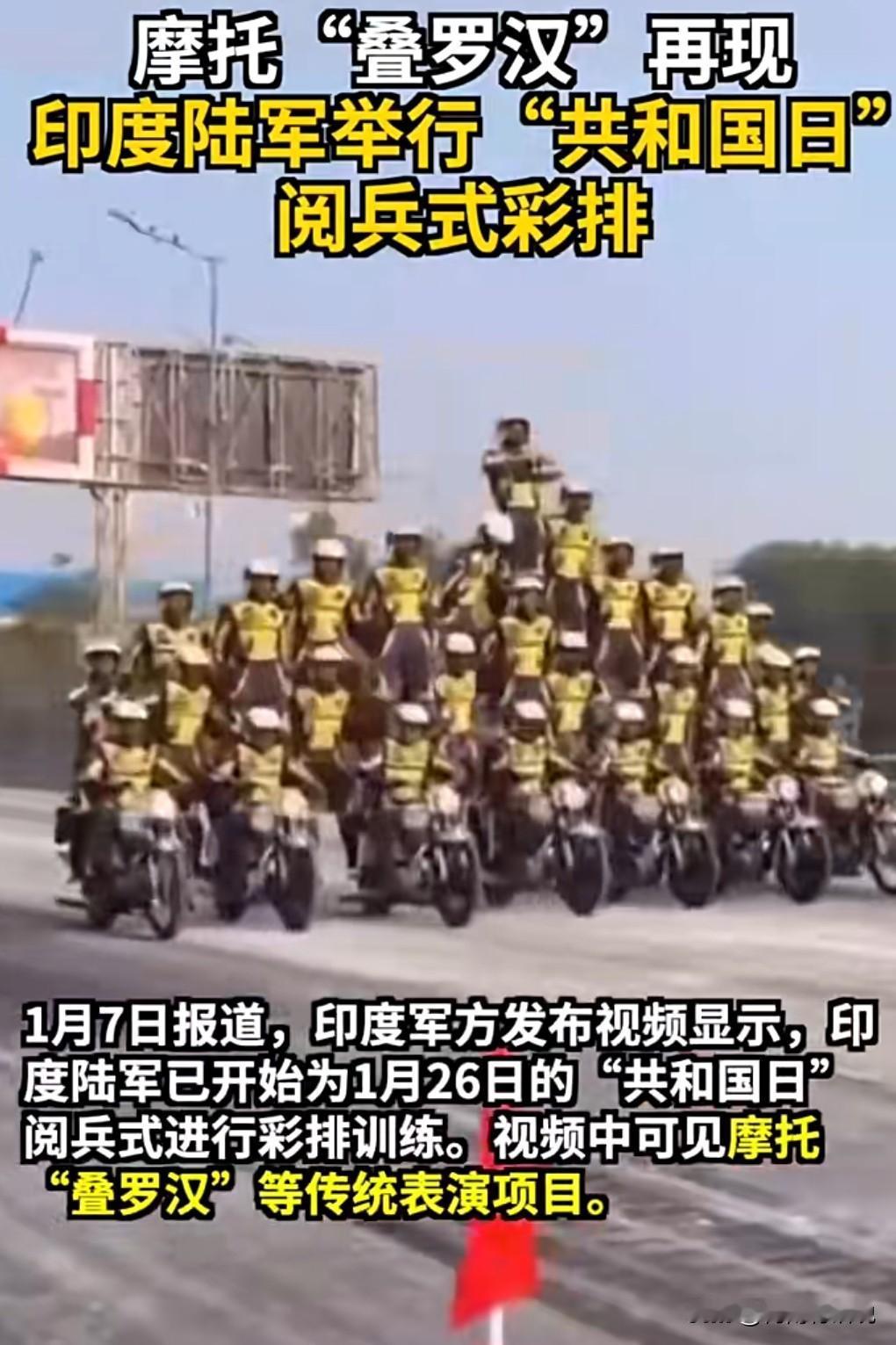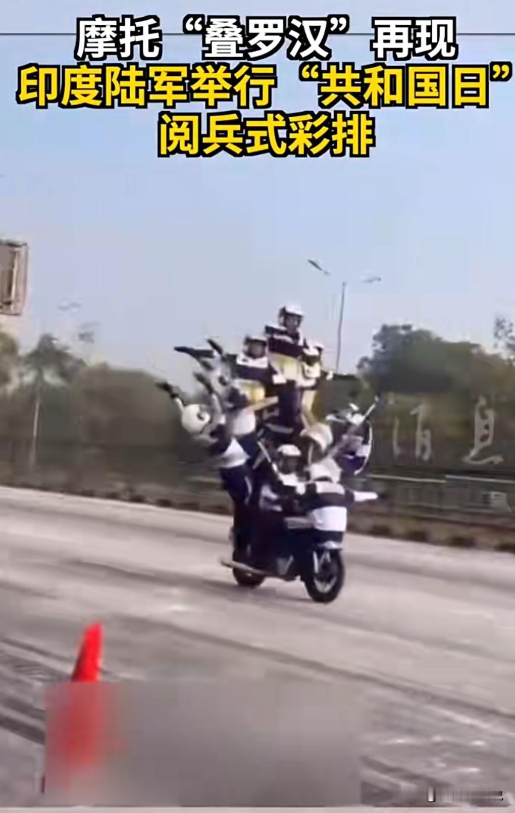 印度可真是一个奇葩的国家呀,怎么老是喜欢危险驾驶呢? 这技术含量很高啊。 1月7日报道,印度阅兵彩排又见摩托“叠罗汉”。 第1张图,这真的是太震撼了,那么多摩托车叠那么高。 阿三哥果然是有两把刷子啊。 感觉走错场了,这应该去表演杂技,不应该是阅兵的项目。 不过观赏性还是有的。 不出事还好,出事就悲剧了。