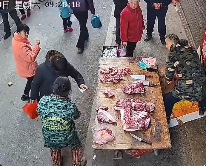 农贸市场偷肉的老妇女,手法真高,可是今天运气不好被老板娘发现了。这个穿着黑衣服,带着口罩的女子,在肉摊边徘徊,趁老板在砍骨头的空档,走到肉案边,用一个口袋罩着一块肉,迅雷不及掩耳的速度把肉藏起来准备拿走,这时老板娘一个箭步冲出来,一把抓住了黑衣妇女,女子情绪激动,似乎受了委屈一样。大妈偷菜 偷东西的妹子 大姐偷东西 菜场偷肉