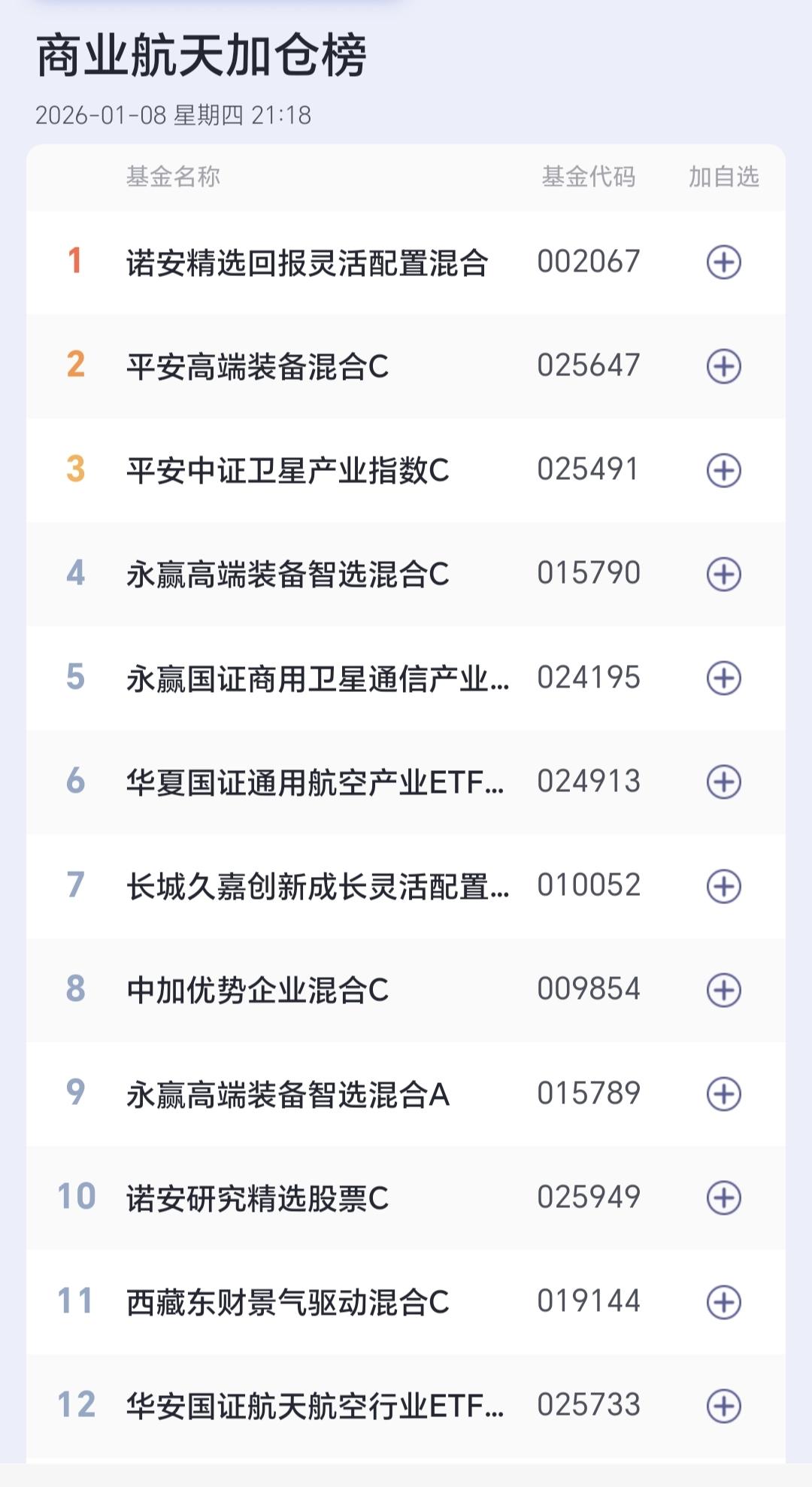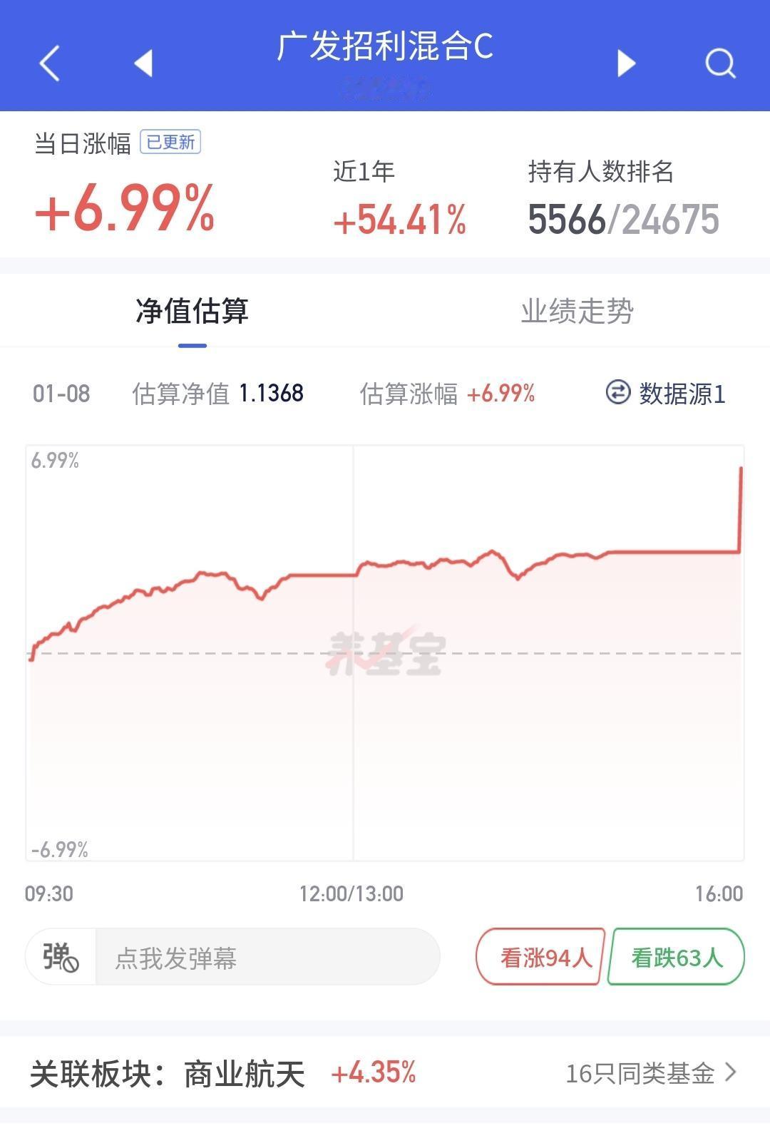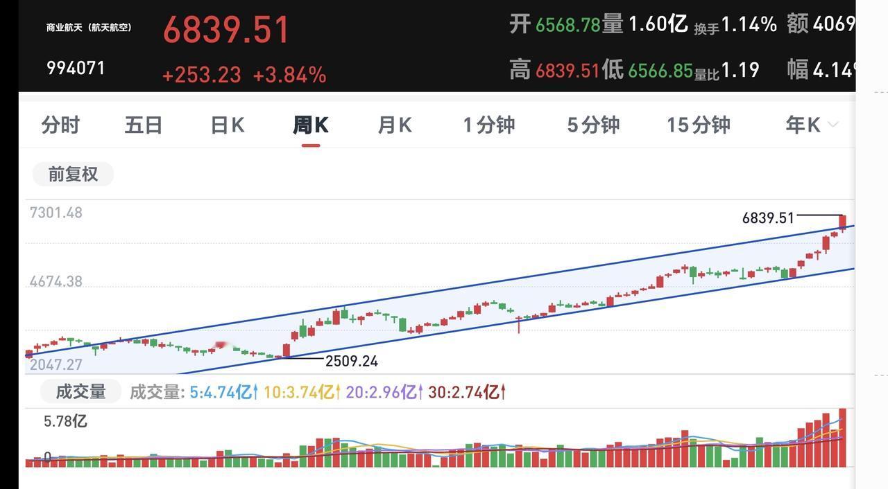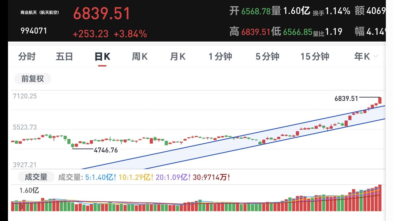 基金:这只基金今天大涨了6.99% 欧洲市场今天下跌,法国下跌了0.28%,英国下跌了0.29%,德国下跌了0.29%,下跌幅度都不大。 香港市场今天也是下跌,恒生指数下跌了1.17%,国企指数下跌了1.09%,恒生科技指数下跌了1.05%,下跌幅度都超过了1%以上。 图3是今天基金的加仓排行榜,图4是今天基金的减仓排行榜,图5是今天基金的持有人数飙升榜,图6是今天基金的加仓人数和减仓人数,今天加仓66054183人,今天减仓22030320人,今天加仓人数超过了减仓人数。 持有的基金中,今天晚上净值全部更新上涨幅度最大的三个板块是:军工板块,先进制造板块,芯片半导体板块,下跌幅度最大的三个板块是:证券板块,新能源汽车板块,上证50板块,净值整体亏损了6419元。 所有的基金中,今天上涨幅度最大的三只基金是:广发招利混合,平安高端装备混合,平安中证卫星产业。 广发招利混合今天大涨了6.99%,属于商业航天板块,板块上涨了4.35%这个板块今天加仓排行榜见下面的截图12,持有人数排行榜见下面的截图13,加仓人数最多的是诺安精选回报灵活配置,持有人数最多的是永赢高端装备智选混合。 我们来看一下下面的截图14,这是商业航天板块日K线图,从图中可以看出,我画了两条倾斜向上的斜线,这是商业航天板块日线级别上涨通道,星期一的时候,上涨突破了这个上涨通道的上轨,也就是说,这个板块有可能在走加速走势。 我们来看一下下面的截图15,这是商业航天板块周K线图,从图中可以看出,我画了两条倾斜向上的斜线,这是商业航天板块周线级别上涨通道,本周的上涨突破了这个上涨通道的上轨,也就是说,商业航天板块周线也有可能在走加速走势。 我每天都会分享我的观点,我的观点只代表我个人的看法,不能作为你操作的依据,据此操作后果自负,谢谢大家的评论点赞和支持。