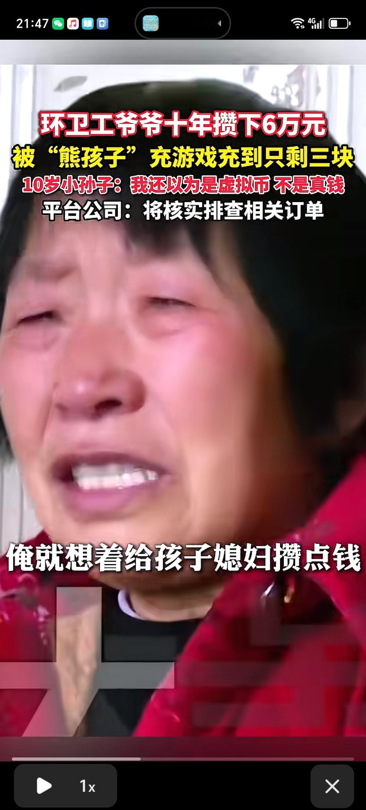 环卫工爷爷攒了10年才攒下了6万块钱养老钱,被10岁小孙子在《和平精英》买了160多次皮肤装备,给花的就剩3块钱了,奶奶得知后当场气晕过去了。奶奶表示想给孩子娶媳妇攒点钱,弄个钱多不容易啊! 2026年1月,河南新密的环卫工朱大爷十年攒下的6万块钱积蓄,被10岁孙子在过去5个月里通过玩游戏充值花光,银行卡最终只剩3块钱。 孙子偷偷将自己小天才电话手表的卡插入爷爷的闲置手机,再按陌生链接接引,“疯狂氪金”,为游戏购买枪械、车皮肤等道具,先后充值超160次。 孙子说自己以为充值花的是虚拟币,不知道自己花的是真钱,花到最后,爷爷银行卡里的6万块钱只剩下3块。涉事游戏平台表示会核实排查相关订单。
