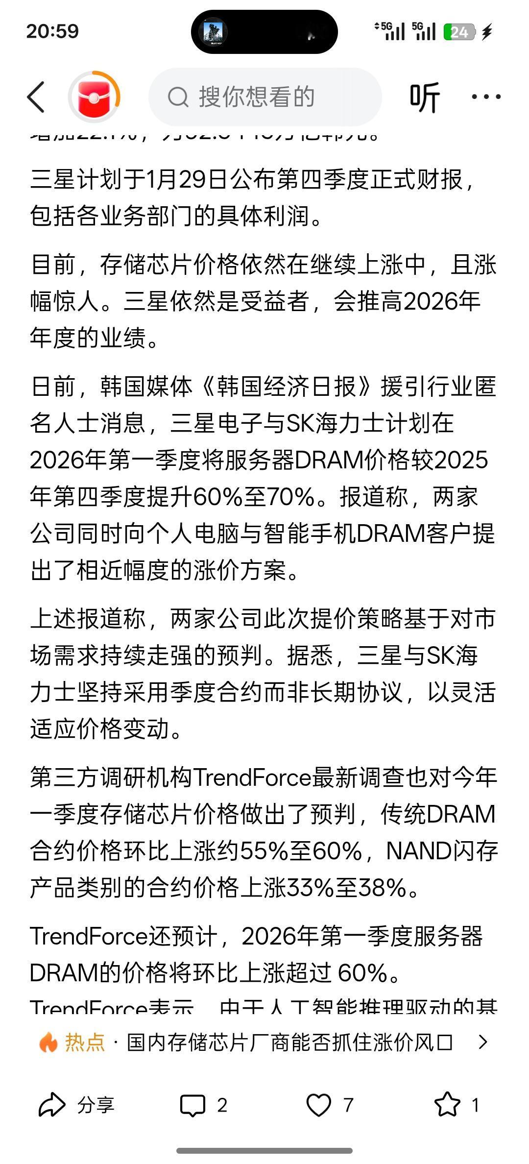 存储芯片价格狂飙!三星电子第四季度营业利润首超20万亿韩元,同比增长两倍,这个储存芯片利润增长真的有点超乎想象!三星全球三大存储芯片运营商之一!根据存储芯片的需求量,三星的利润大幅增长,而且26年的价格还在继续上涨,那么利润增长还要持续! 2026年存储芯片依然是主线逻辑的发展,内存条的价格也在上涨!2026年依然是可以期待的一个年份!消费电子产品的价格可能也会上涨!国内的存储芯片也会因此出现价格的波动上涨