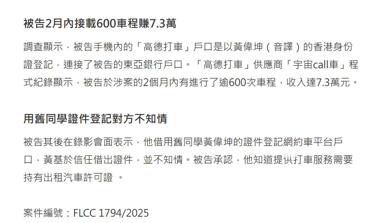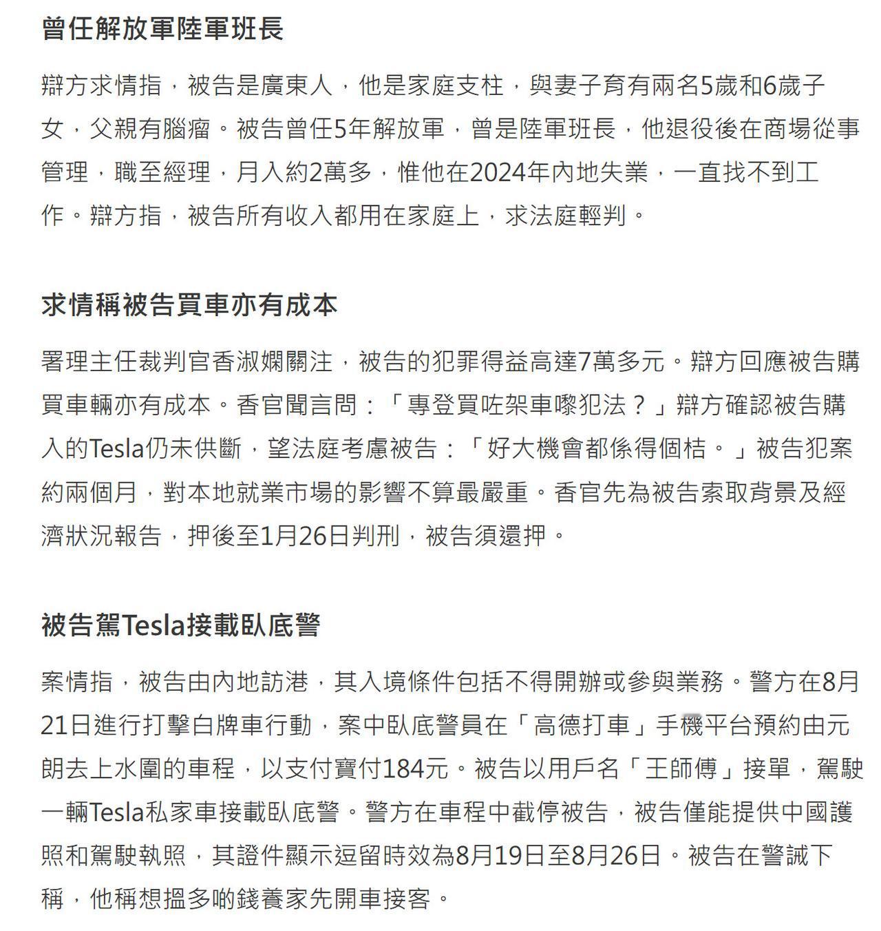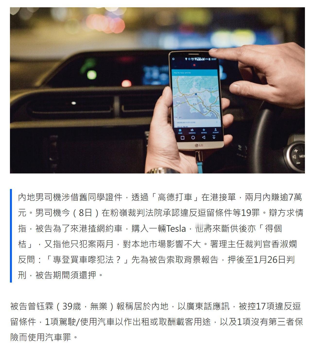 39岁广东男子在香港开黑车,两月赚了7.3万,结果被香港警察的钓鱼执法给抓了。男子曾某是广东人,有一辆两地牌的特斯拉,失业了,内地网约车饱和,挣不到钱,听说香港打车贵,于是就借香港朋友的身份,注册了网约车,在香港跑网约车生意。两个月时间流水高达7.3万,本以为找到了好营生,没想到却被香港卧底警察识破。港澳司机 粤港跨境专车