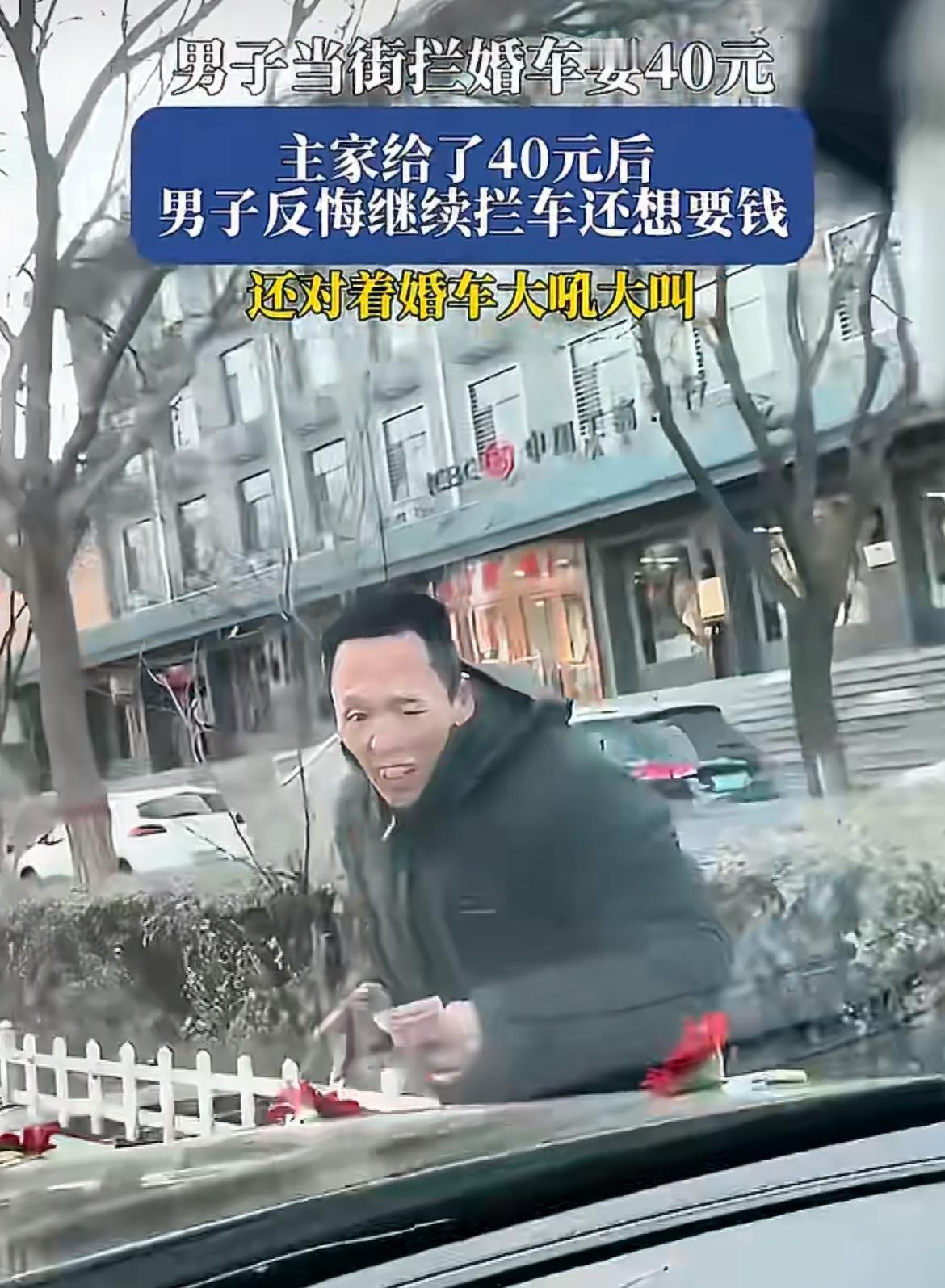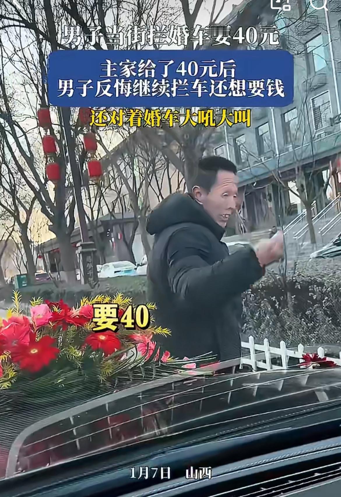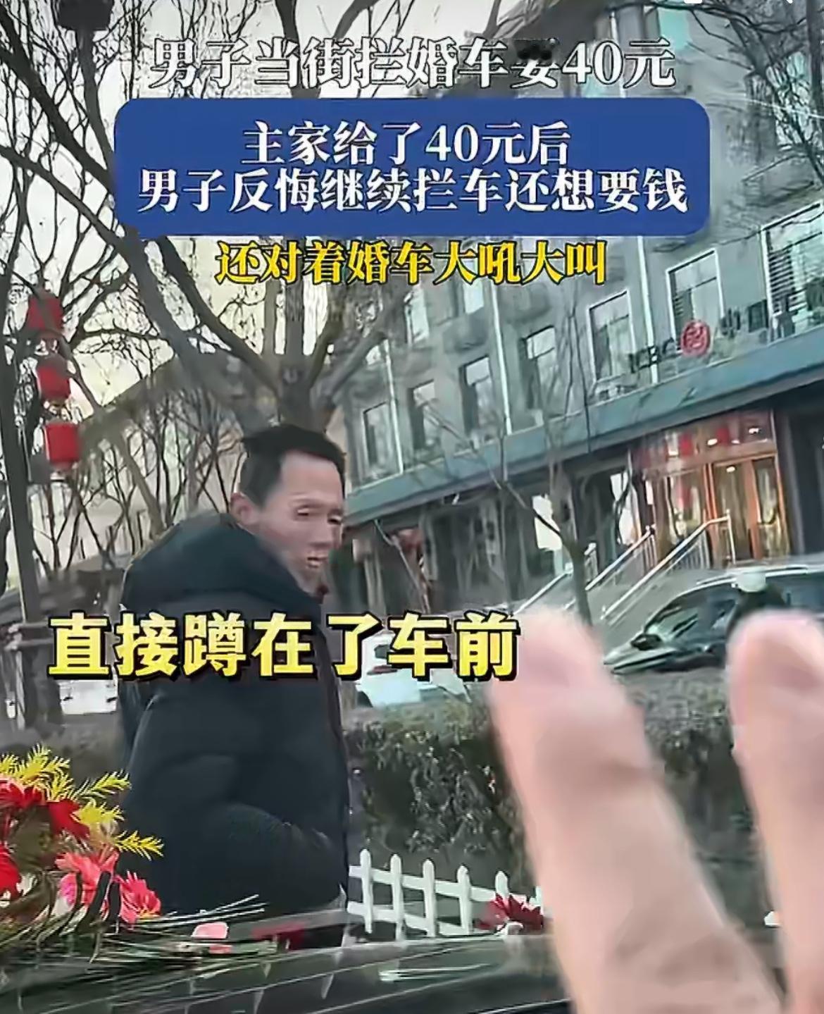 山西有这么不要脸的吗?老仙男拦婚车,主家爽快给了40块,男子接到钱就反悔了,还想继续要,不给就蹲在车前,不让走。可能是看主家给钱利索,觉得好说话,还有油水可以捞。让他走开,他还生气了,急吼吼的,似乎得罪他了。主家也不惯着他,直接一把把他拉开了。农村拦婚车 马路上拦婚车
