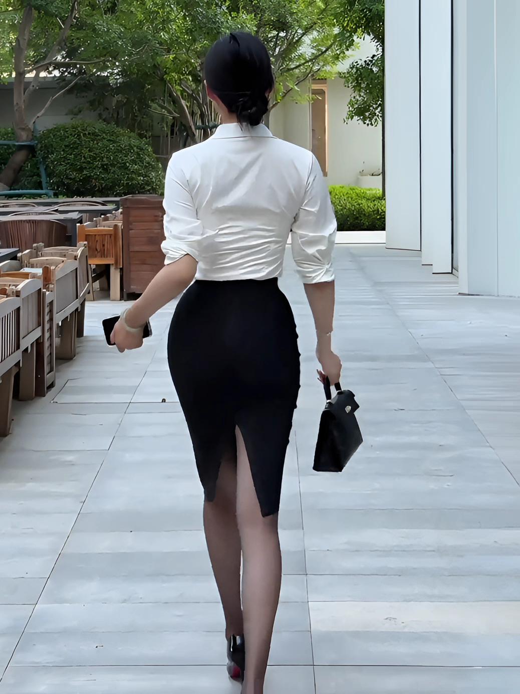 法式轻职风,通勤白衬衫后开叉包臀半裙气质套装。 穿搭基础,气质为主。 选对、穿对,就能穿出不一样的气质,不一样的感觉!白色衬衫套装裙 高级感衬衣裙 法式衬衫套装裙 气质穿搭怎么穿才恰到好处? 职业装