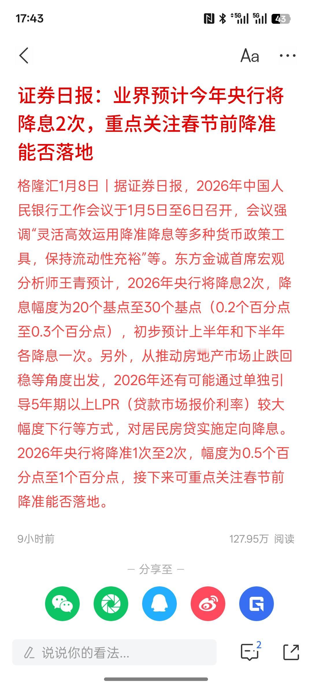 利好消息,证券日报:业界预计今年央行将降息2次,重点关注春节前降准能否落地!关于降准降息之前就已经有逾期了。根据外媒公布,中国今年会降准降息!存款准备金也会被降!有足够的流动性资金!那市场大概率后续还会继续上涨!春节前市场的行情走势就是上涨趋势!目前,两会即将召开,那么对2026年的工作会议应该有很大的启示作用!