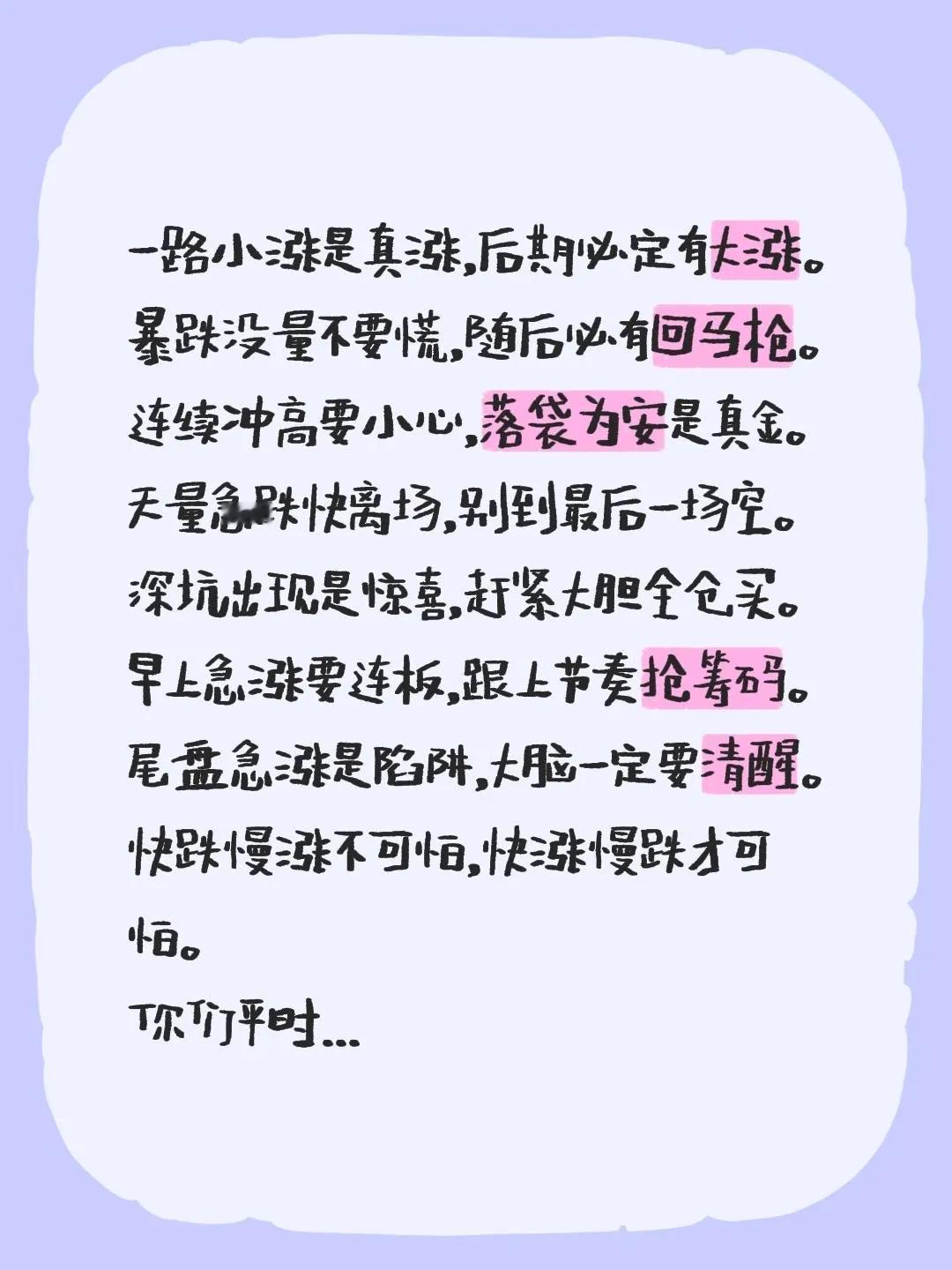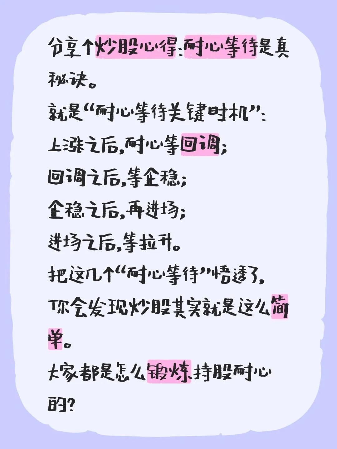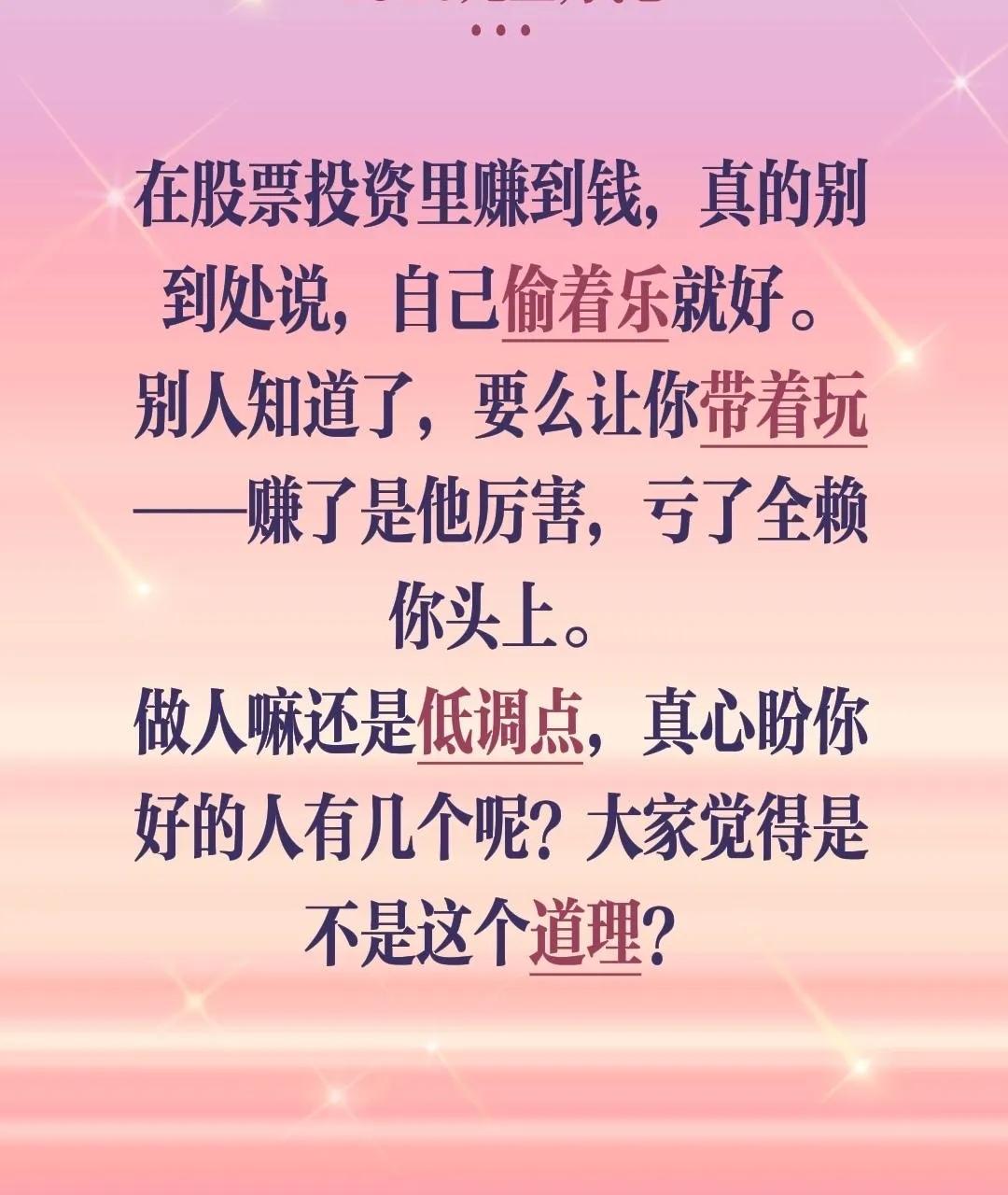 股票投资个人心得 1. 投资心态与为人处事:赚钱后保持低调,避免因炫耀引发人际关系矛盾;真正盼你好的人不多。 2. 操作纪律与耐心:强调“耐心等待”是关键——等回调、等企稳、等进场时机、等拉升;涨不贪、跌不慌,稳步执行策略。 3. 市场规律与赚钱逻辑:风险是涨出来的,机会是跌出来的;通过高抛低吸、攒股、做T等手法实现盈利;理想状态是以投资为生,低调赚钱,不问出身。