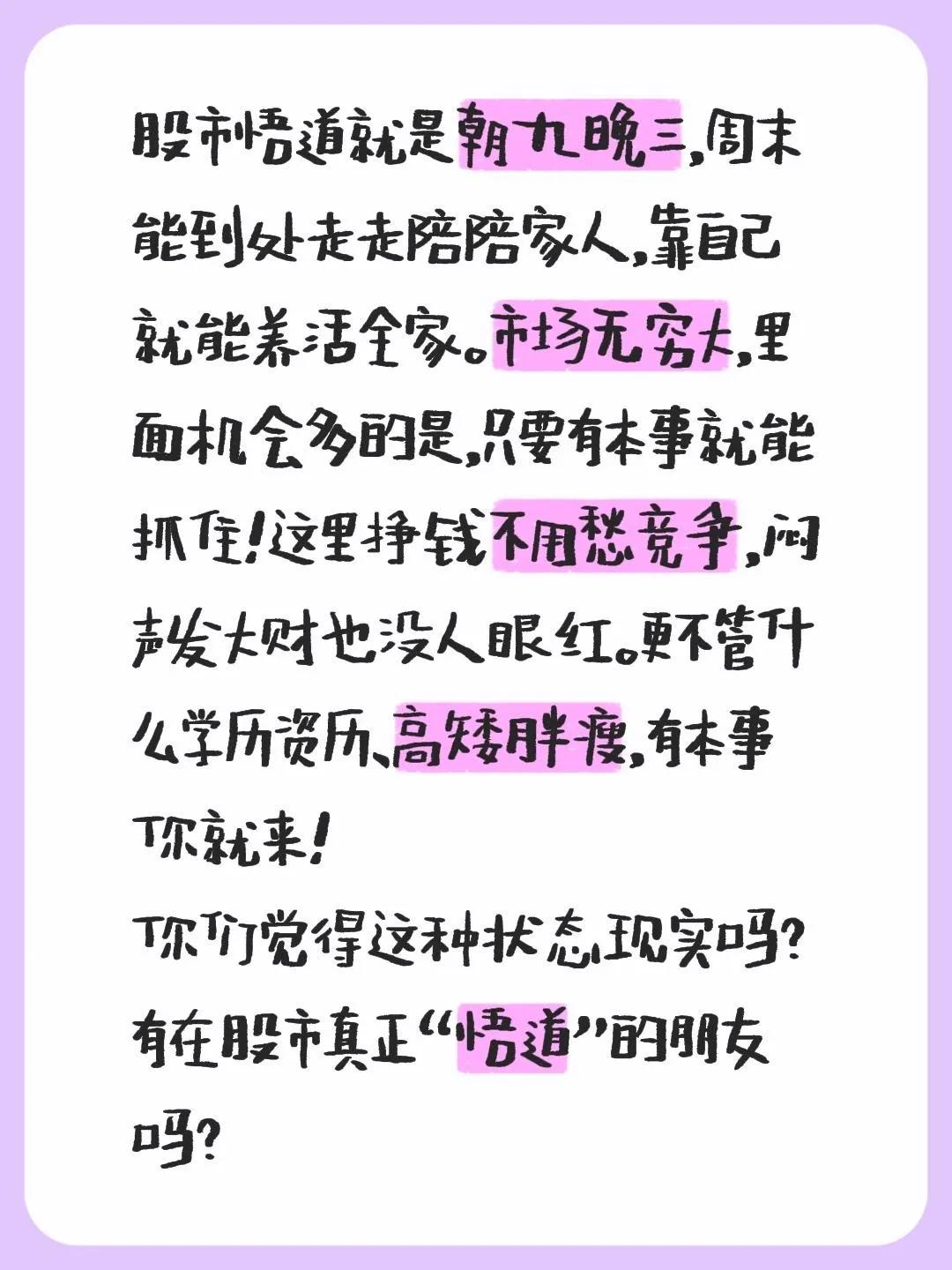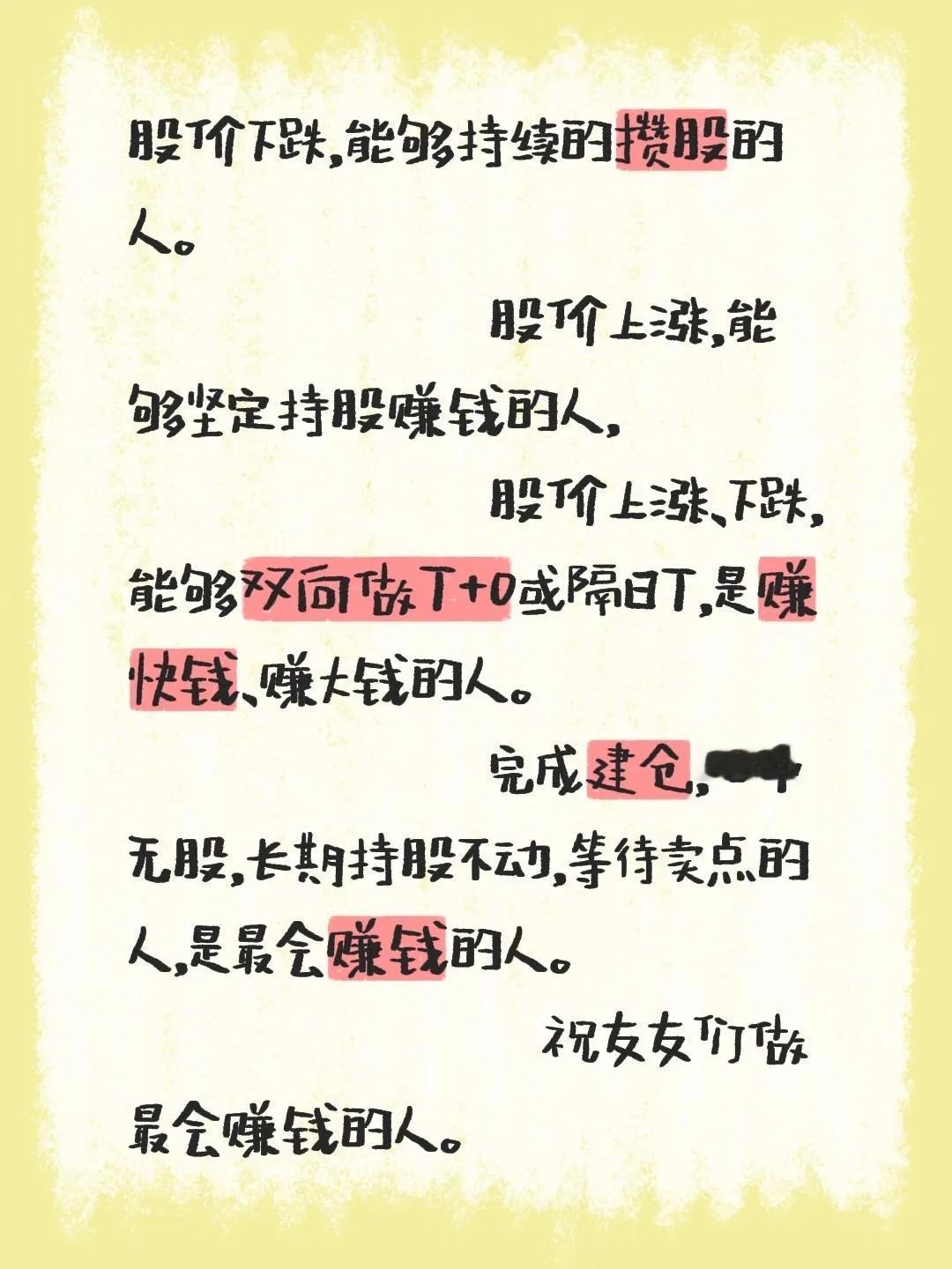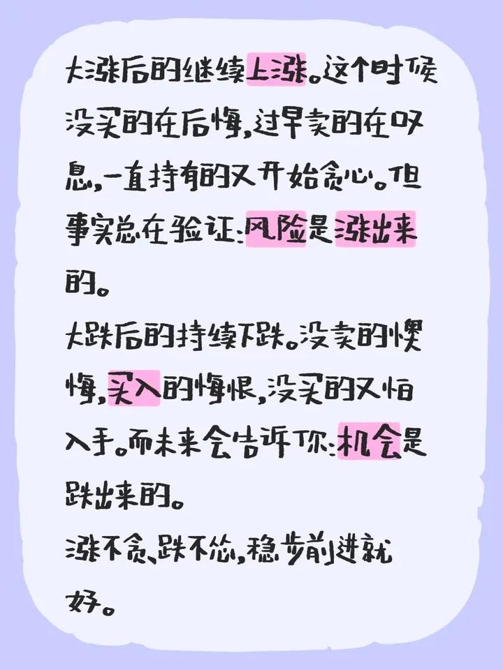 股票投资个人心得 1. 投资心态与为人处事:赚钱后保持低调,避免因炫耀引发人际关系矛盾;真正盼你好的人不多。 2. 操作纪律与耐心:强调“耐心等待”是关键——等回调、等企稳、等进场时机、等拉升;涨不贪、跌不慌,稳步执行策略。 3. 市场规律与赚钱逻辑:风险是涨出来的,机会是跌出来的;通过高抛低吸、攒股、做T等手法实现盈利;理想状态是以投资为生,低调赚钱,不问出身。