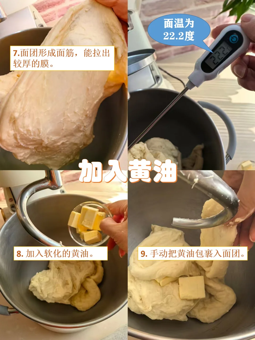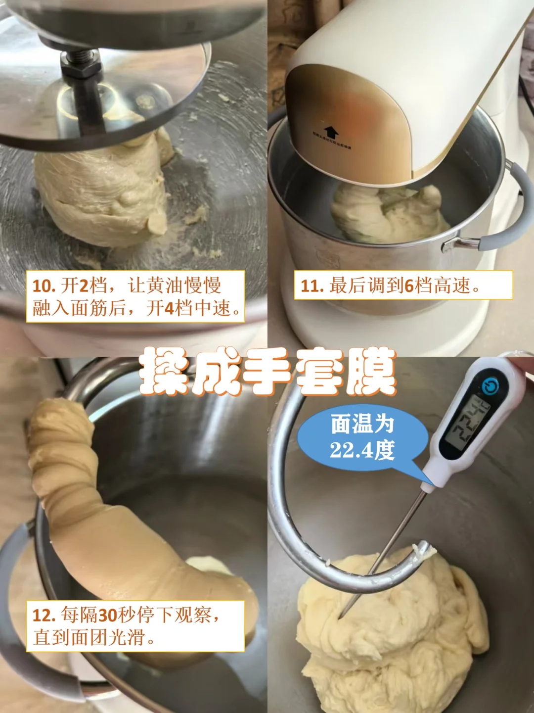 [三R]确保面温在30度以下,防止酵母提前发酵。选择功率大的厨师机,减少揉面时间,时间长,机器升温就高。我用的柏翠Q7因为功率大,而且有风扇可以降温,出手套膜只用了11分钟,全程测温都在23度以下。