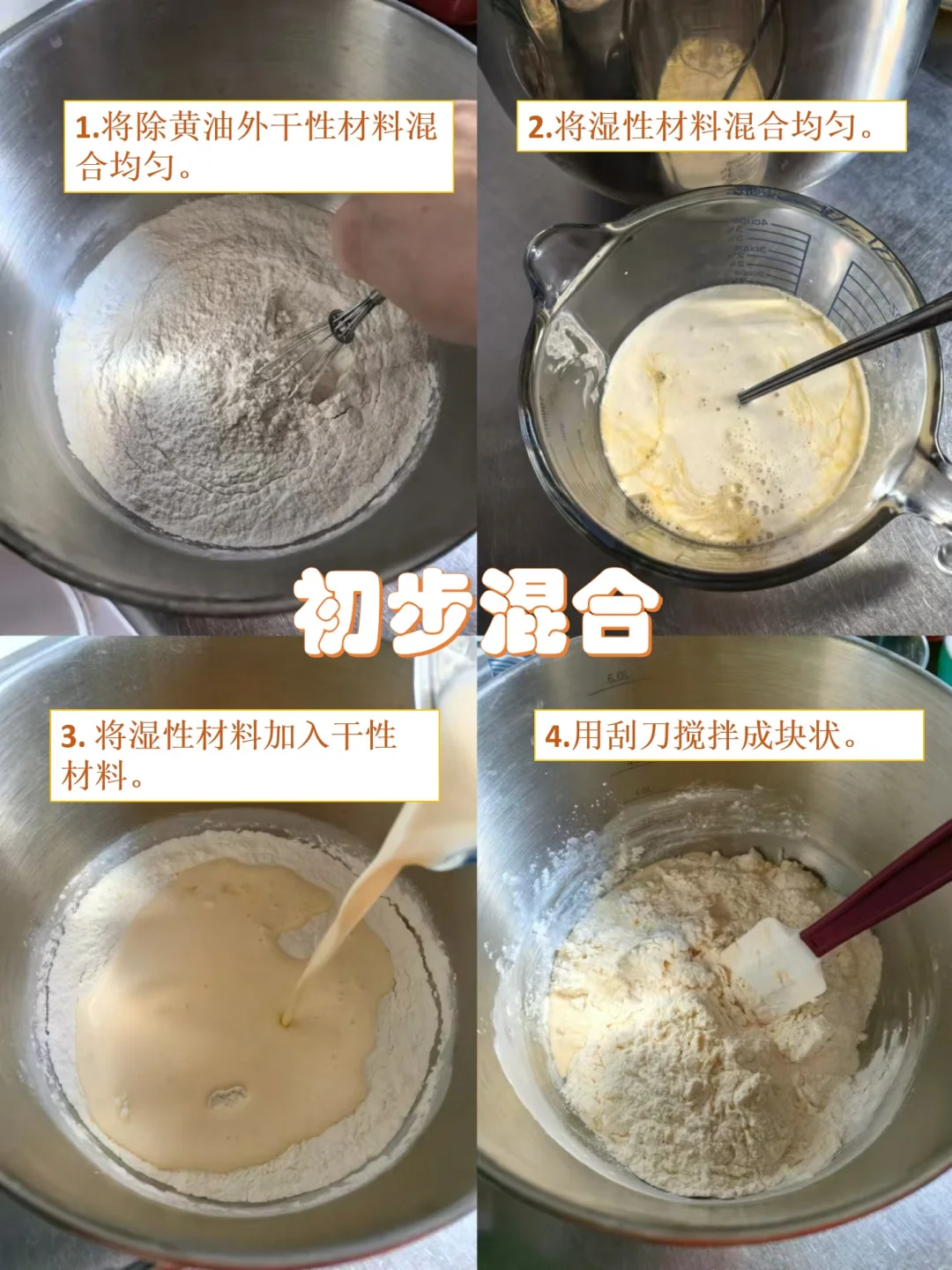 提前将干性材料和湿性材料手动搅拌均匀,可以大大缩减厨师机的工作时间,这一步手动不费力且非常快,而厨师机却要花很多时间来完成混合,这个小窍门一般人我不告诉哦!