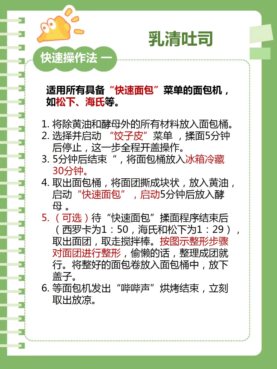 松下、海氏等面包机有“快速面包”菜单,建议使用快速操作法一。