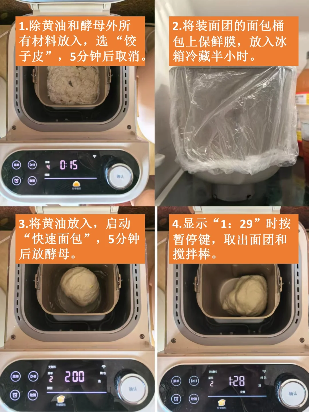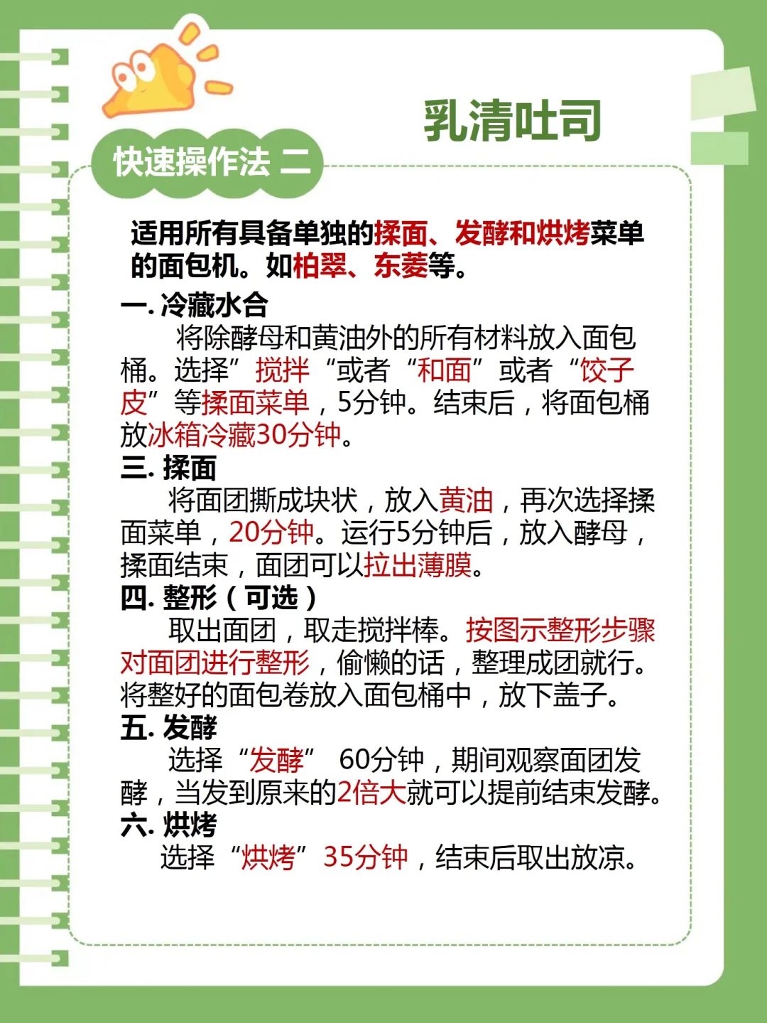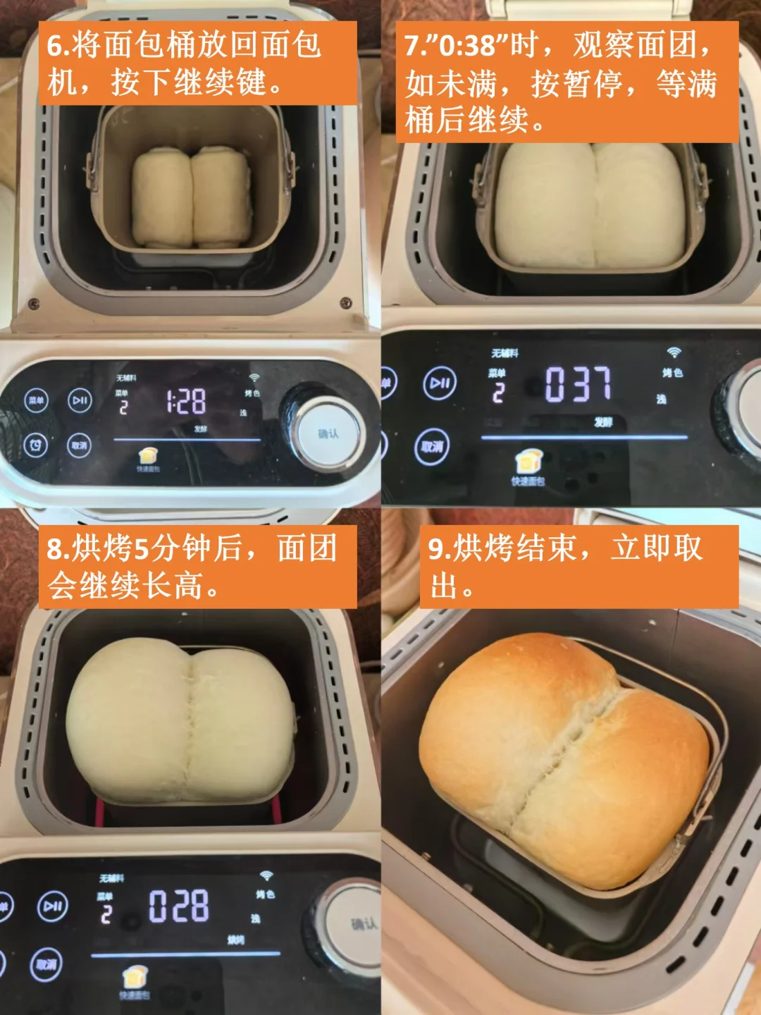 柏翠、东菱等面包机有独立揉面、发酵、烘烤的菜单键的,建议使用快速操作法二。
