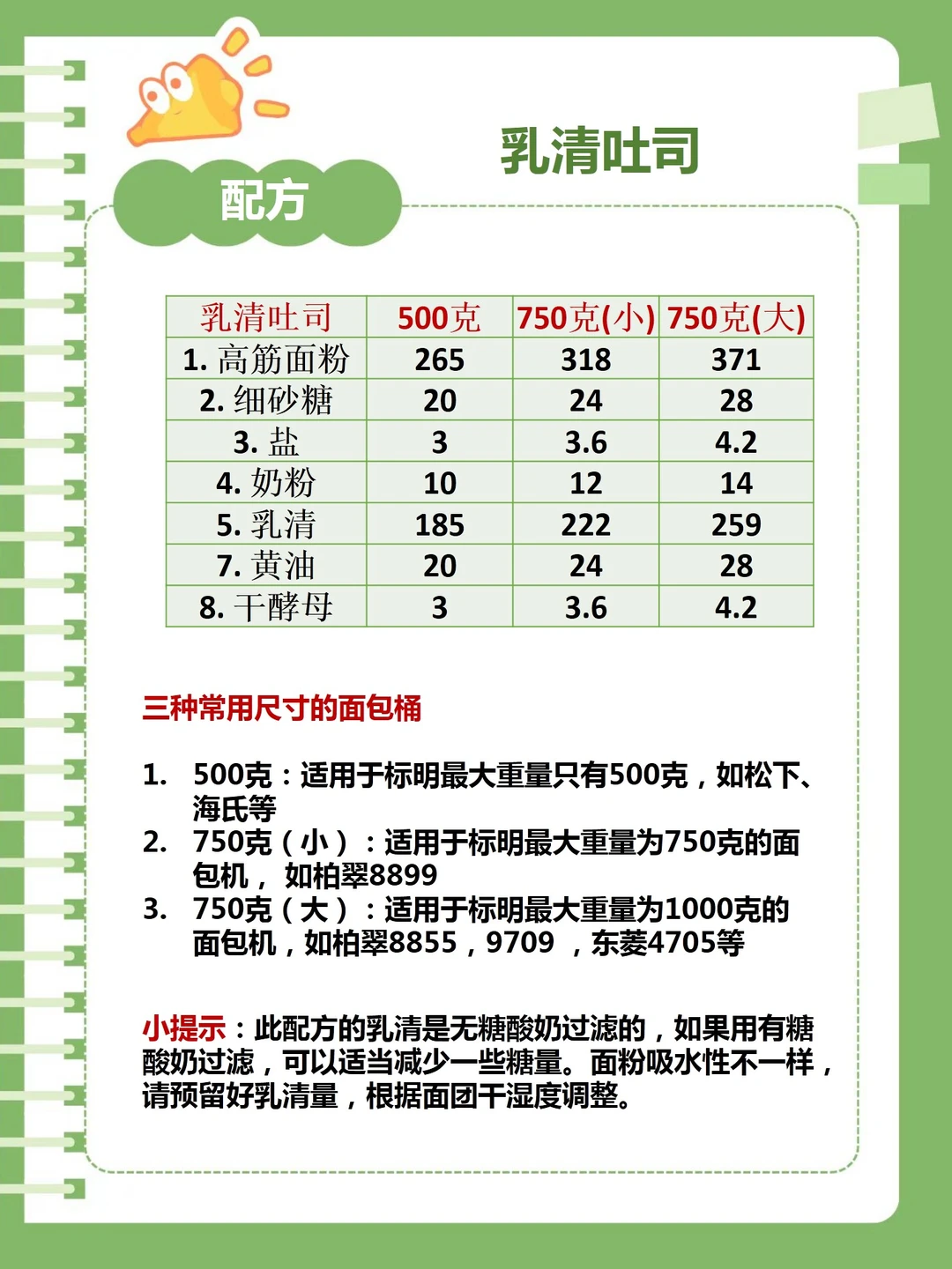 老规矩,各种大小面包机的配方都帮你算好了。