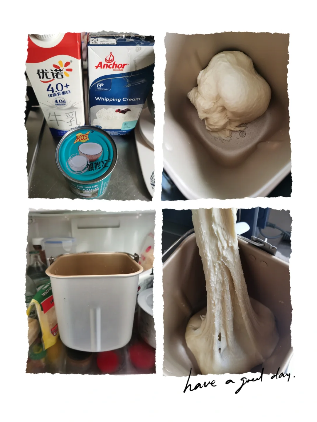 夏天用面包机的关键就是控温,当室温达到25度以上,一定要开空调做了。还有一种办法就是水合法,除黄油和酵母外的面团放入冰箱冷藏一个晚上,但其实不用那么久,1小时就可以了,面团已经成筋,也足够冷了,可以防止面团升温过快。不少姐妹水合法后面团发不出来就是由于冷藏过久,所以1小时足够了。接下来用面包机的一键式就自动能出手套膜,啥都不管了,实在太简单了!