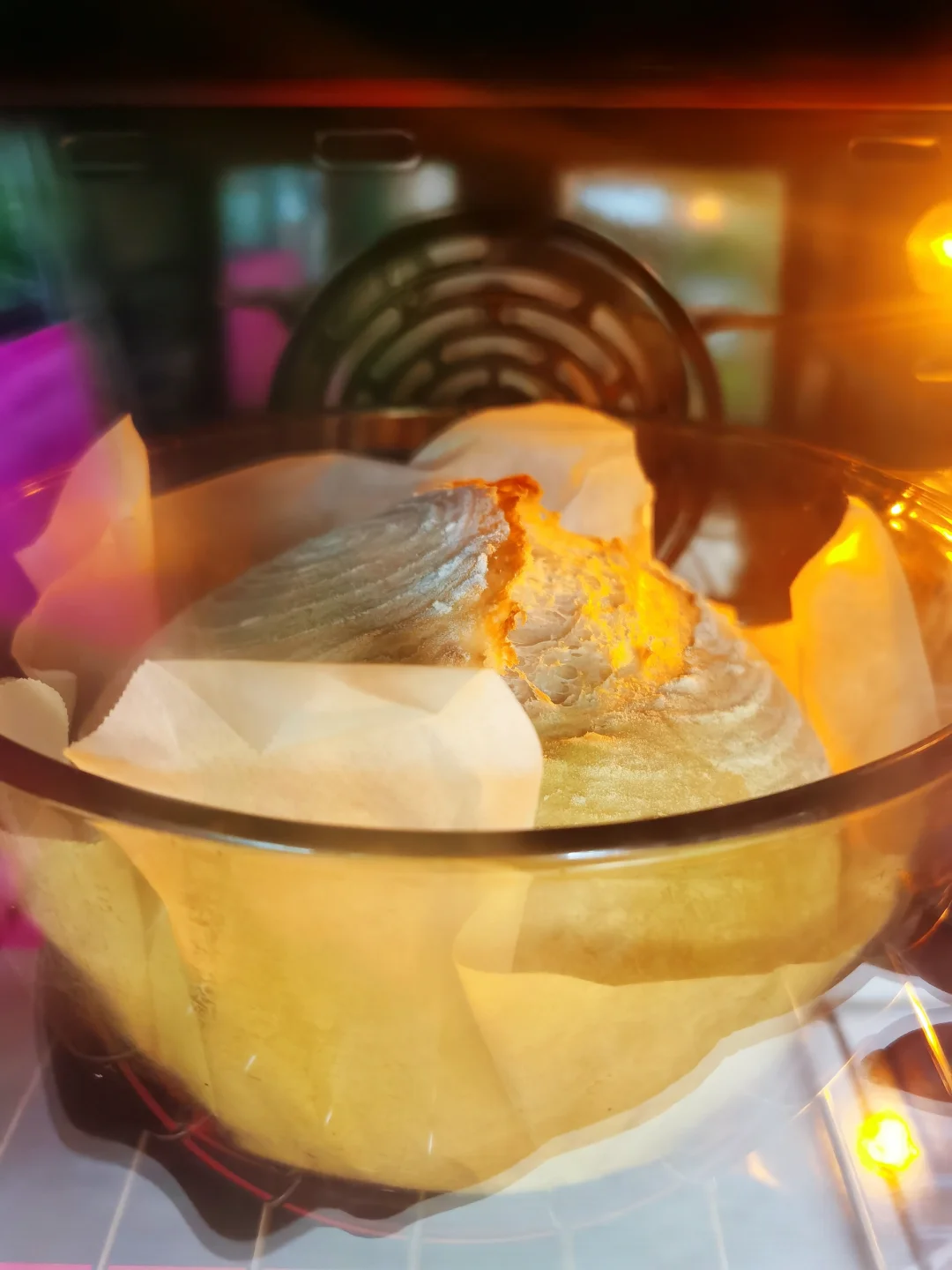 8. 戴好手套,取出烤箱内锅子,开盖,连同烘焙纸一起将面团放入,加盖后放回烤箱。