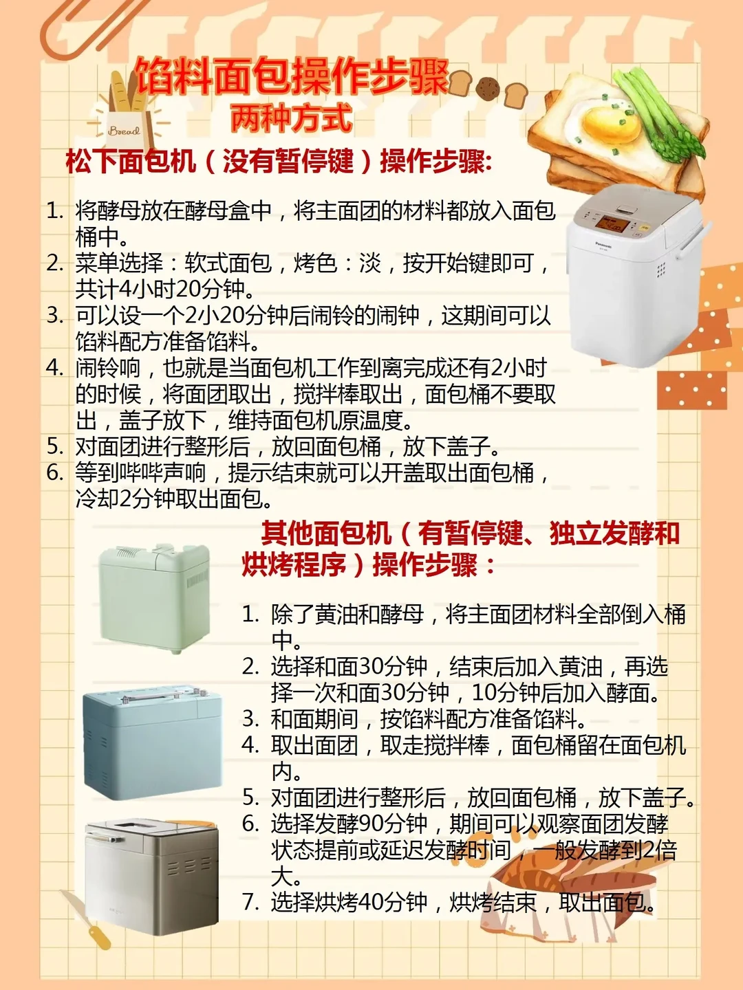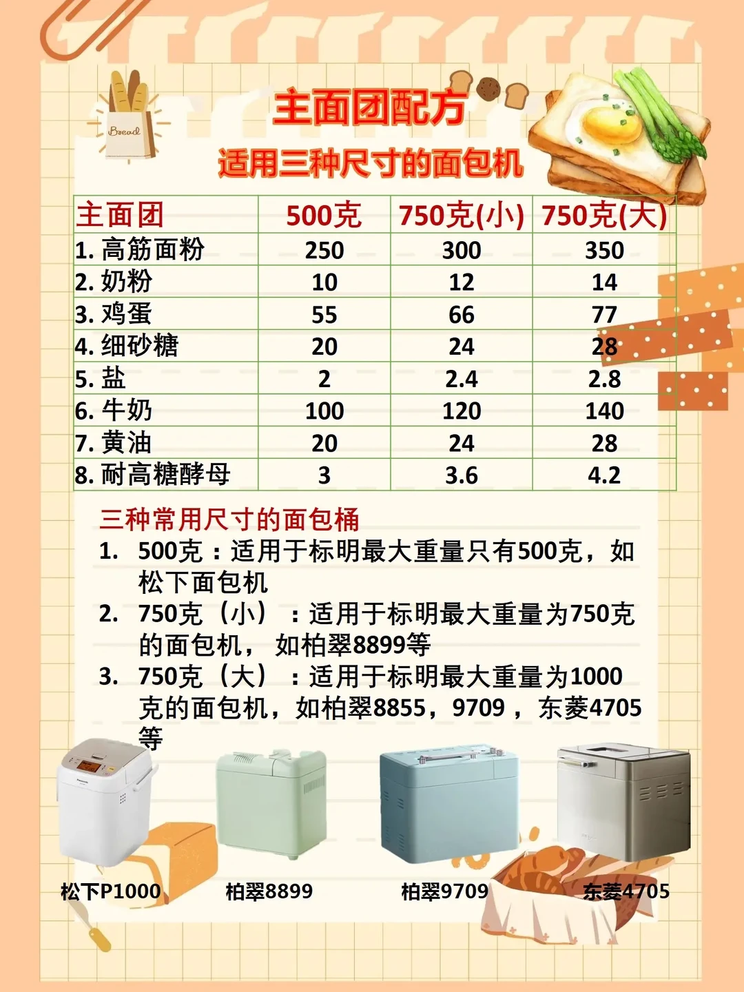 考虑到宝子们用的面包机不同,我用最大努力按面包机以及面包桶分类,整理了不同面包机的操作步骤,和不同大小面包桶的配方,都列在图表里了,无论你是啥面包机,应该都可以做了,如果不清楚,可以查看我主页里有针对每个配方的详细笔记,当然,也可以留言问,希望能够帮到你。