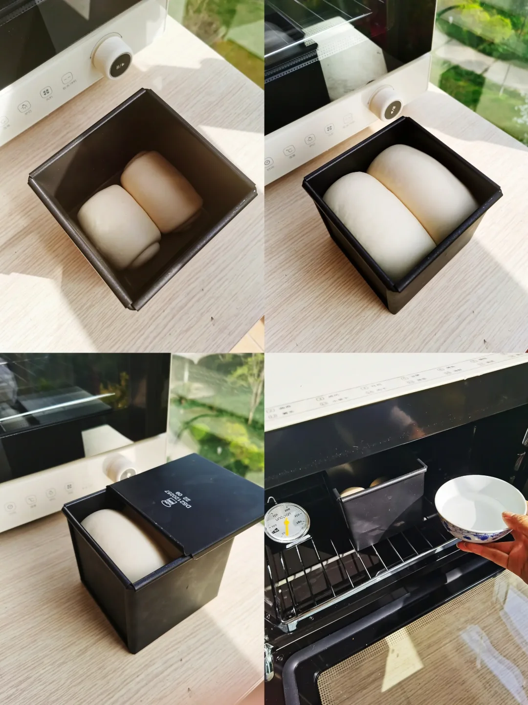 5. 将吐司盒送入烤箱发酵,放入一小碗热水,保持湿度。38度发酵1小时,实际用了50分钟已经八分满了。