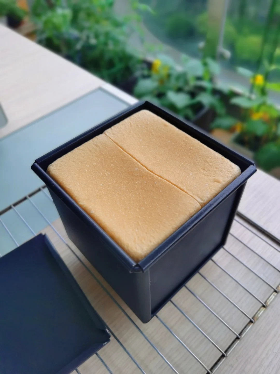 6. 盖上吐司盖,再次送入烤箱,选择上火160度,下火180度,烘烤35分钟。(温度和时间可根据自家烤箱性能调整)