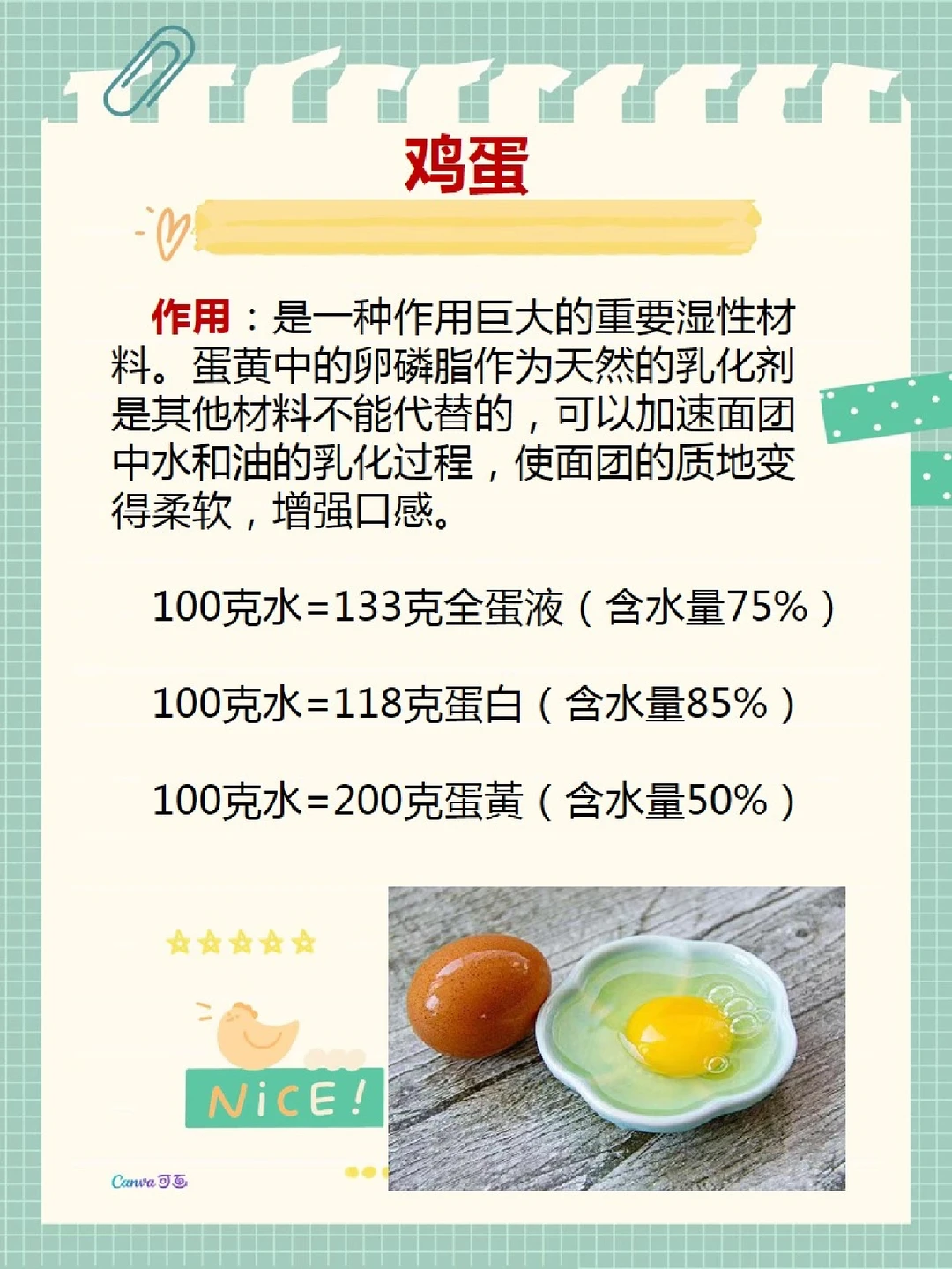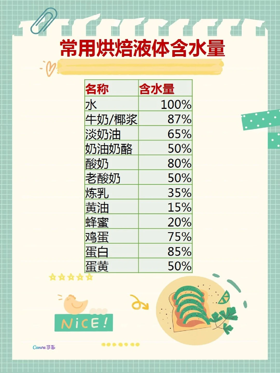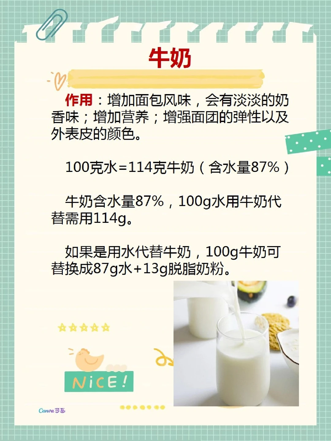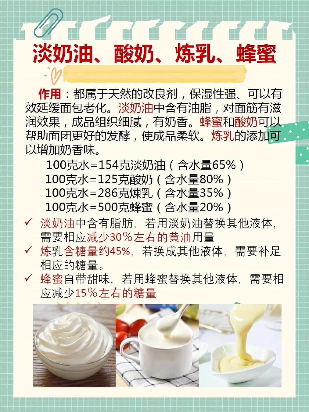 我以前分享面包方子的时候总要说一句“新手不要随意改方子”,现在想想有点武断了,因为有人牛奶、鸡蛋过敏,有人要控糖,而新手刚开始学做面包的时候经常碰到缺材料来不及买,问我怎么办,我的回答就是“买”。好吧,为我的霸道道个歉,这次就把做面包里的材料的作用和如何替换的简单小公式原原本本告诉宝子们,不晓得你们学会了还会关注我吗? 面包里的含水量非常重要,控制不好必定翻车,可能网上有很多万能公式,我觉得罗列一大堆也用不到,附图里只讲我面包方子里经常用到的一些液湿性材料包括水、牛奶、鸡蛋、淡奶油、蜂蜜等,如果在烘焙面包过程中,对牛奶或者鸡蛋过敏的话,可以进行替换成水或者淡奶油等等,有了液体换算公式就非常便捷方便快速自己换算哦,当然不清楚的,依然可以问我。