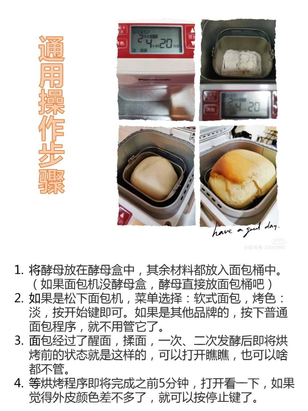 [一R]图片中面包用的面包机是松下多年前的一个老型号,感觉这面包程序很好地模拟了手工面包的步骤,且有独立的酵母盒,最大限度的保证了酵母的活力。当然,我也只用过两个品牌,对面包机的选择没有发言权,特别是当前烘焙设备的功能日新月异,其他品牌的面包机都一样可以用。