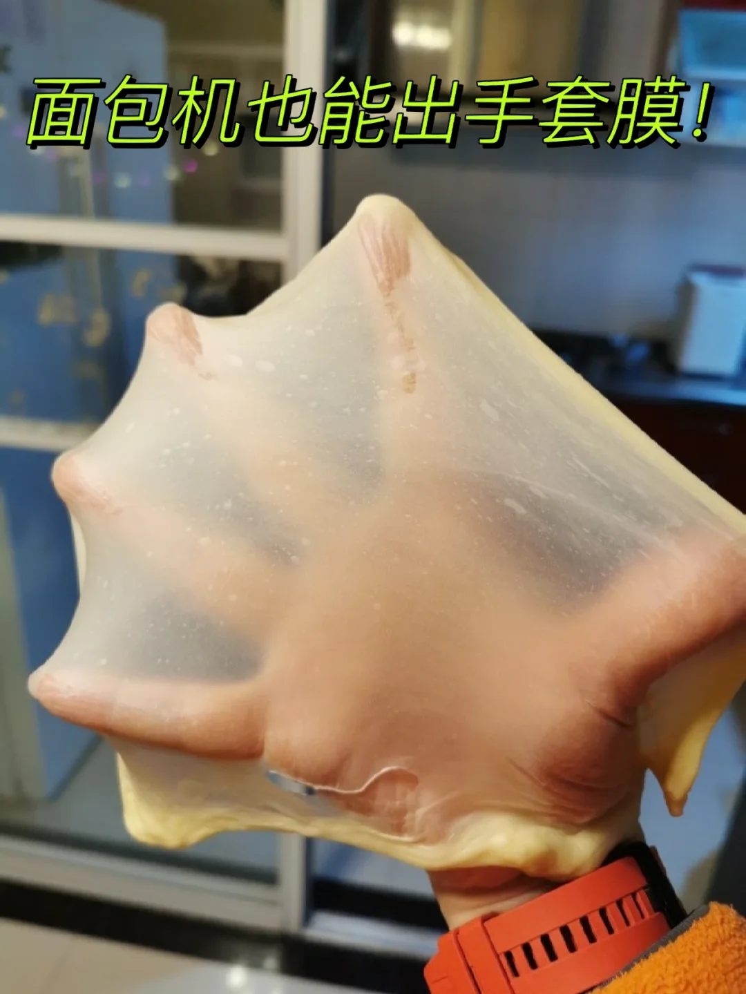 [樱花R]PS:最后一图是面包机最后一次揉面后,扯了一小块拉出的手套膜,面包达人们都懂的。[哇R]