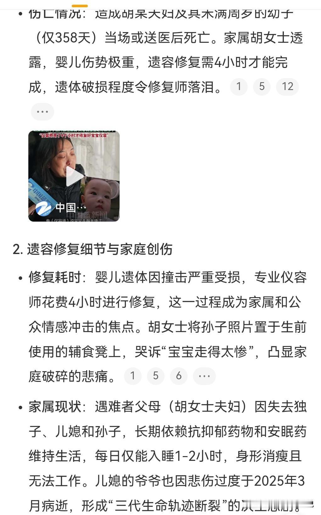 这没什么好说的。我只希望早日将肇事者执行死刑。 1月8日热搜。 景德镇被撞宝宝遗容4小时才修复,可见车速是有多么的快,把宝宝的面部撞得面目全非了。 修复师看着都掉眼泪。 毕竟死者是一个1岁不到的孩子。 一家三口,三条人命,肇事者真的是太可恶了。