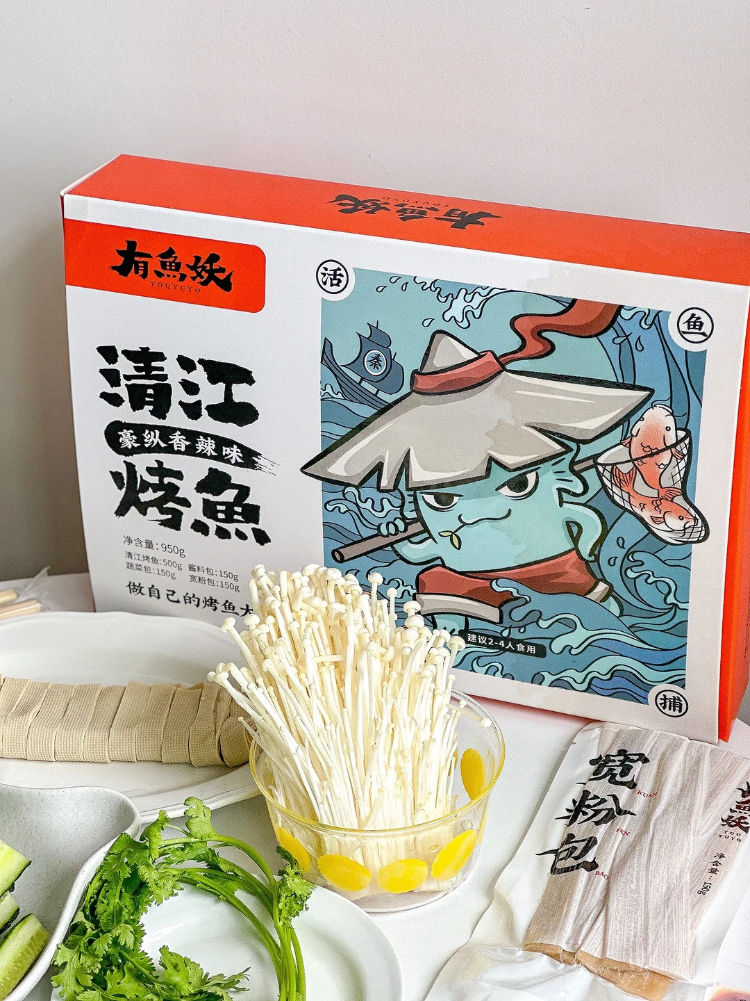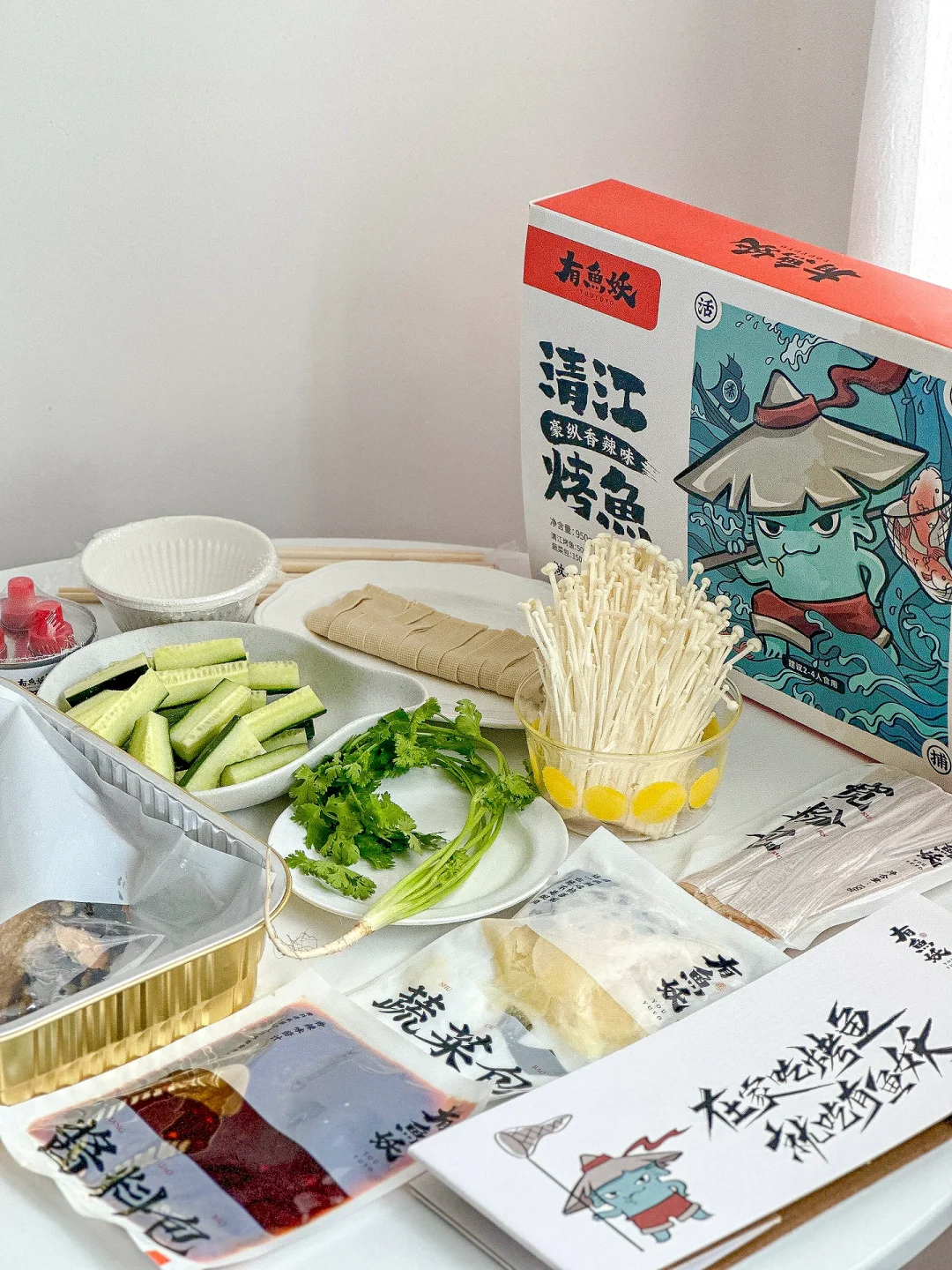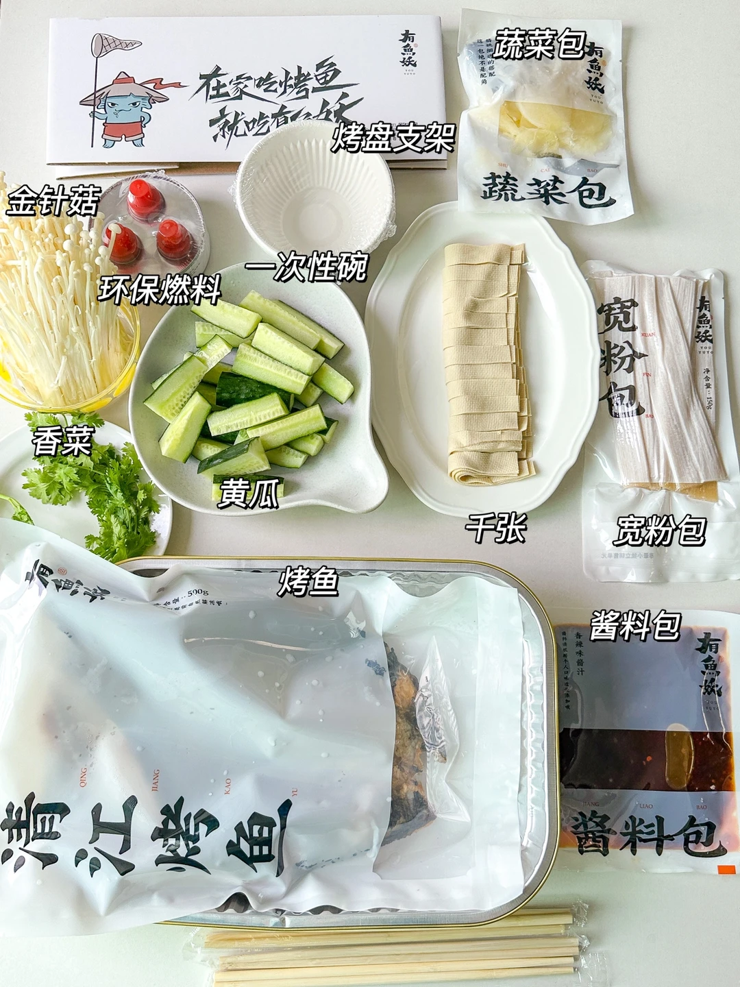 数不清吃了多少次有鱼妖他们家的烤鱼了!免洗免烤免调料!自带一次性餐具和蔬菜鱼肉包!!还有燃料!!这氛围感就拉满呀🥳~~蔬菜包里有木耳、藕片、笋、海带、土豆和宽粉,我还加了自己喜欢吃的配菜,千张、黄瓜和金针菇✌🏻
