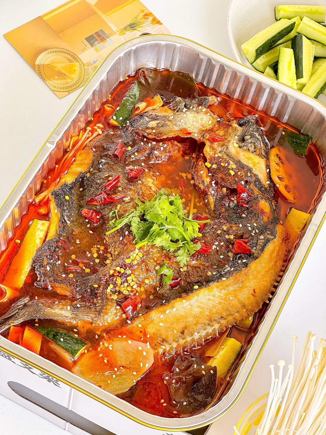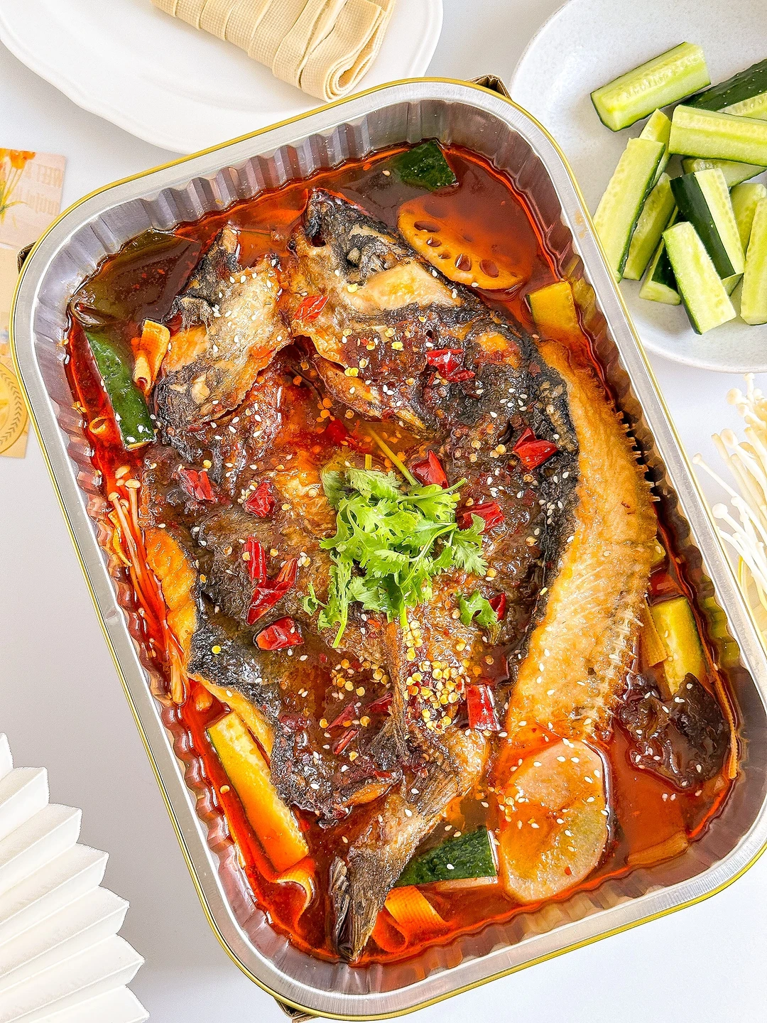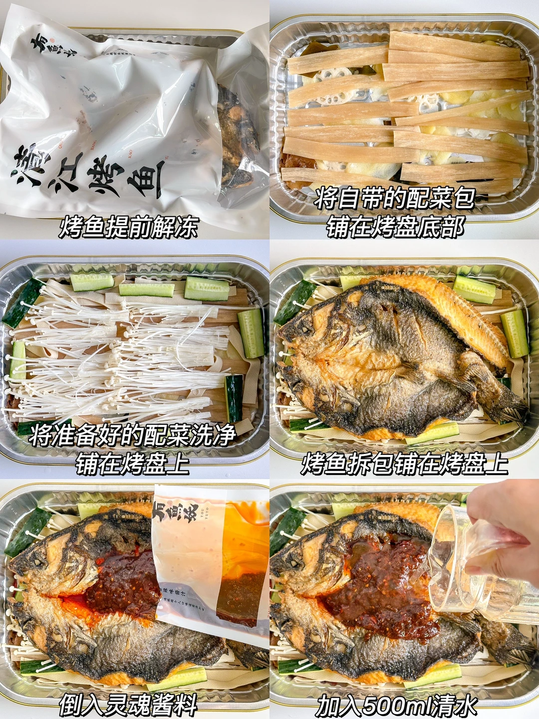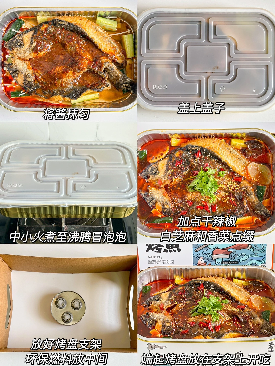 2️⃣烤鱼拆包铺在烤盘上,倒入灵魂酱料,加入500ml清水,盖上盖子,中小火煮至沸腾冒泡泡,加点干辣椒、白芝麻和香菜点缀