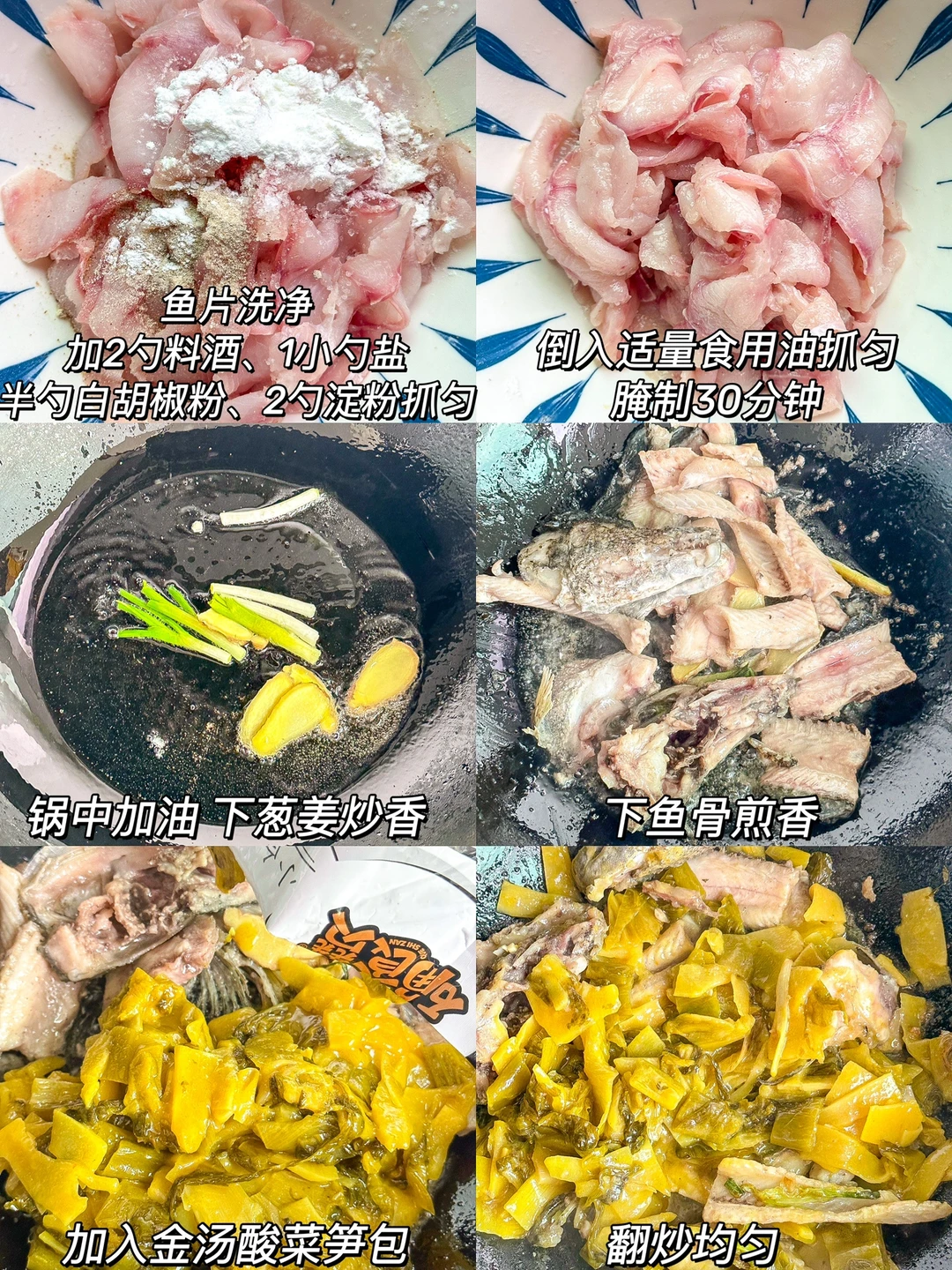 2️⃣锅中加油,下葱姜炒香,下鱼骨煎香,加入金汤酸菜笋包炒香,加入适量开水