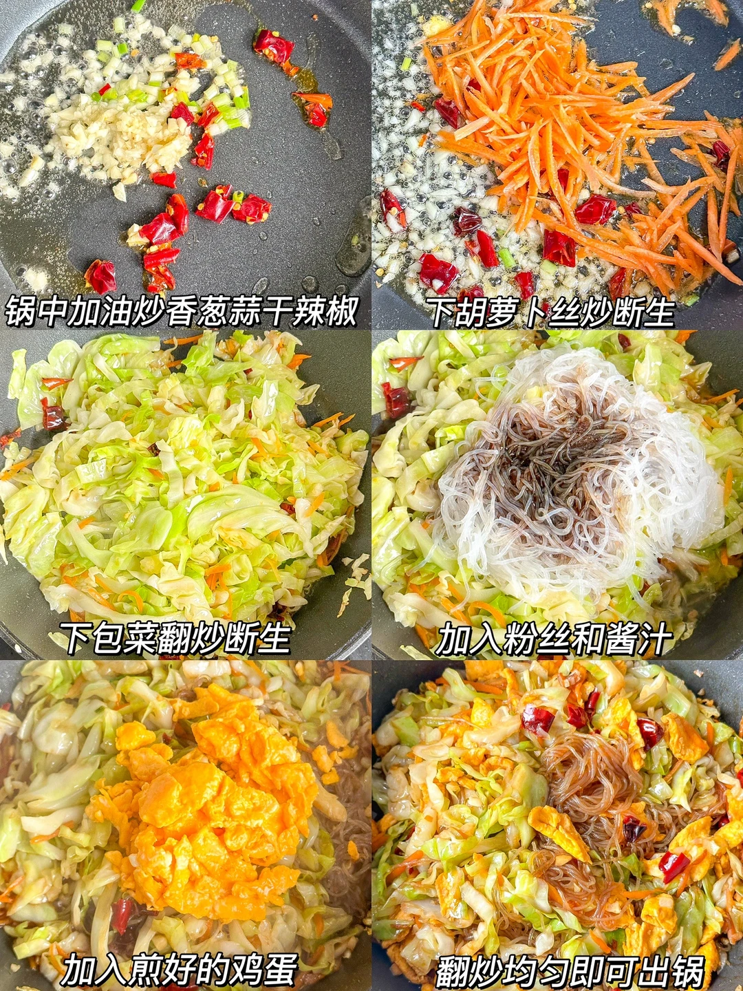 给肉都不换!!简单又快手的家常包菜鸡蛋炒粉丝!!超下饭!!太好吃了~ [派对R][派对R][派对R] ㅤ 🌟准备食材🌟 包菜半个 鸡蛋2颗 粉丝1捆 胡萝卜半根 葱蒜干辣椒 🌟做法🌟 1️⃣包菜和胡萝卜切丝,锅中加水,水开下粉丝烫一分钟捞出过凉水备用 2️⃣鸡蛋打散煎熟盛出备用,锅中加油炒香葱蒜干辣椒,下包菜胡萝卜丝炒断生,加入粉丝,加2勺生抽➕半勺老抽➕1勺蚝油➕一小勺盐和味精,加入煎好的鸡蛋翻炒均匀即可出锅 ㅤ