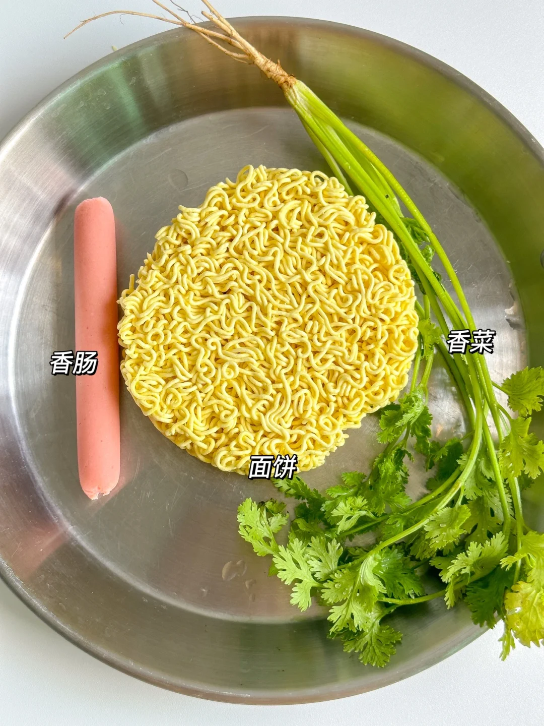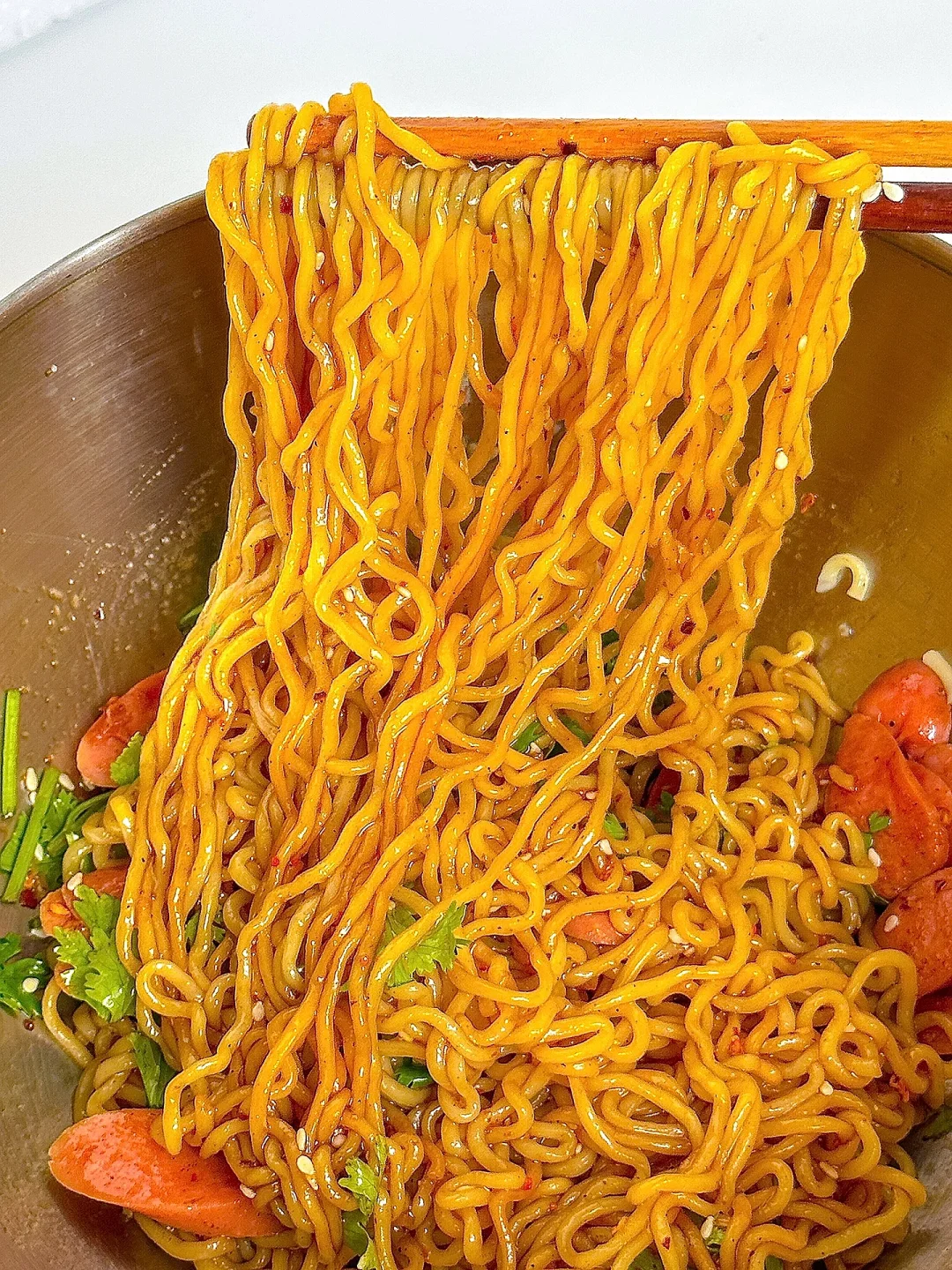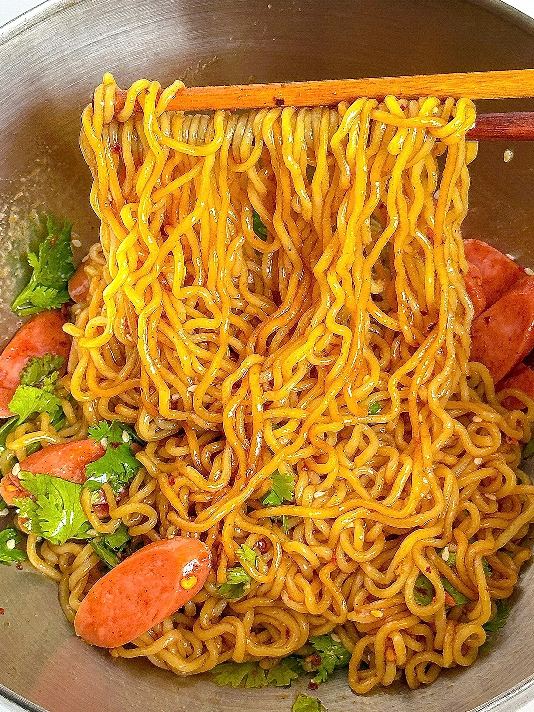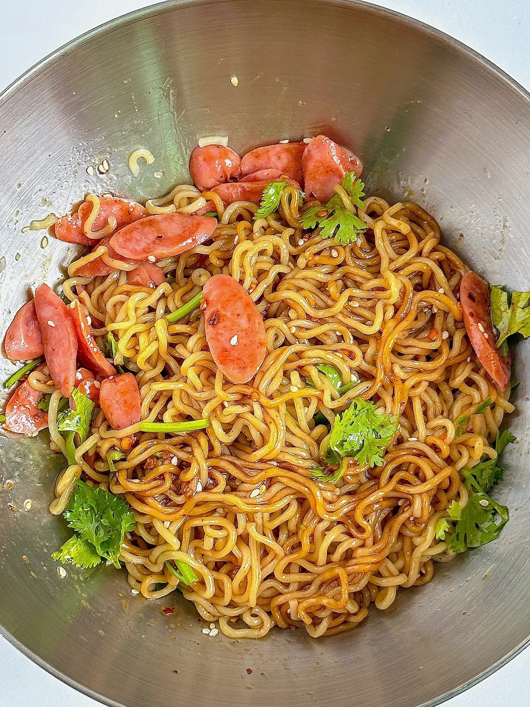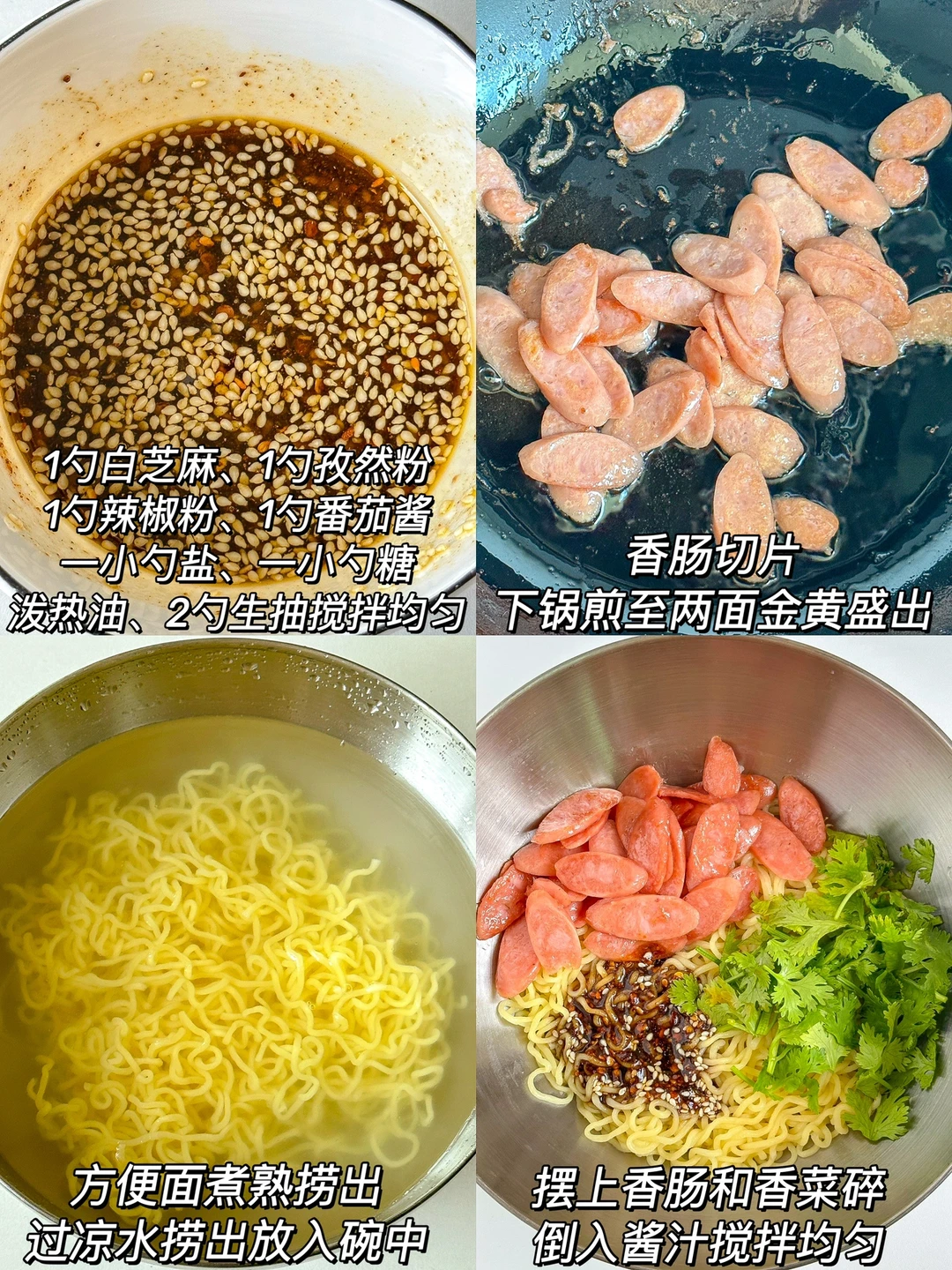 2️⃣香肠切片下锅煎至两面金黄捞出,方便面煮熟捞出过凉水捞出放入碗中,摆上香肠和香菜碎,倒入调好的酱汁搅拌均匀即可开动
