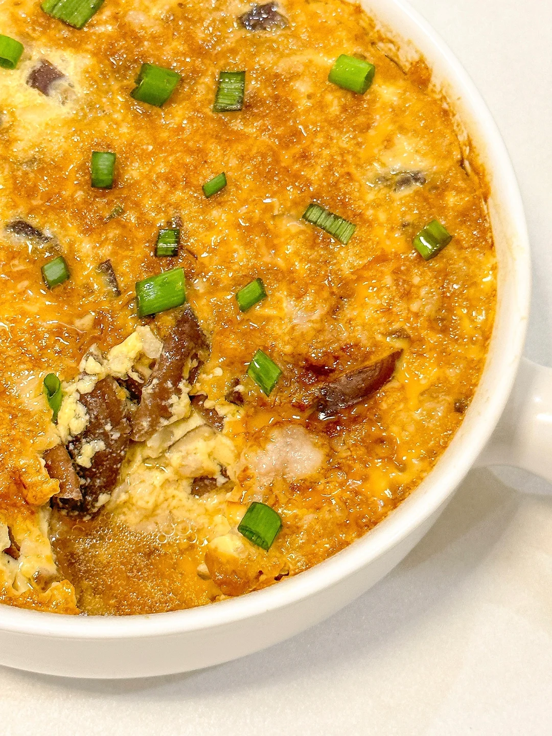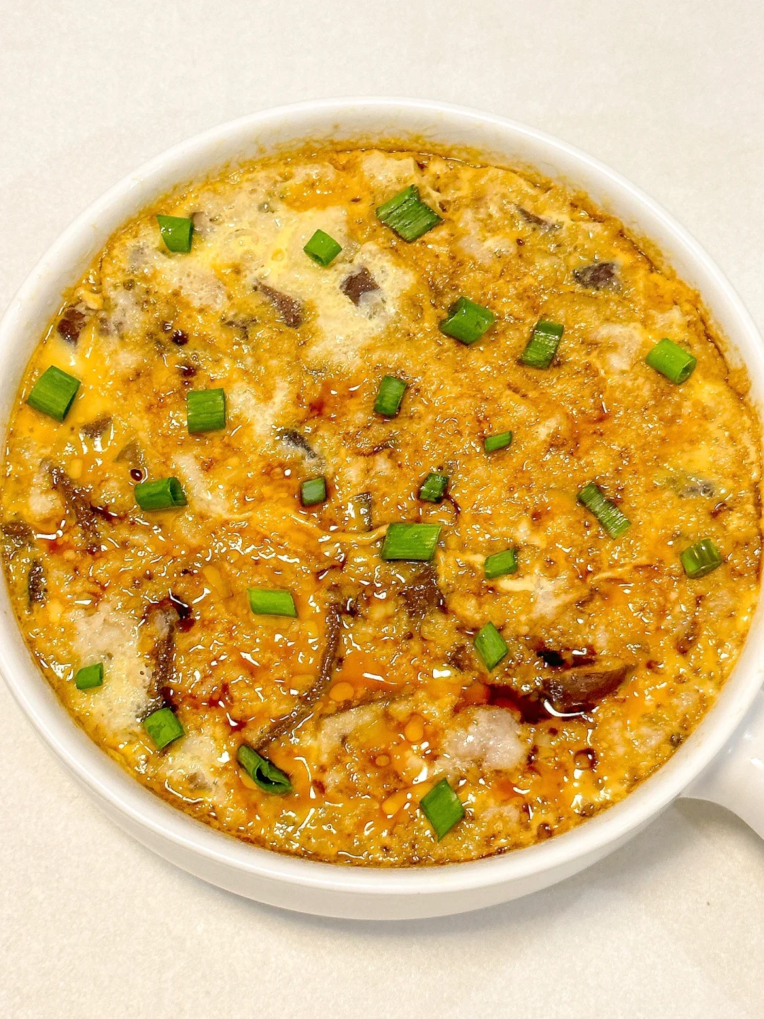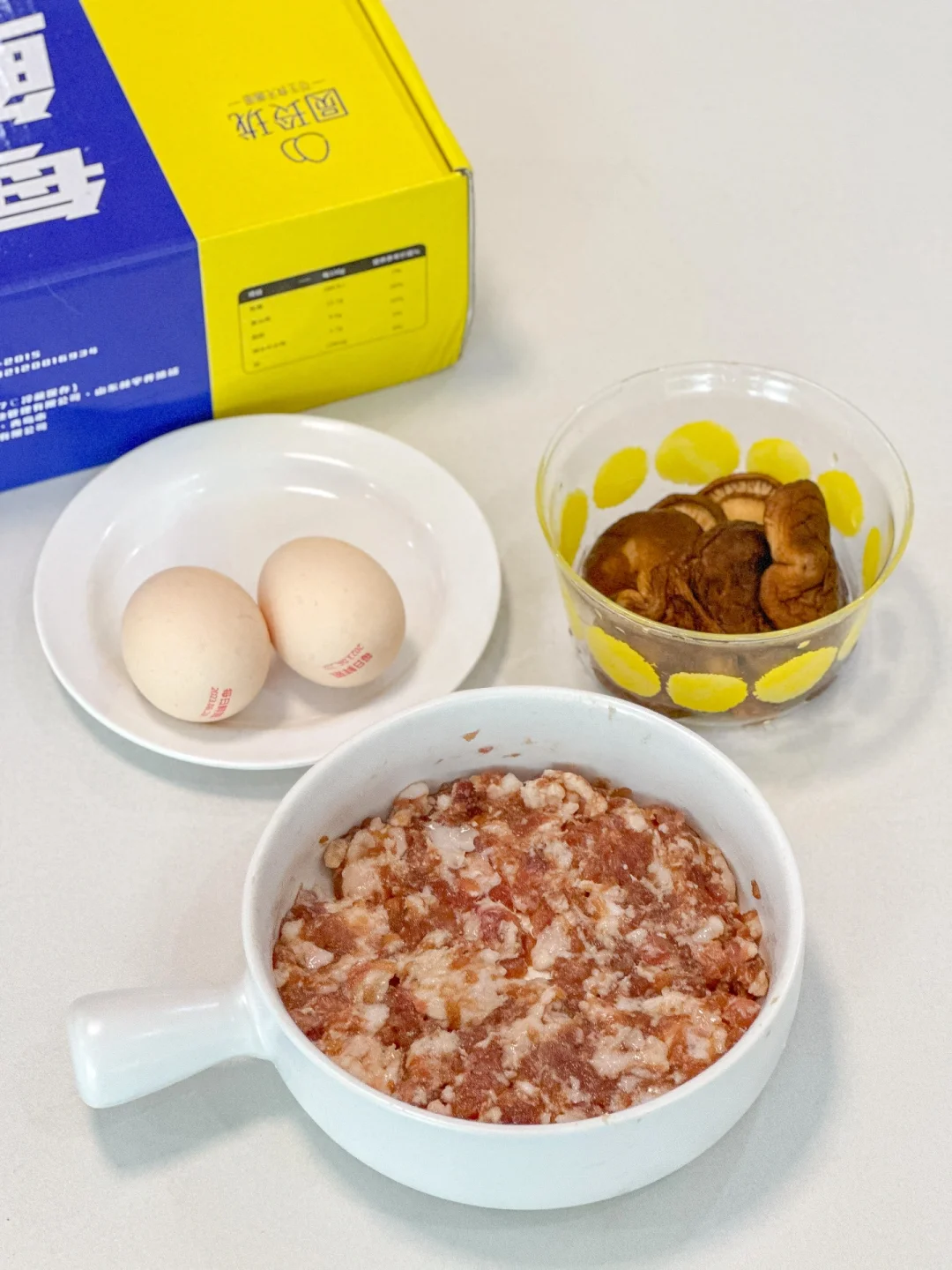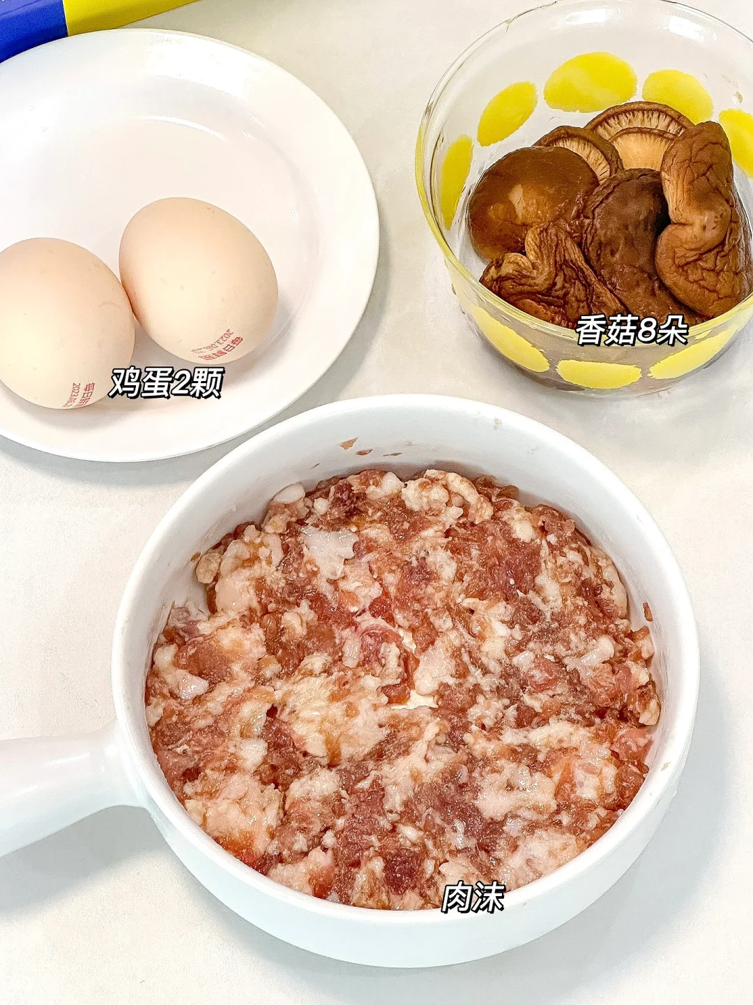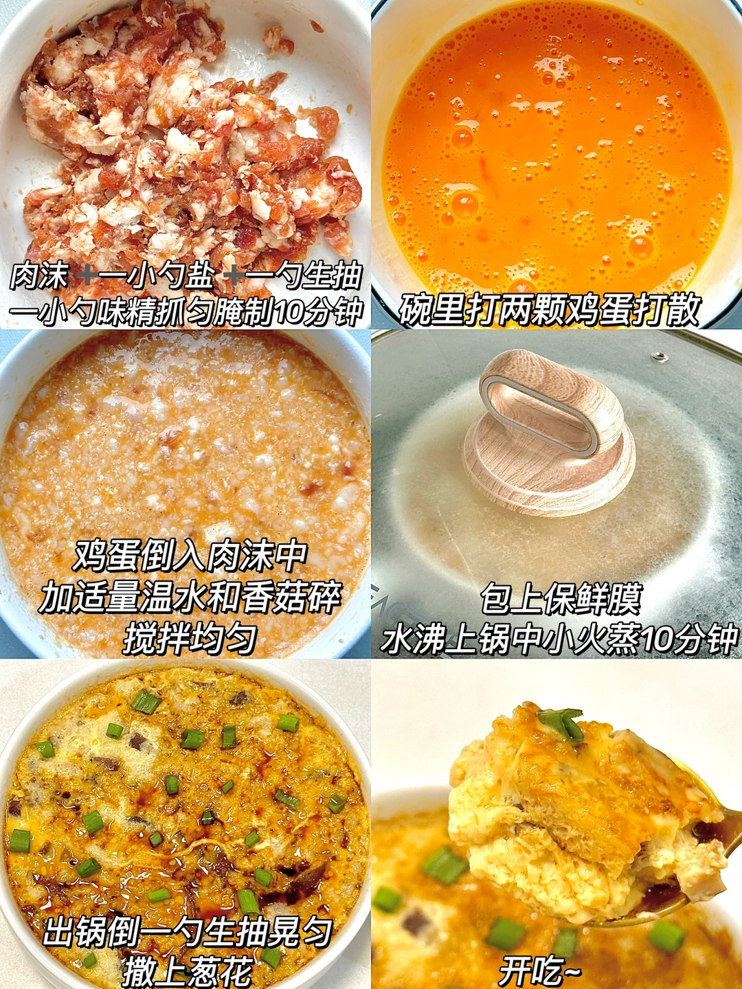 从小吃到大的香菇肉沫蒸蛋!!每次上桌都靠抢~真的巨香巨好吃!!拌米饭又鲜美!! ㅤ 🌟准备食材🌟 鸡蛋两颗 香菇8朵 猪肉沫 🌟做法🌟 1️⃣干香菇要提前泡软,肉沫➕一小勺盐➕一勺生抽➕1小勺味精搅拌均匀腌制10分钟 2️⃣碗里打两颗鸡蛋打散,倒入肉沫中加适量温水和香菇碎搅拌均匀 3️⃣包上保鲜膜用牙签戳几个洞洞,水沸上锅中小火蒸10分钟,出锅倒一勺生抽晃匀撒上葱花即可 ㅤ 家里有小孩的都会爱的这道菜!!蒸出来的鸡蛋爽滑Q弹再配上筋道的肉沫!家里有不吃蛋黄的娃一定要安排上~ ㅤ