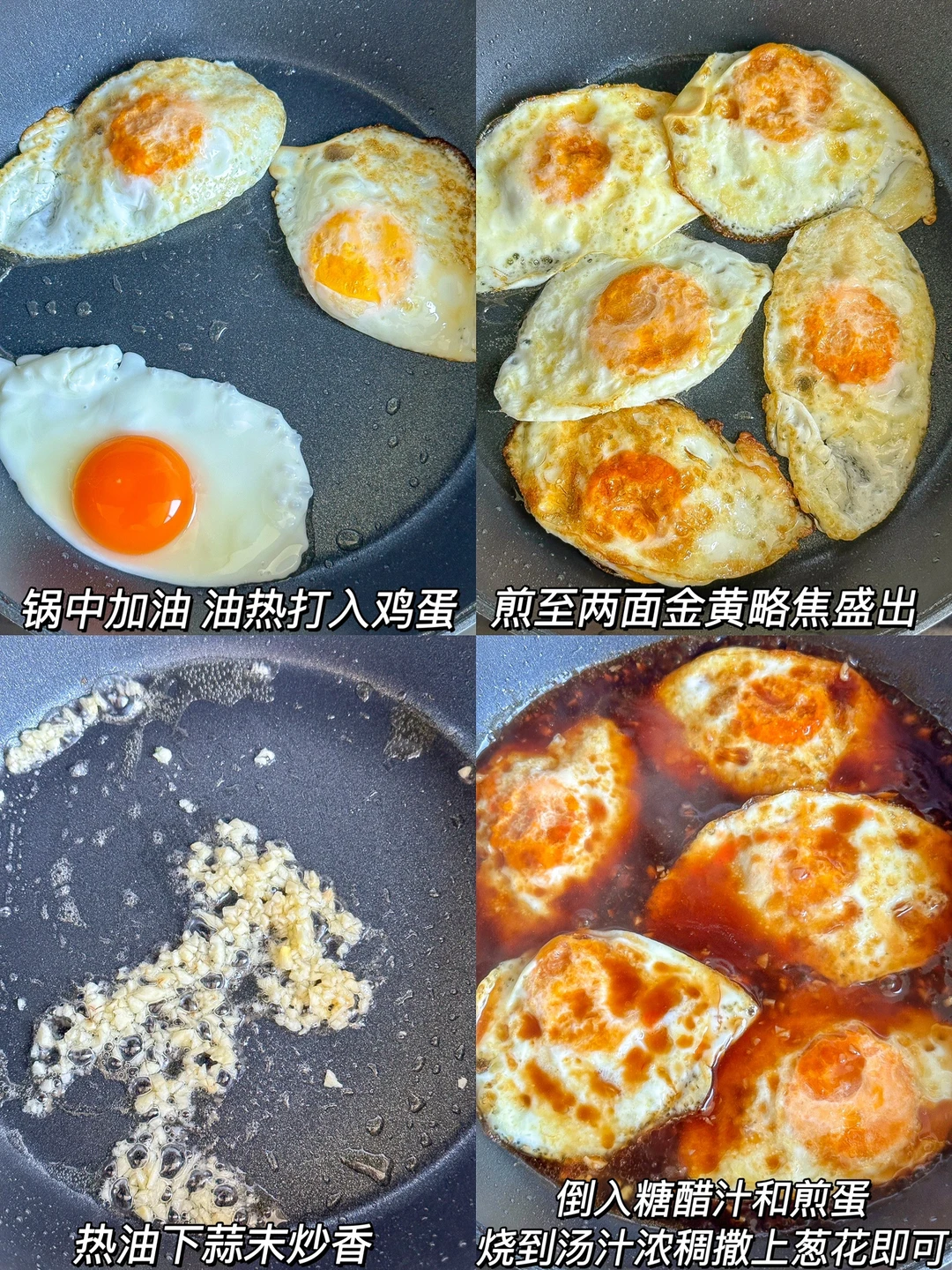 每次做这个糖醋荷包蛋三碗饭都不够吃的!!家里没菜的时候就试试这个吧!!酸甜开胃~ ㅤ 🌟准备食材🌟 鸡蛋 大蒜 葱 🌟做法🌟 1️⃣调酱汁:1勺生抽➕1勺醋➕1勺蚝油➕2勺番茄酱➕半勺老抽➕1勺淀粉➕半碗清水搅拌均匀备用 2️⃣锅中加油,油热打入鸡蛋煎至两面金黄略焦盛出 3️⃣热油下蒜末炒香,倒入糖醋汁和煎蛋,烧到汤汁浓稠撒上葱花即可 ㅤ 出锅夹几个放在米饭上,淋上酱汁,外焦里嫩的鸡蛋真的巨好吃啊!!!爱吃辣的可以再加点小米辣也很香!拜托一定要试试啊~