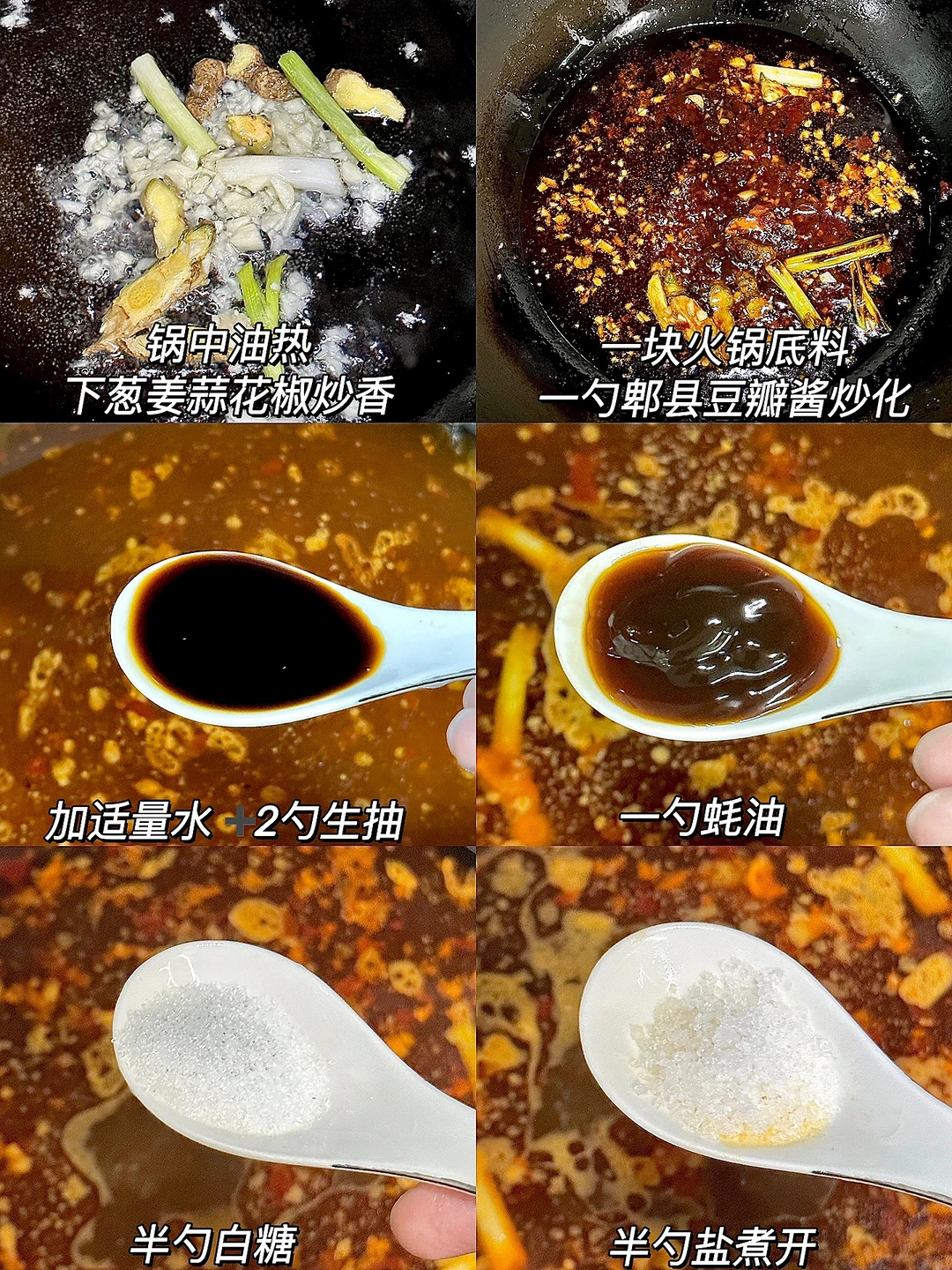 3️⃣锅中油热下葱姜蒜花椒炒香➕一块火锅底料和一勺郫县豆瓣酱炒化➕适量水➕2勺生抽➕1勺蚝油➕半勺白糖➕半勺盐煮开