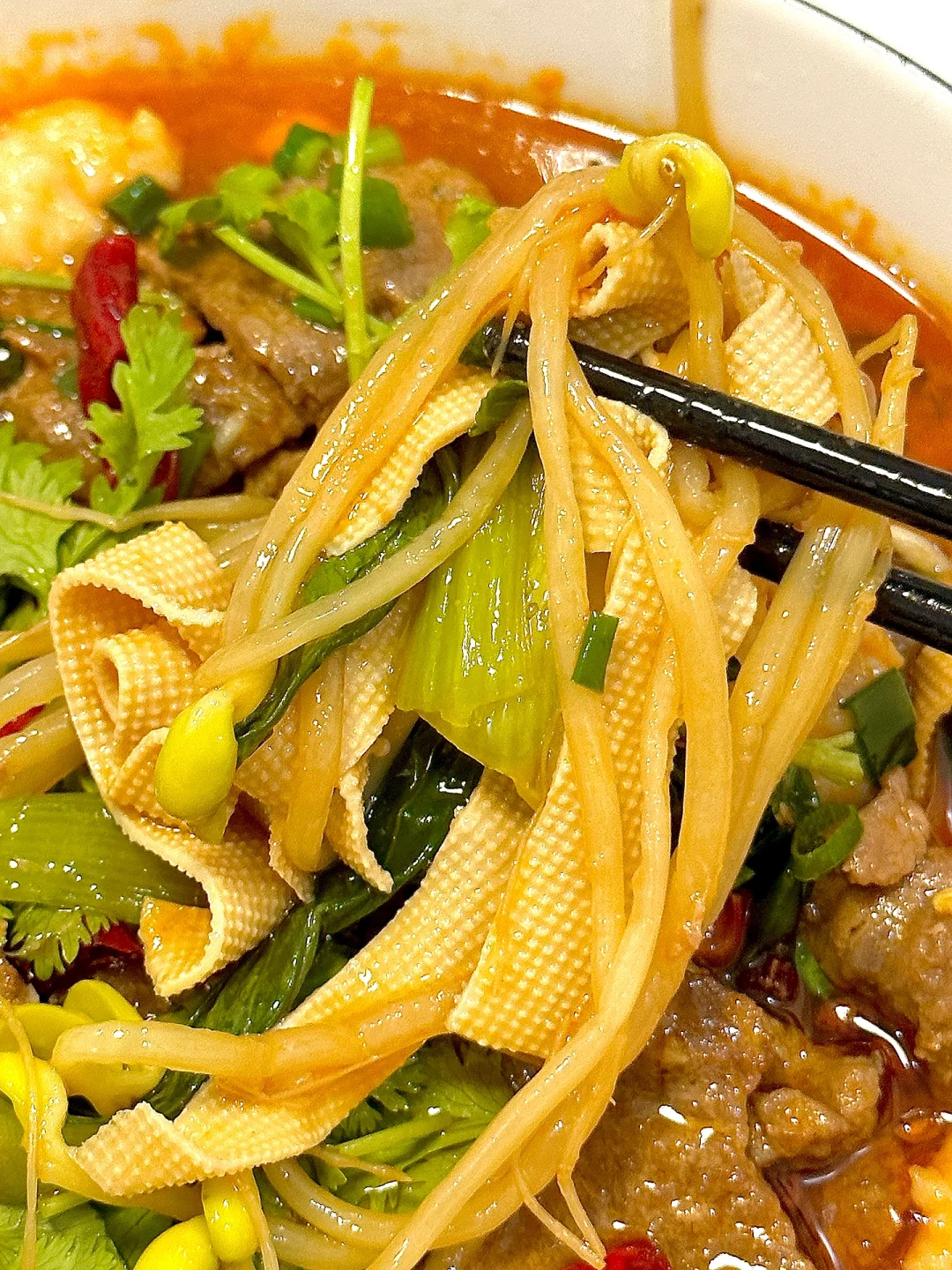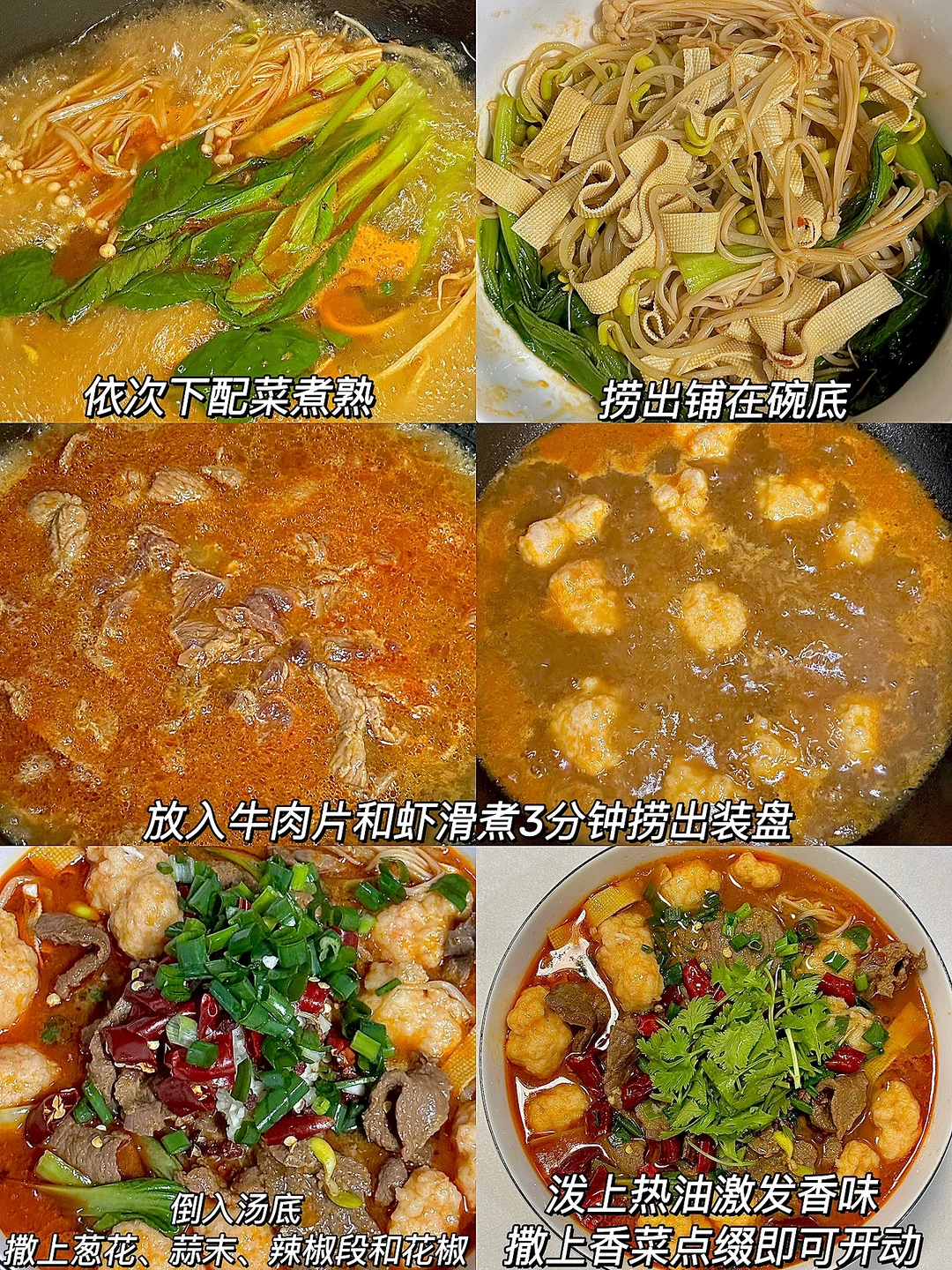 4️⃣依次下配菜煮熟捞出铺在碗底,再放入牛肉片和虾滑煮3分钟捞出装盘,倒入汤底