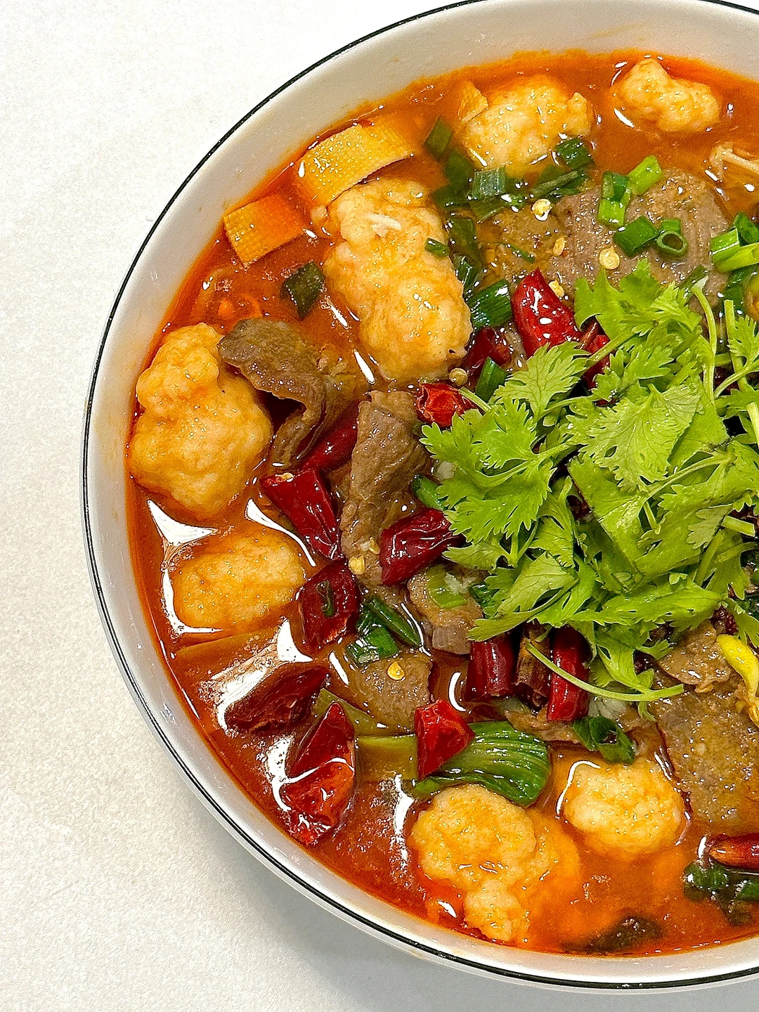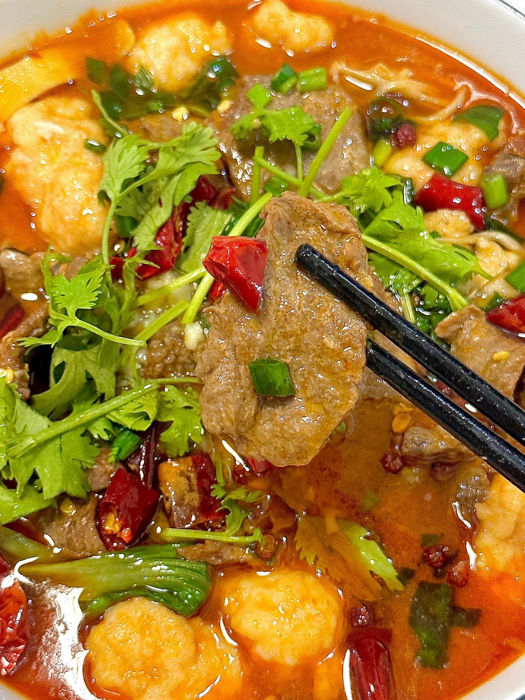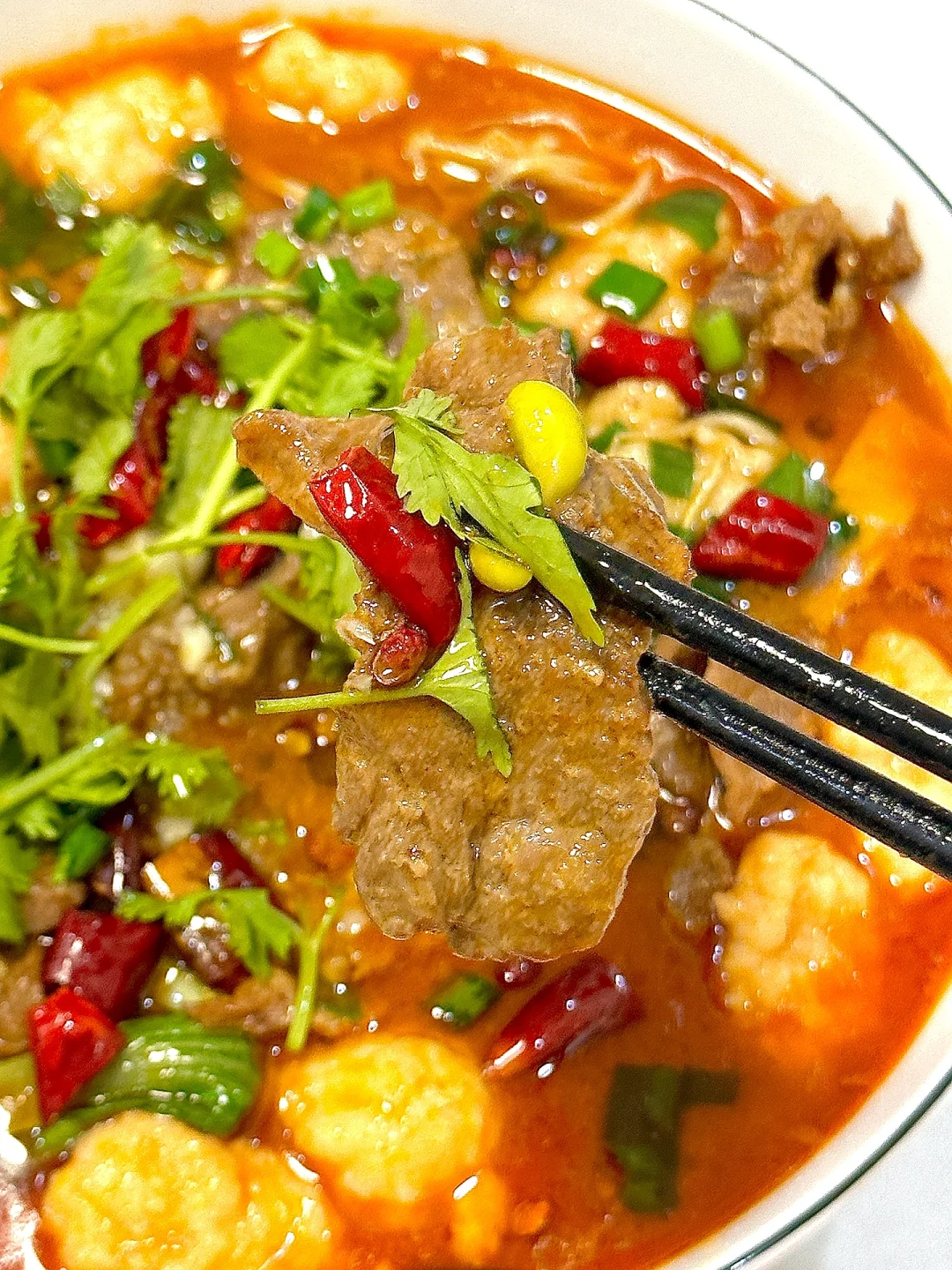 5️⃣撒上葱花、蒜末、辣椒段和花椒,泼上热油激发香味,撒上香菜点缀即可开动