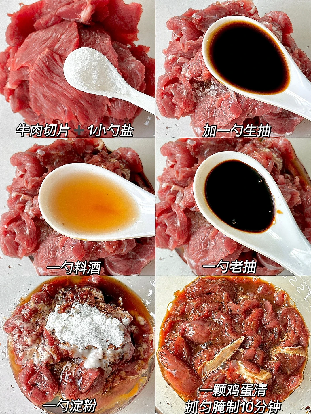 2️⃣牛肉切片➕1小勺盐➕1勺生抽➕1勺料酒➕1勺老抽➕1勺淀粉➕1个蛋清搅拌均匀腌制10分钟