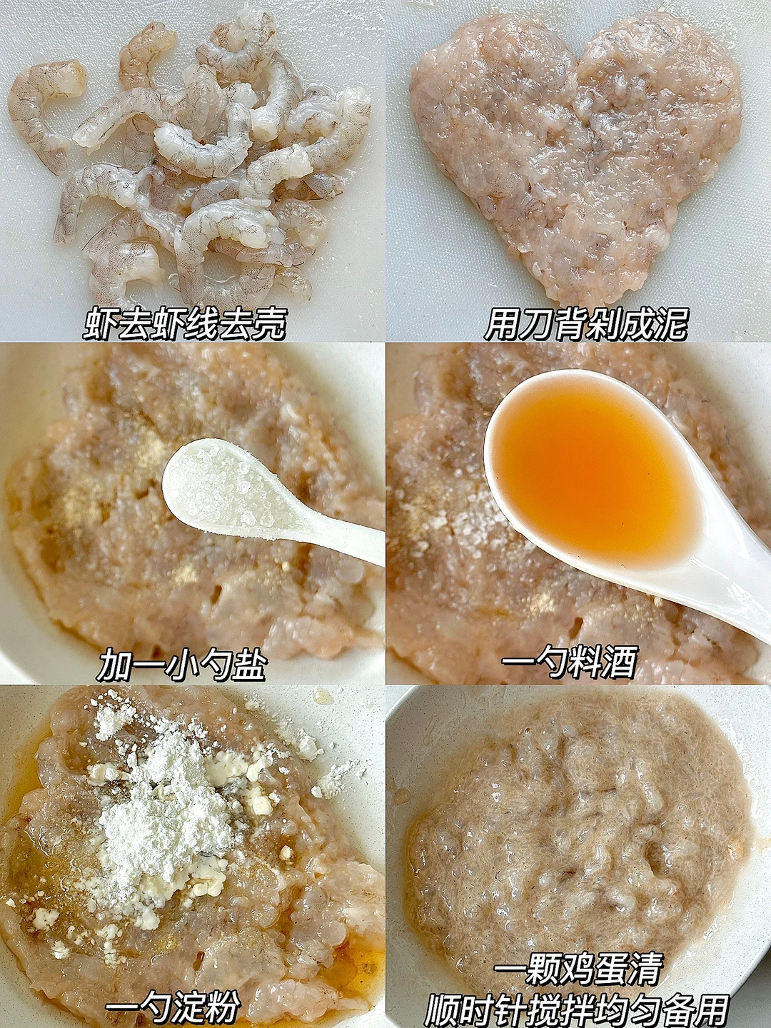1️⃣虾滑做法:虾去虾线去壳,用刀背剁成泥➕适量白胡椒粉➕1小勺盐➕1勺料酒➕1勺淀粉➕一颗鸡蛋清顺时针搅打上劲备用