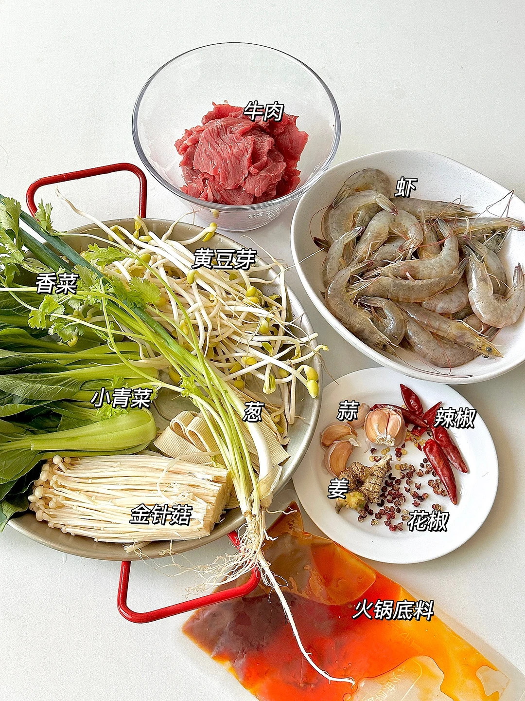 牛肉半斤 虾半斤 黄豆芽 千张 金针菇 小青菜 (喜欢什么配菜加什么) 葱姜蒜花椒 干辣椒 火锅底料 香菜
