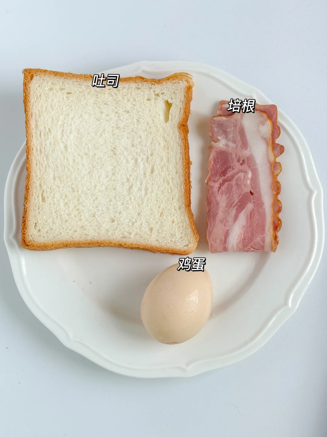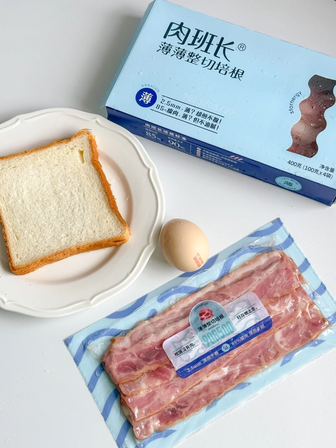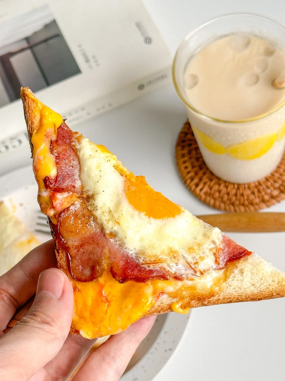 烤完的吐司边边脆脆香香的!而且这个培根薄薄的,低钠盐搭配起来不会咸!蛋黄培根夹着芝士一层层的口感真的绝啦!!