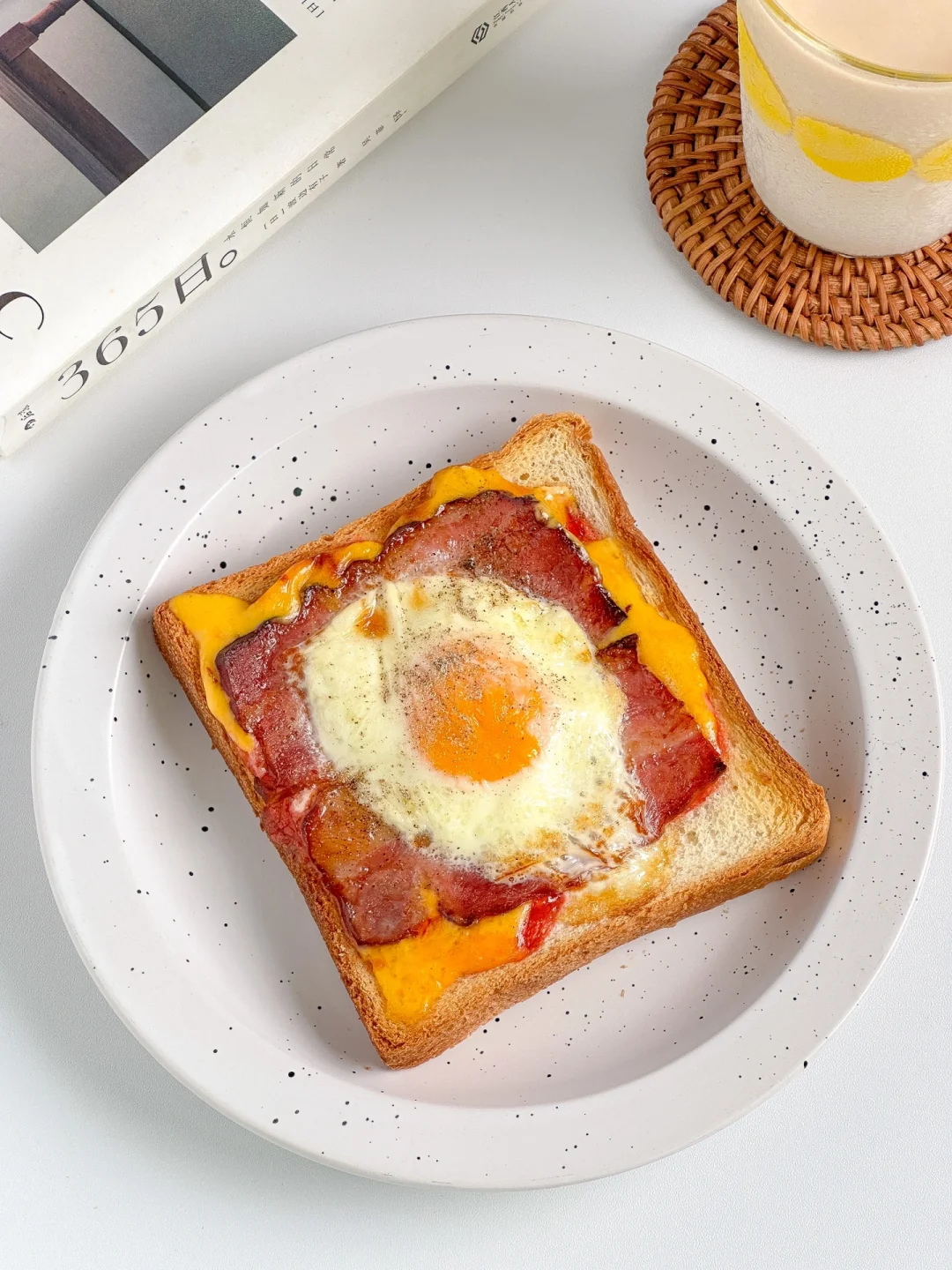 简简单单的培根鸡蛋吐司就完成啦~我喜欢吃溏心蛋调的时间短一些,喜欢是全熟的可以180度15分钟哈!!