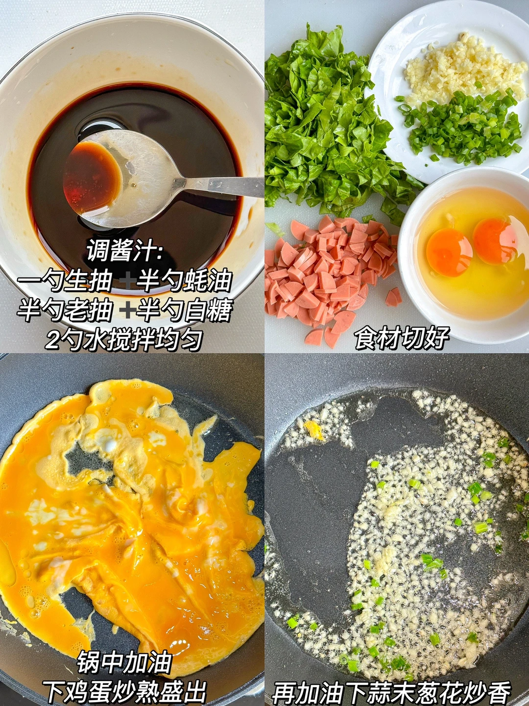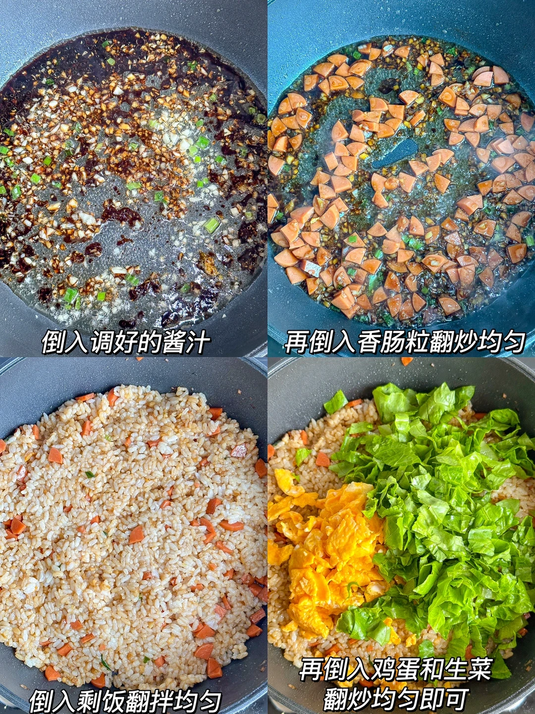 求求你们去做!!这个生菜炒饭真的太绝了!!好吃到不剩一粒米饭!!做法也简单!快去试试吧~~ ㅤ 🌟准备食材🌟 生菜两片 鸡蛋两颗 香肠一根 剩饭 葱花 蒜末 🌟做法🌟 1️⃣调酱汁:一勺生抽➕半勺蚝油➕半勺老抽➕半勺白糖➕2勺水搅拌均匀 2️⃣锅中加油,下鸡蛋炒熟盛出 3️⃣再加油下蒜末葱花炒香,倒入调好的酱汁,再倒入香肠粒翻炒均匀,倒入剩饭翻拌均匀,再倒入鸡蛋和生菜翻炒均匀即可 ㅤ 巨好吃的生菜炒饭就完成啦~我一个人可以干一大锅!!快去试试吧~~ ㅤ