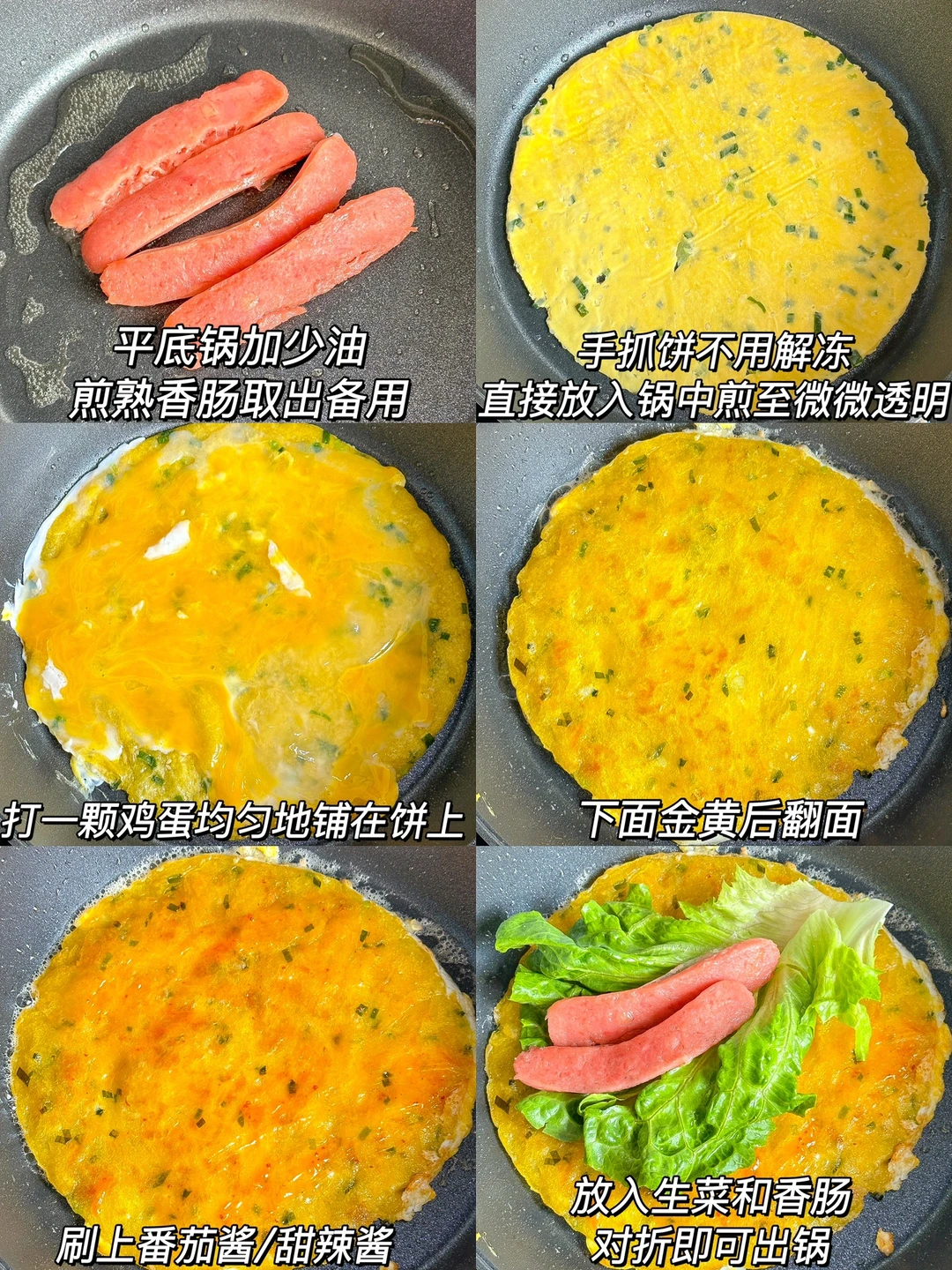 读书那会钟爱学校路边摊上的手抓饼,好吃又顶饱! 最近在家好馋,囤了些手抓饼来自己做早餐啦!!简单好吃又健康,有手就会! ㅤ 🌟准备食材🌟 手抓饼 鸡蛋 生菜 香肠 🌟做法🌟 1️⃣平底锅加少油,煎熟香肠取出备用 2️⃣手抓饼不用解冻直接放入锅中煎至微微透明 3️⃣打一颗鸡蛋均匀地铺在饼上,下面金黄后翻面 3️⃣刷上番茄酱/甜辣酱,放入生菜和香肠,对折即可出锅 ㅤ 大家想加什么配菜就可以加什么哦,喜欢吃辣的还可以刷上辣酱,也很绝!! ㅤ 做好的手抓饼香香脆脆的,咬一口~emmm~已经有路边摊那味儿了!!而且做法简单,不用五分钟!上班族、宝妈们真的要学起来做鸭~~~宅家也能吃到路边摊手抓饼真的太快乐了!! ㅤ