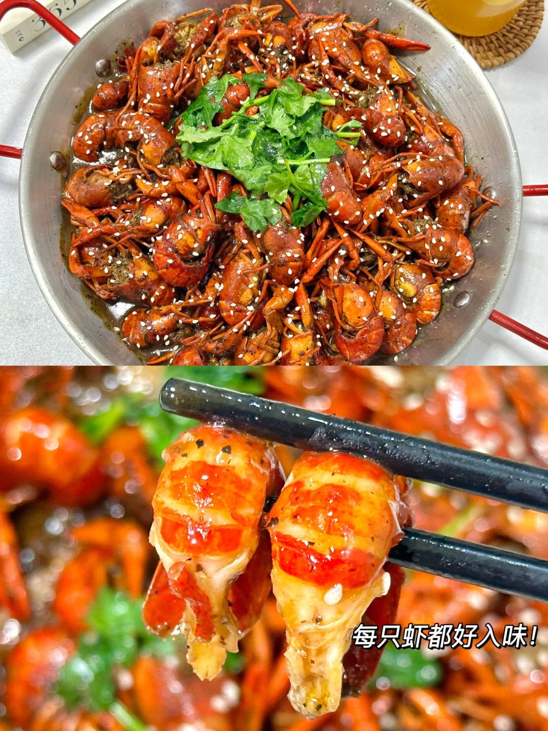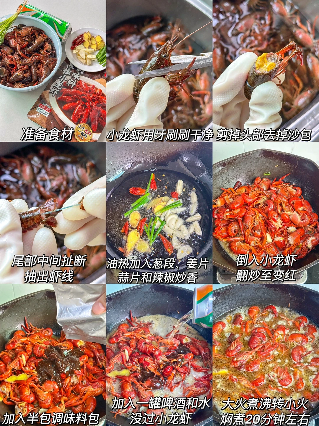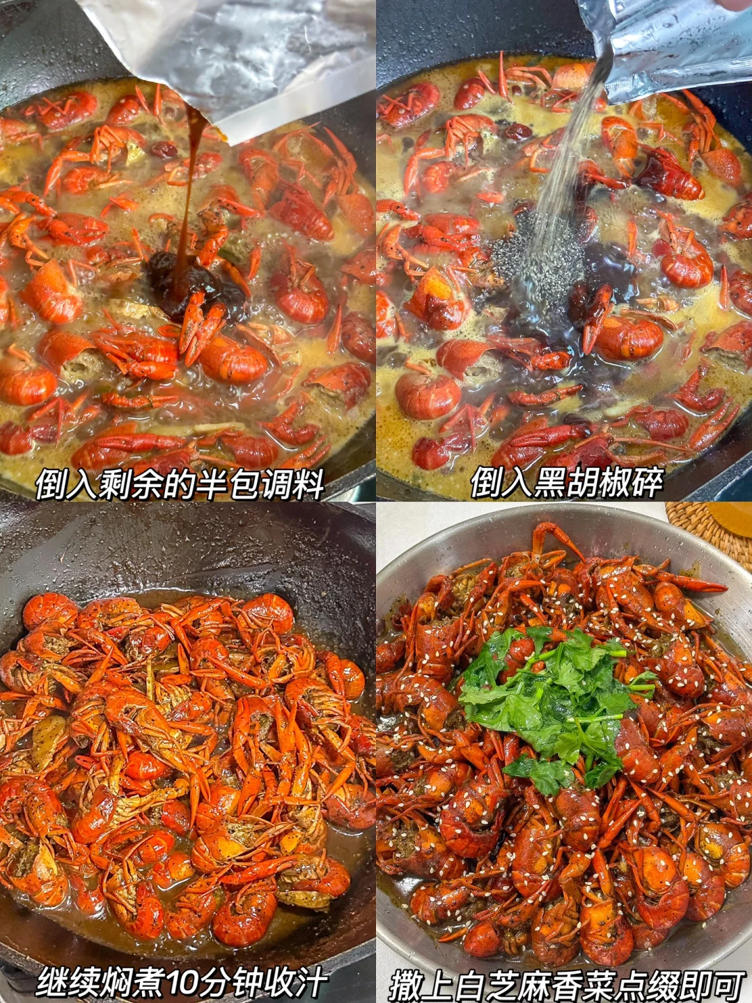 又到了小龙虾的季节了!一到龙虾季我们家是隔三差五的就烧上一份!之前烧过麻辣的、蒜蓉的、十三香的还有清蒸的!今天安排个黑椒味的!一口就上瘾了!而且做法简单0失败,分享给朋友们✌🏻 ㅤ 🌟准备食材🌟 小龙虾三斤 啤酒一瓶 葱姜蒜辣椒 香菜 调味料一包 🌟做法🌟 1️⃣小龙虾用牙刷刷干净,剪掉头部去掉沙包,尾部中间扯断,抽出虾线 2️⃣锅中加油,油热加入葱段、姜片、蒜片和辣椒炒香,倒入小龙虾翻炒至变红,加入半包调味料包 3️⃣加入一罐啤酒和水没过小龙虾,大火煮沸转小火焖煮20分钟左右 4️⃣倒入剩余的半包调料和黑胡椒碎,继续焖煮10分钟收汁撒上白芝麻香菜点缀即可 ㅤ 真的巨简单!做好的小龙虾超入味的,黑椒味带点微辣,真的好吃到吮指头!!喜欢加土豆黄瓜等配菜的也可以加,汤汁还可以拿来拌面条也是绝了vo~ ㅤ 一包料刚好做三斤小龙虾,真的要试试啊!手残党也可以烧出好吃的小龙虾!!完全不输外面饭店!还有冬阴功味的,等下一波小龙虾再去试试!! ㅤ