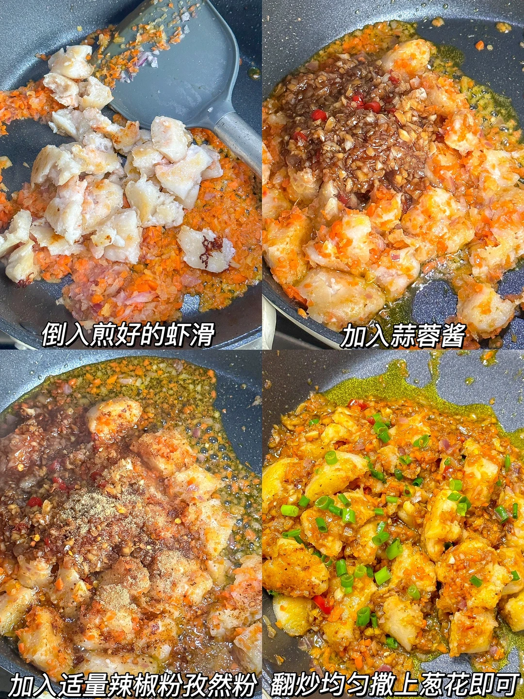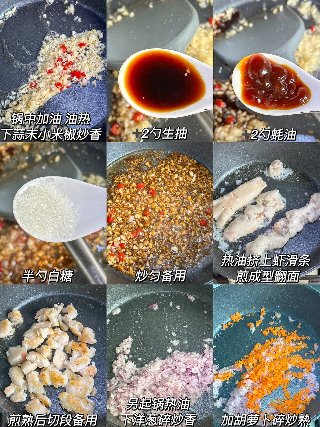 不用去夜市排长队也可以吃到铁板虾滑啦~不用铁板只要有锅就行!! ㅤ 🌟准备食材🌟 虾滑 洋葱碎 胡萝卜碎 蒜末 葱花 小米椒碎 ㅤ 🌟做法🌟 1️⃣先炒蒜蓉酱:锅中加油,油热下蒜末小米椒炒香➕2勺生抽➕2勺蚝油➕半勺白糖炒匀备用 2️⃣热油挤上虾滑条,煎成型后切段备用 3️⃣热油下洋葱碎炒香,放入胡萝卜碎炒香,倒入煎好的虾滑➕蒜蓉酱➕适量辣椒粉➕适量孜然粉翻炒均匀,撒上葱花即可