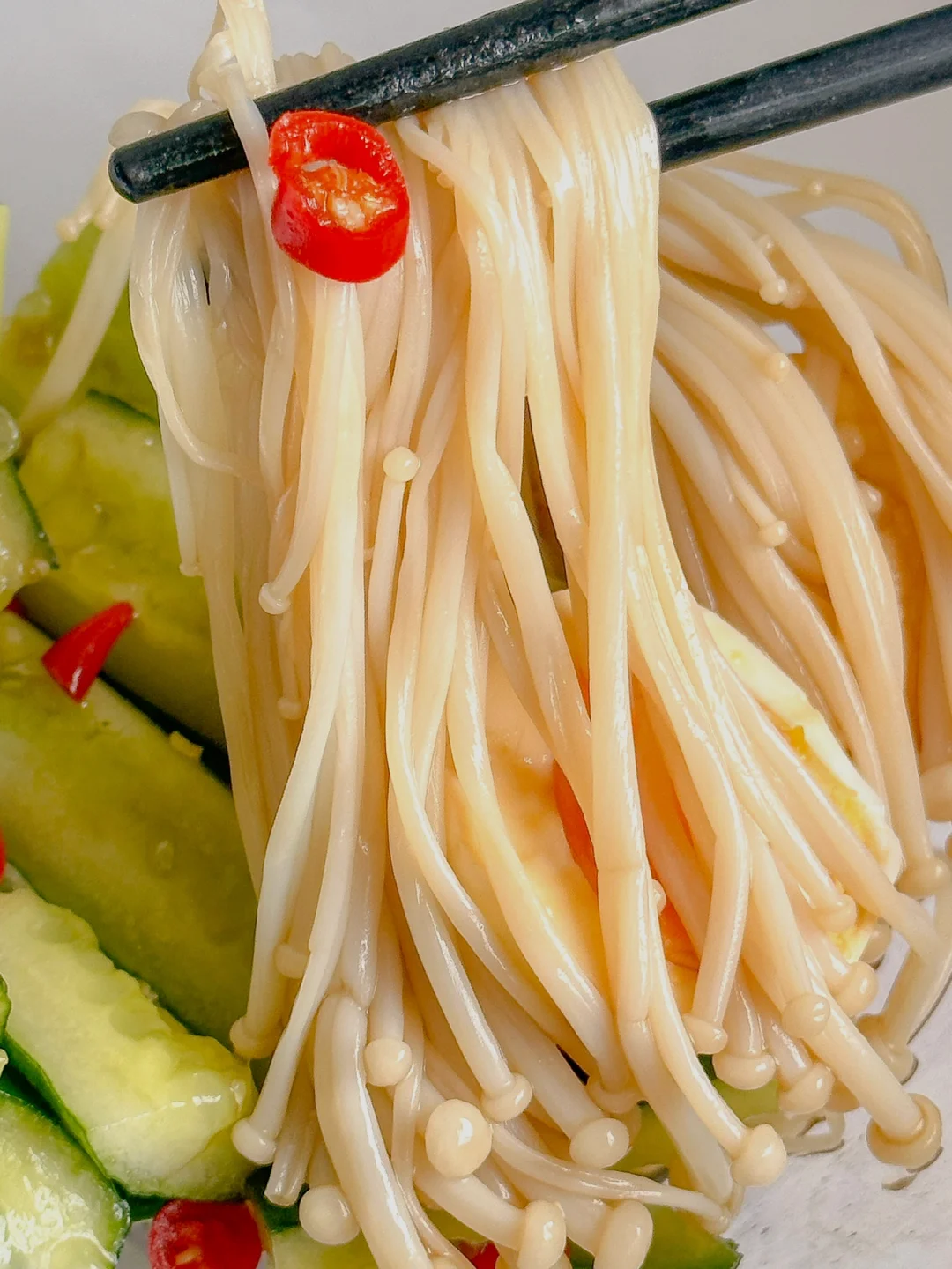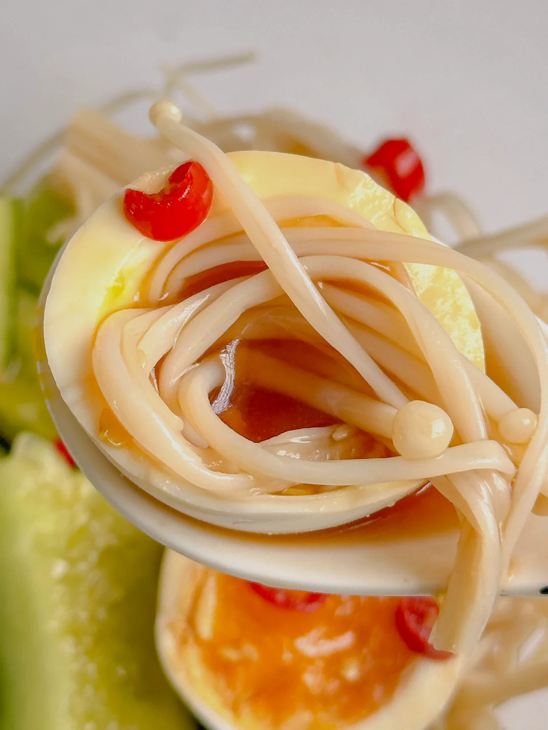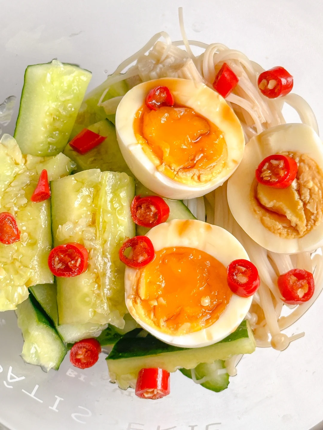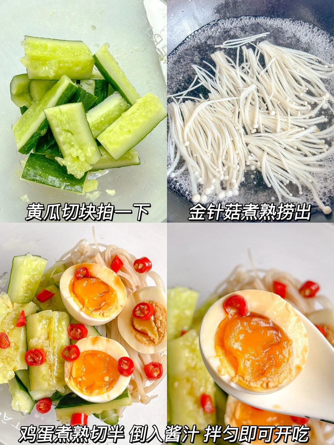 给大家分享低卡鸡蛋黄瓜金针菇!!今天倒腾冰箱只找出了这三样!!刚好可以安排上一顿减脂餐!流心蛋嫩滑可口!黄瓜爽脆解腻!金针菇酱香浓郁!!夏天到了赶快安排上!! ㅤ 🌟准备食材🌟 鸡蛋2颗 黄瓜半根 金针菇150g 🌟做法🌟 如图所示 ㅤ 做法巨简单!!夏天要到了! 减脂的姐妹快快一起吃起来!!!