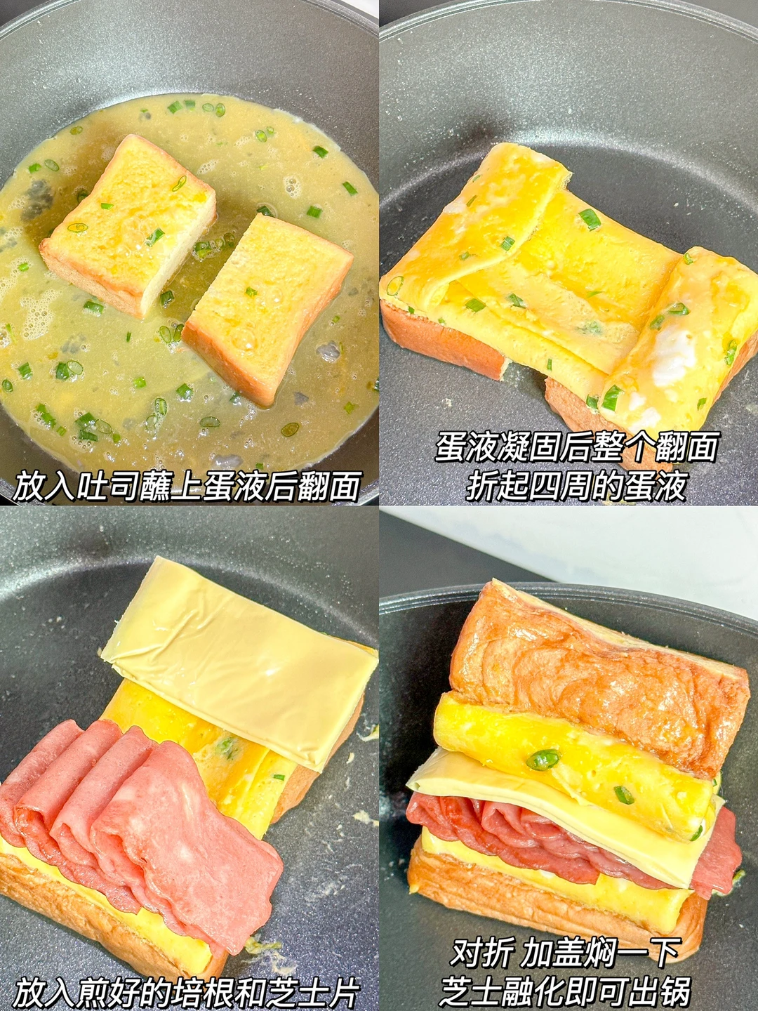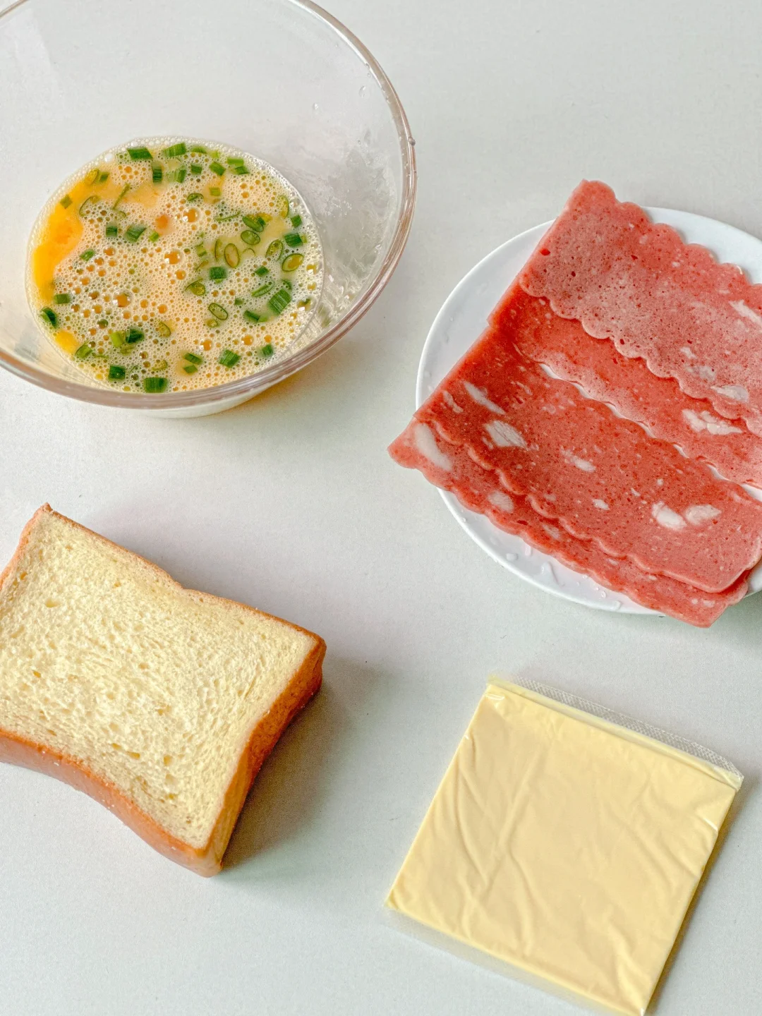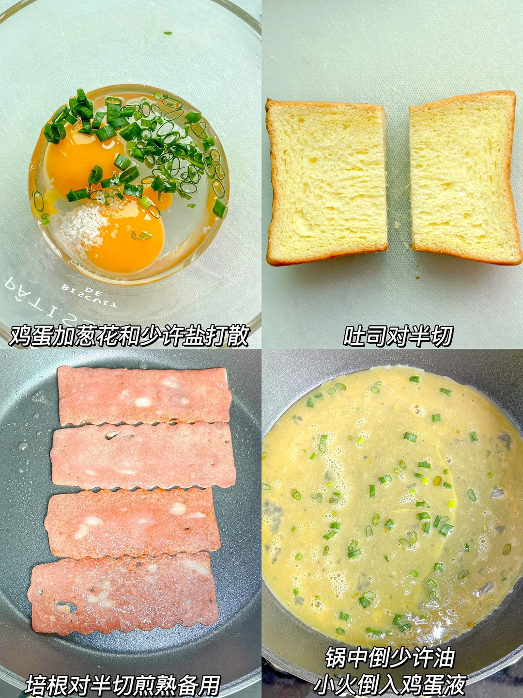 1️⃣吐司对半切,鸡蛋加葱花和少许盐打散,培根对半切煎熟备用