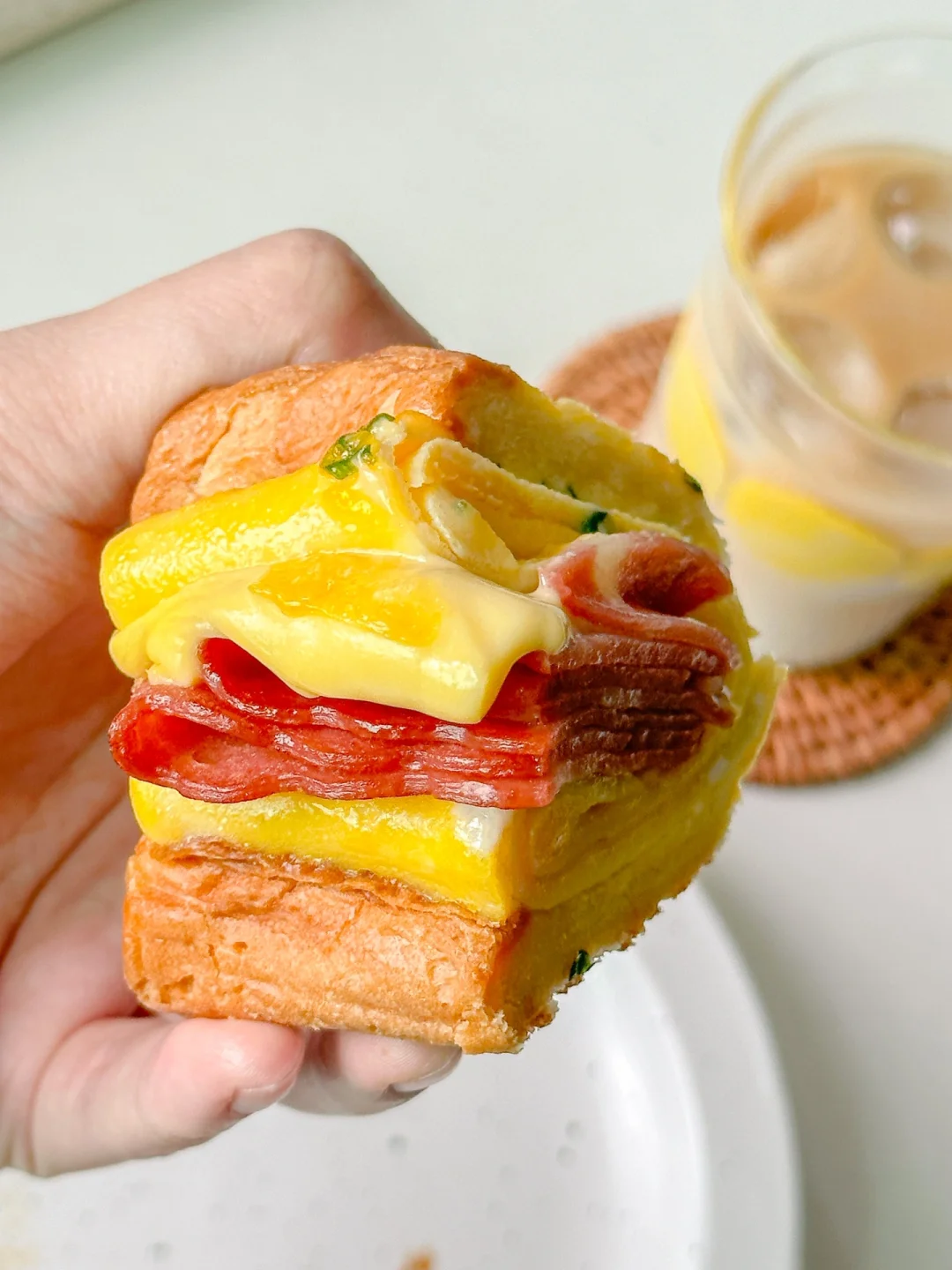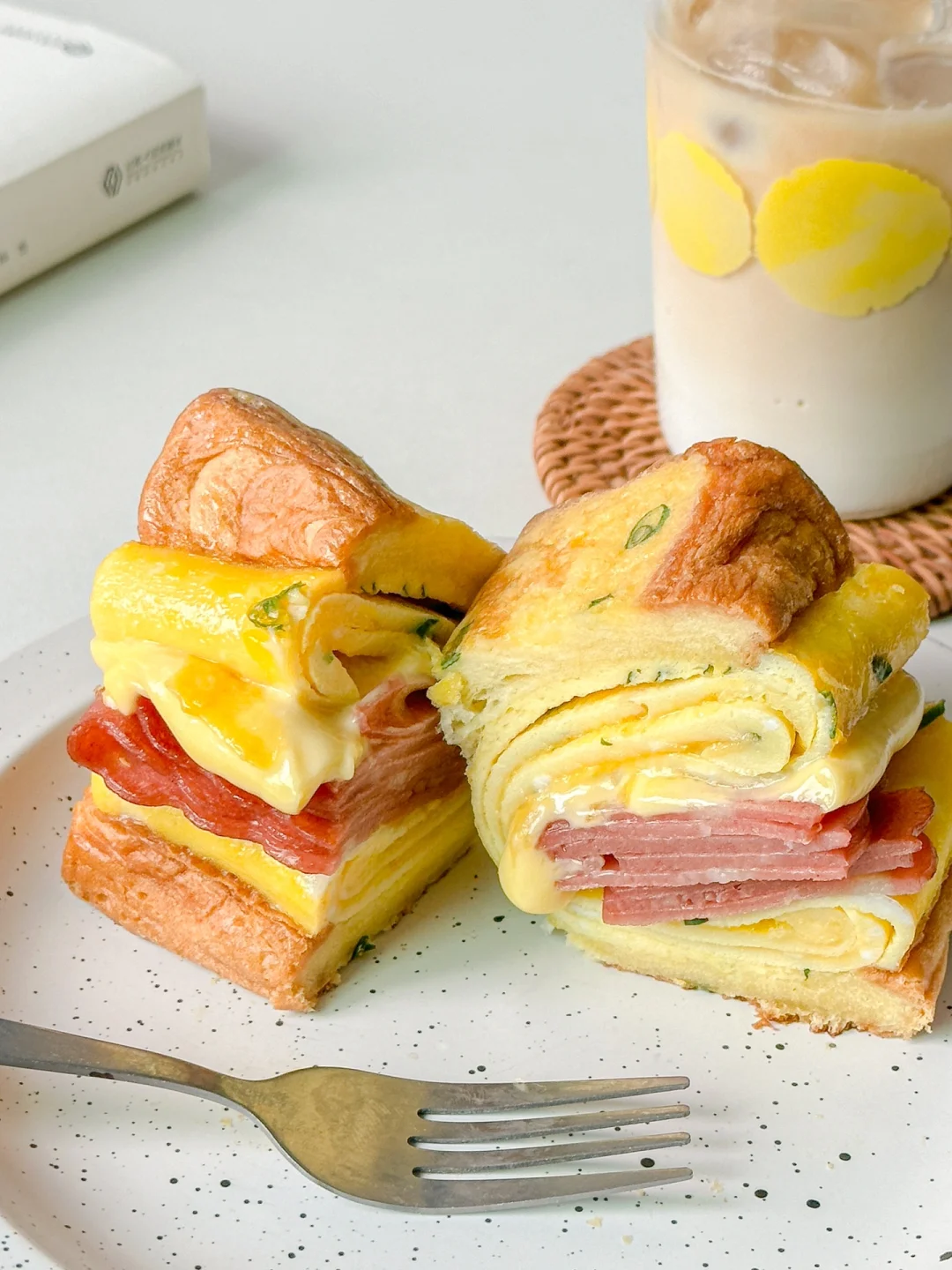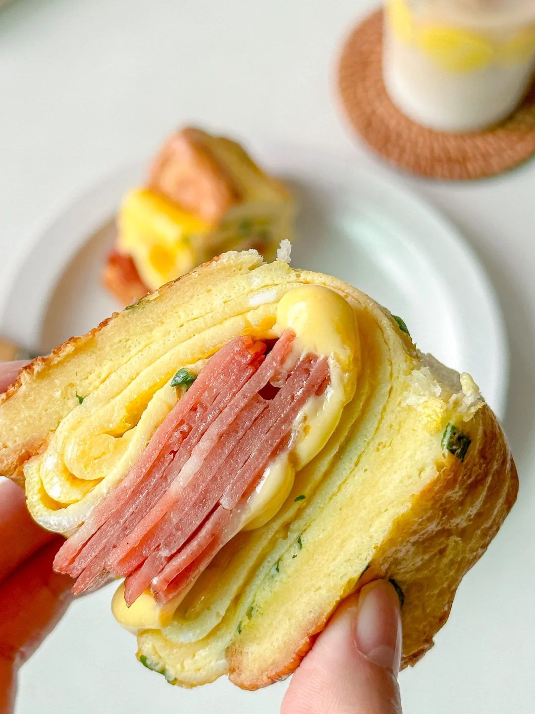 1️⃣吐司对半切,鸡蛋加葱花和少许盐打散,培根对半切煎熟备用