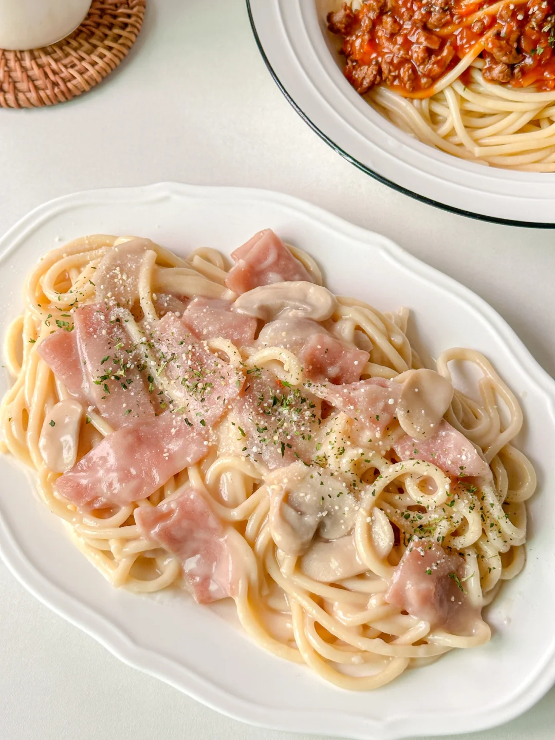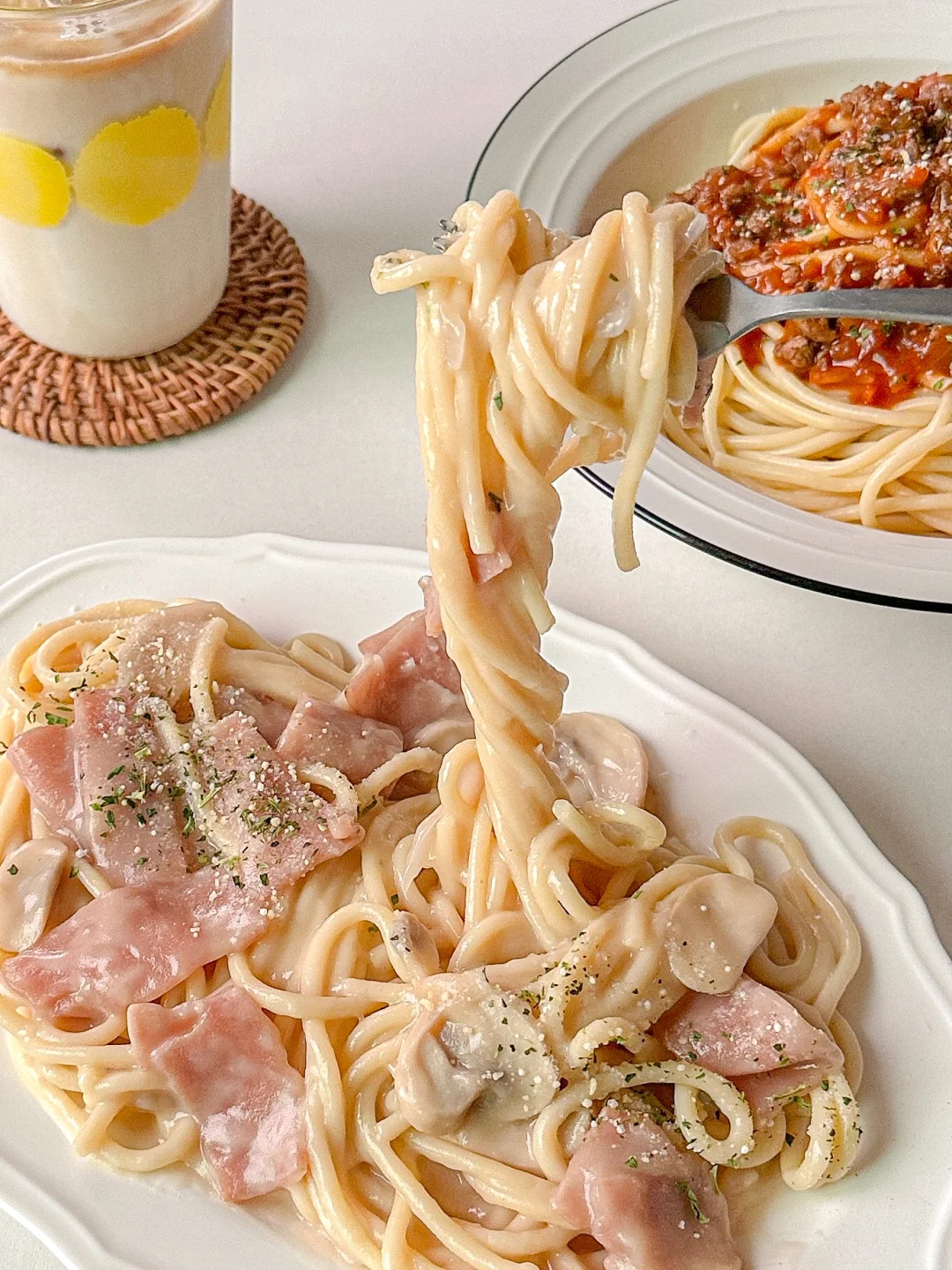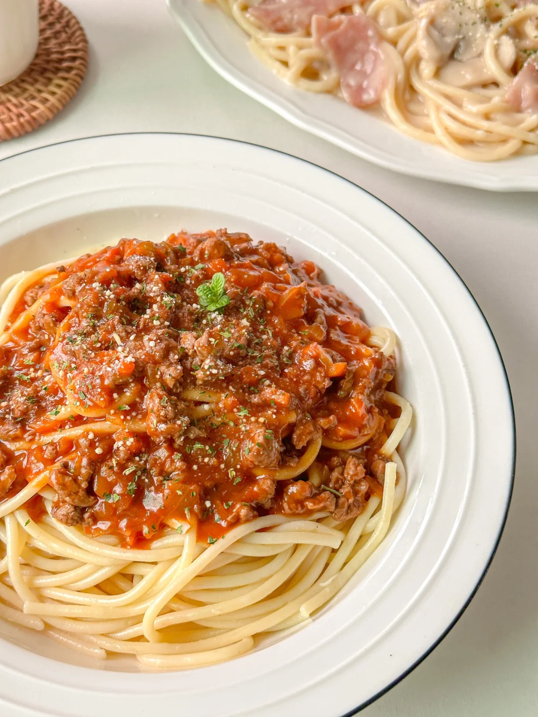 春节那几天去西餐厅吃意面都吃上瘾了,今天索性跟对象在家里安排上了!做了一份番茄红烩肉酱意面,一份西趣奶油意面,一人一份简单又好吃![飞吻R]