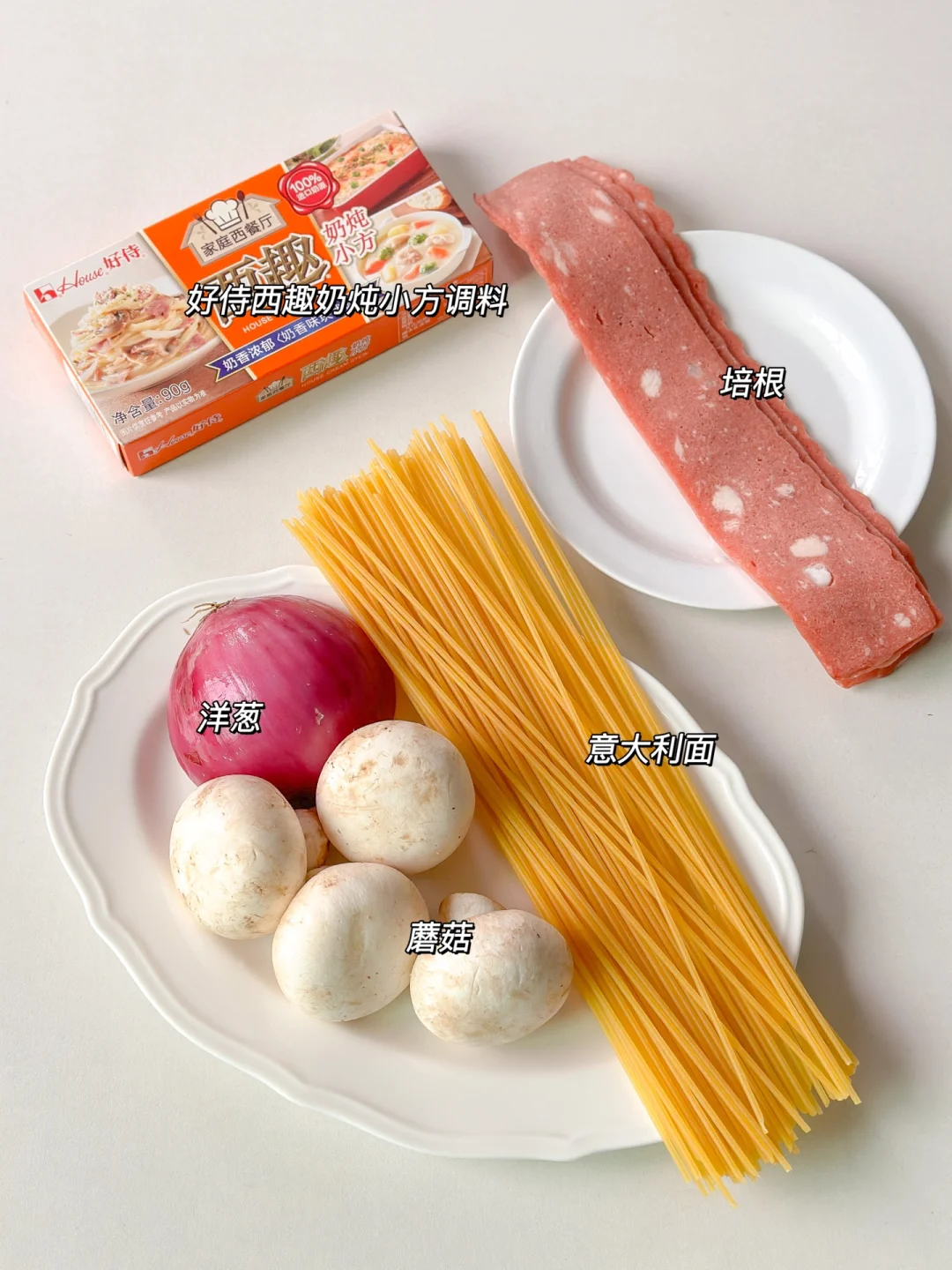 培根 蘑菇 意面 好侍西趣奶炖小方调料